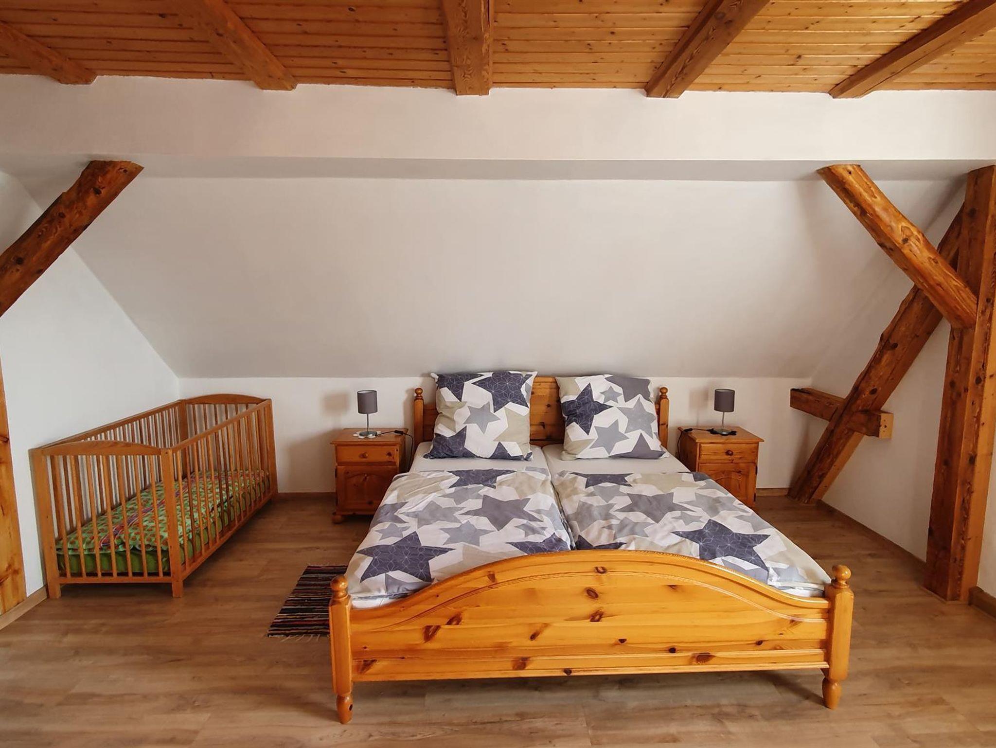 • Schlafzimmer mit Doppelbett und einem Kinderbett