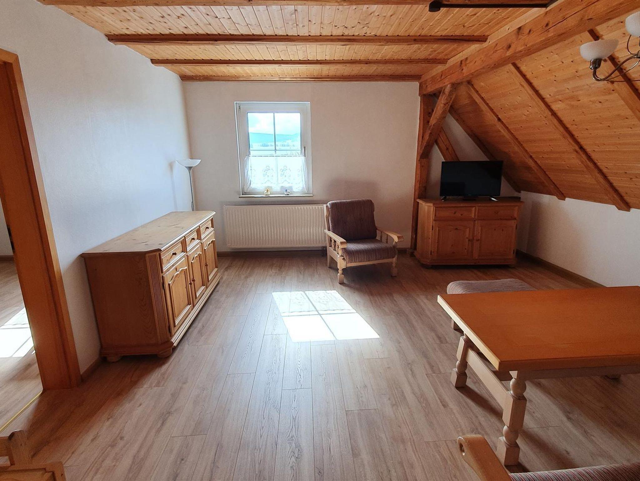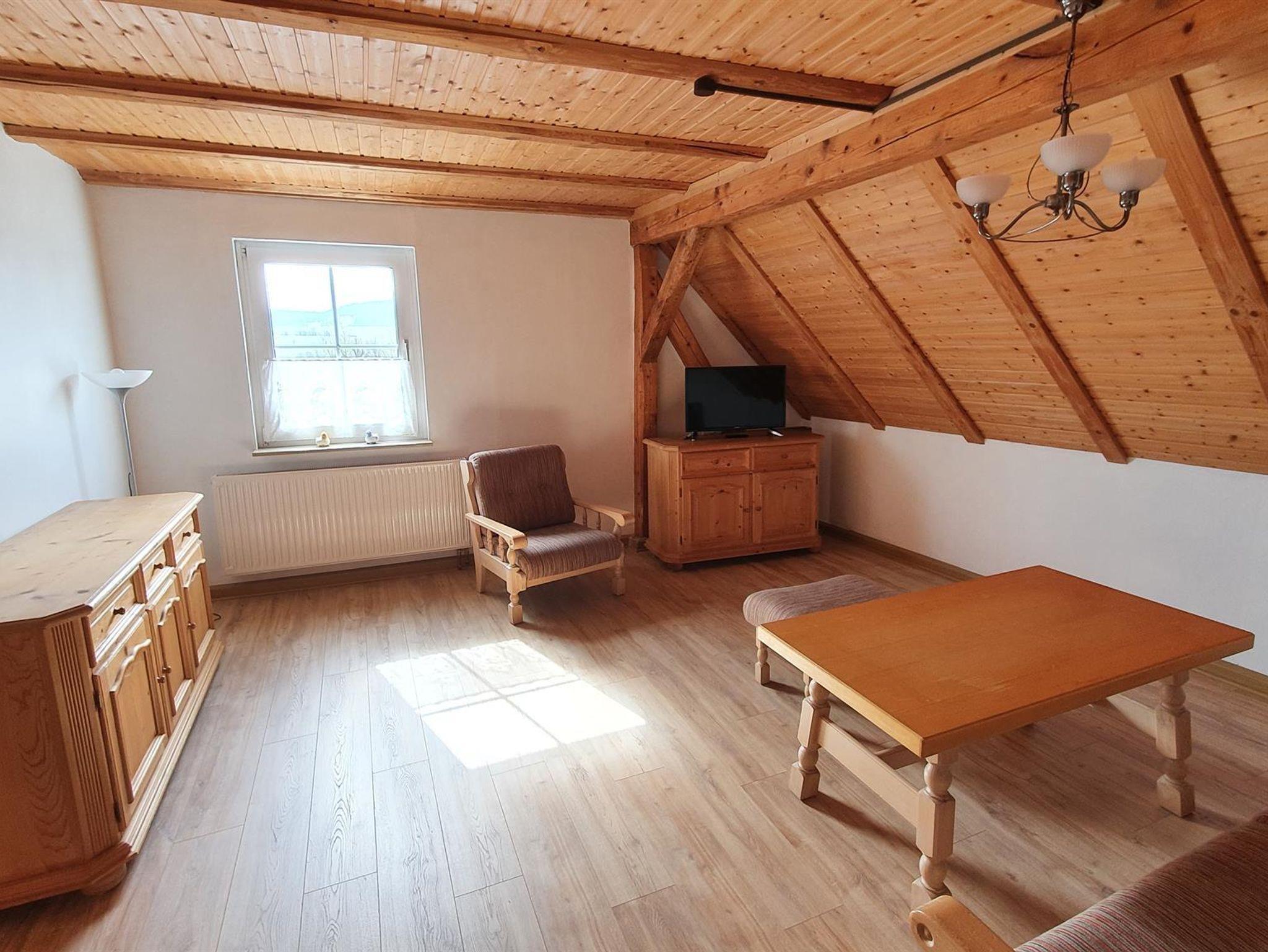 Der Igelbau ist sehr rustikal mit viel Holz gestaltet. Vom Wohnzimmer hat man einen tollen Blick in die Rhön.