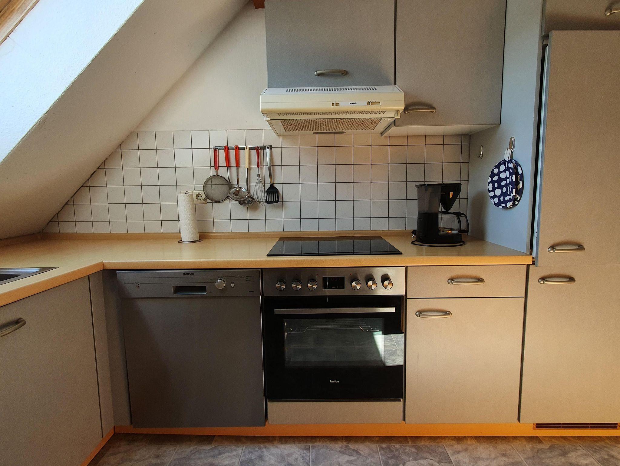 • Küche mit Kühlschrank, Ceran-Kochfeld, Backofen und Geschirrspüler