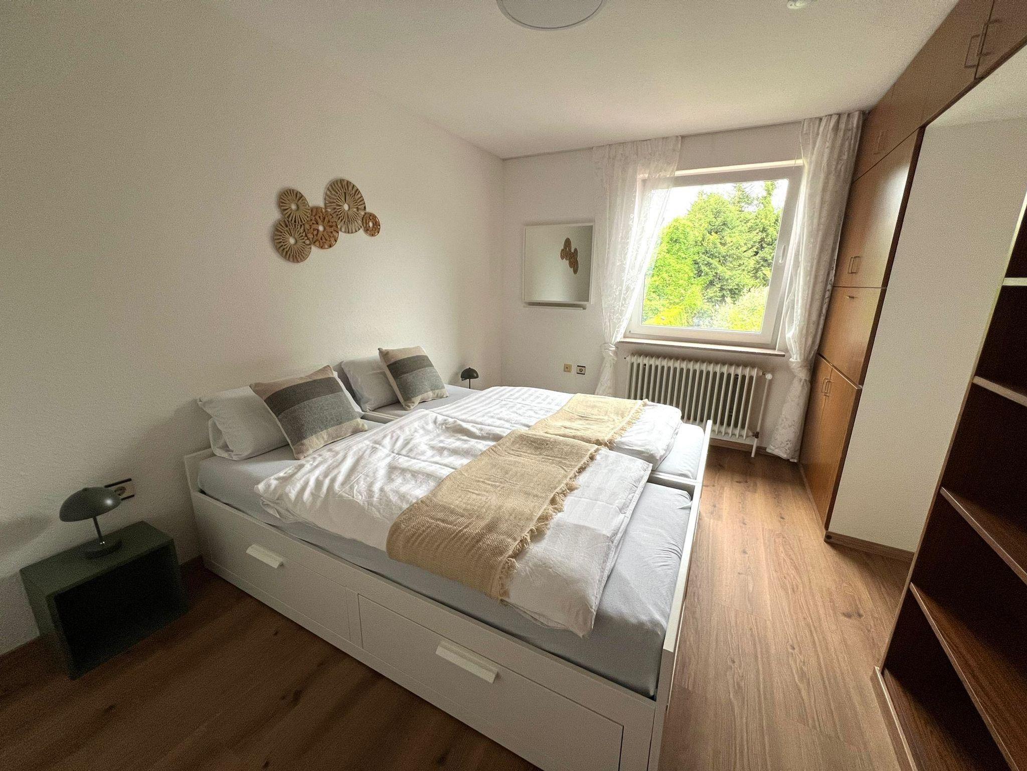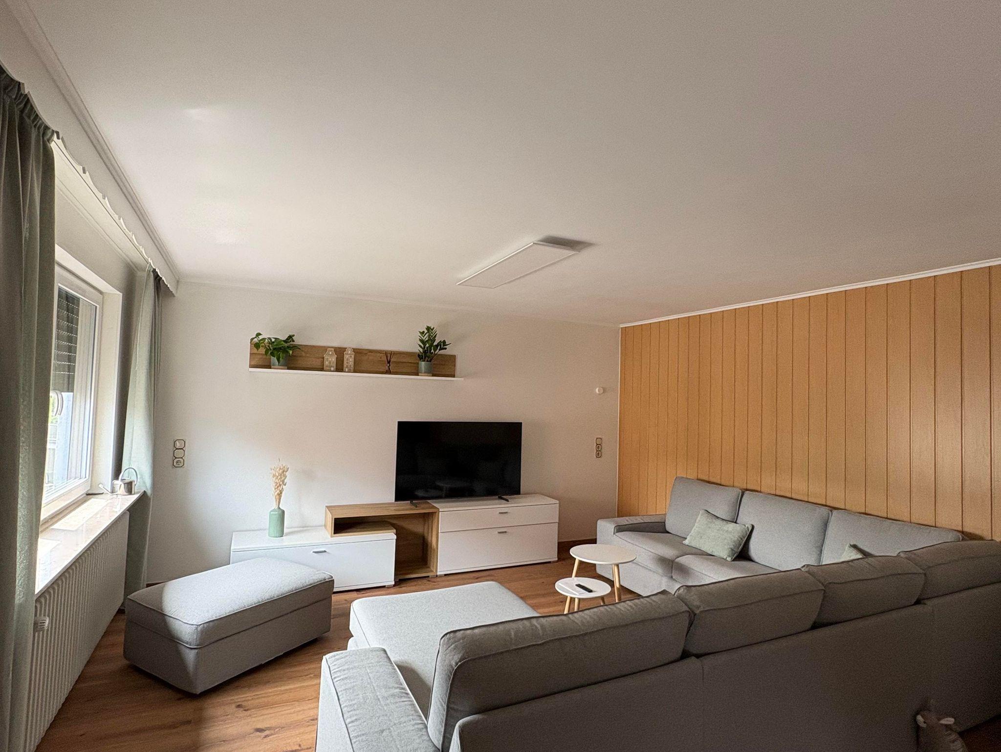 Dieses großzügige Apartment empfängt Sie mit einem separaten Eingang und einem einladenden Vorraum. Es verfügt über ein gemütliches Schlafzimmer mit Doppelbett sowie über ein weiteres, separat gelegenes Doppelzimmer mit Kleiderschrank, Nachttischlampen und viel Tageslicht. Das Herzstück der Unterkunft ist die helle, voll ausgestattete Wohnküche mit großzügigem Esstisch für bis zu sechs Personen – ideal für gemeinsame Mahlzeiten. Zur Ausstattung gehören Kaffeemaschine, Wasserkocher, Mikrowelle, Geschirrspüler und alle notwendigen Küchenutensilien für einen angenehmen Aufenthalt. Das Wohnzimmer ist großzügig gestaltet, mit einem großen Sofa, Flachbild-TV und breiten Fenstern für viel Licht – der Boden ist bewusst ohne Teppich gestaltet. Zwei moderne Badezimmer bieten maximalen Komfort: Eines ist mit einer großen begehbaren Dusche mit Haltegriffen, Waschbecken und WC ausgestattet – ideal für Gäste mit eingeschränkter Mobilität. Das zweite Badezimmer verfügt über eine Badewanne, zwei Waschbecken, ein WC, ein Bidet, einen großen Spiegel, Kosmetikspiegel sowie einen Handtuchtrockner. Die gesamte Unterkunft ist mit Heizkörpern ausgestattet und bietet viel Platz zum Wohlfühlen – perfekt für Familien, Paare oder Gäste, die Wert auf Komfort legen.