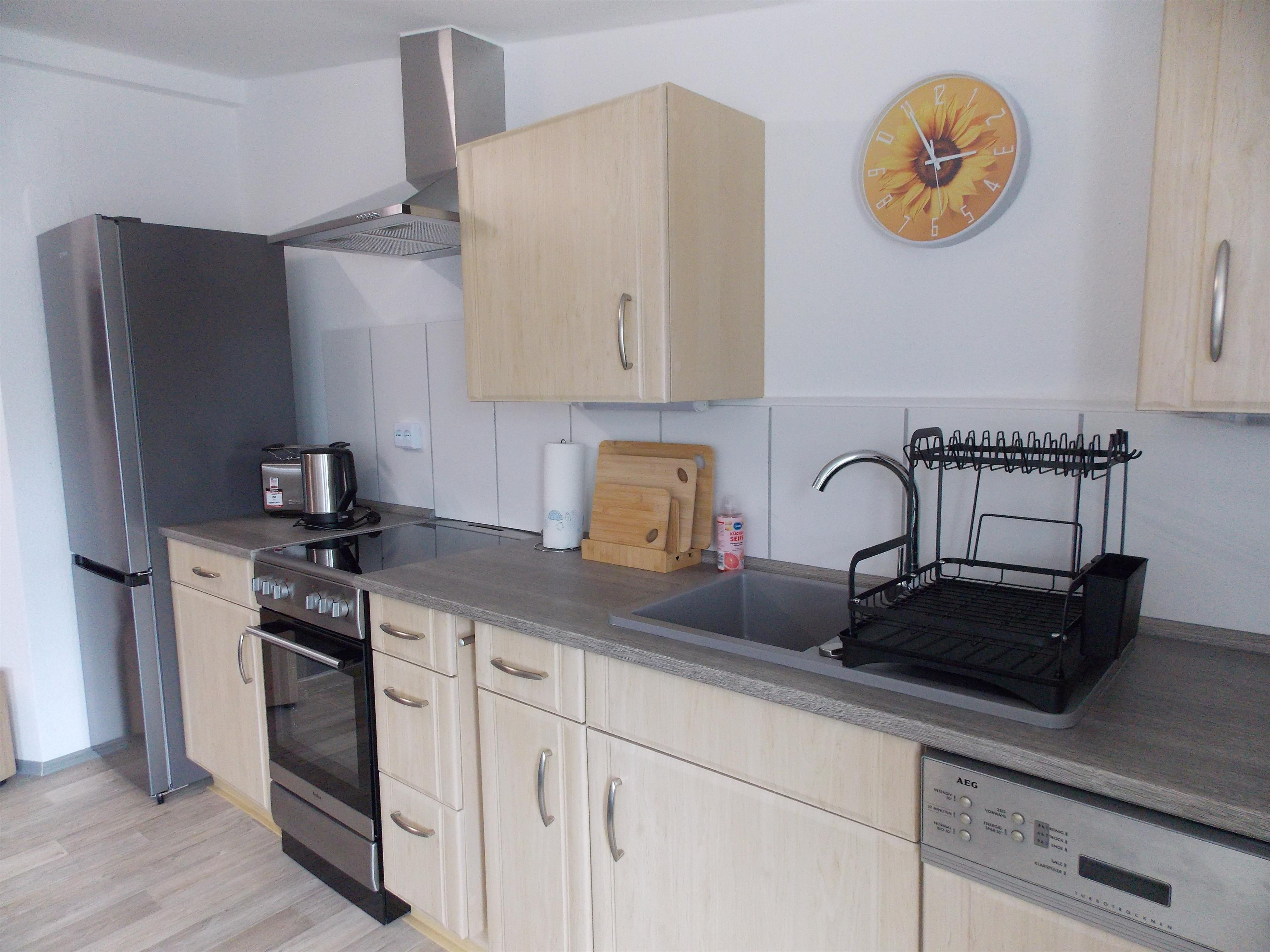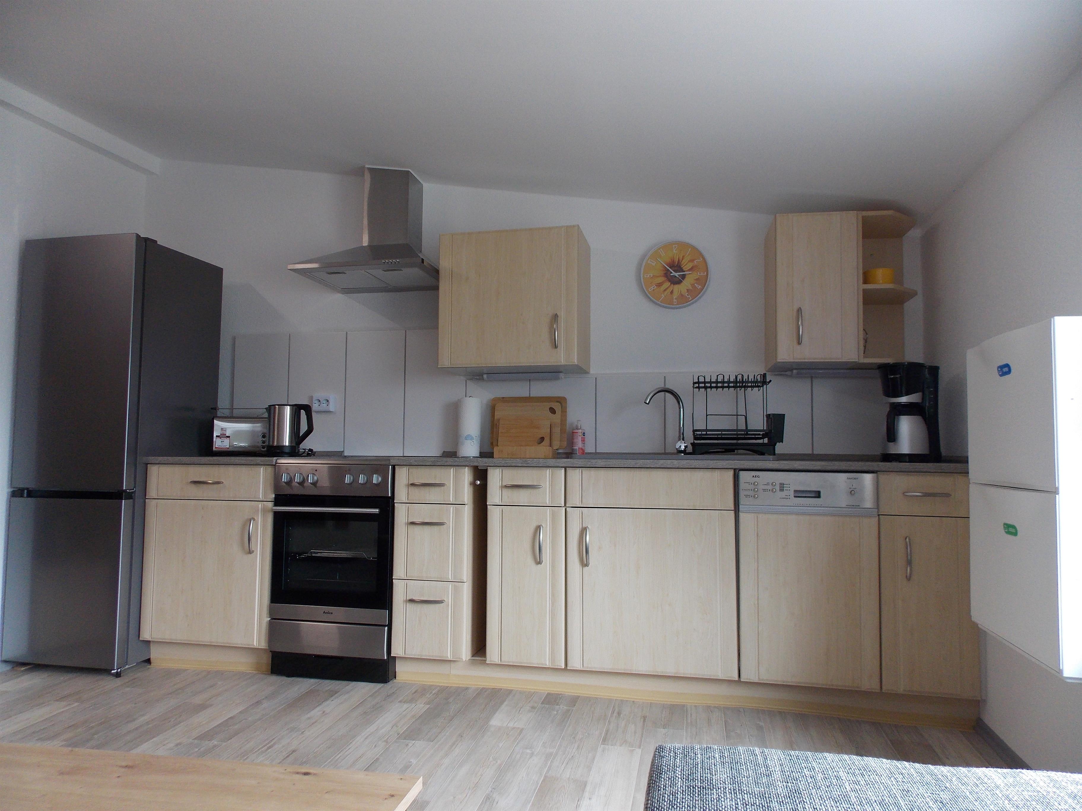 - Moderne Küchenzeile mit Kühl-/Gefrierkombination, Dunstabzugshaube, Kaffeemaschine, Toaster, Wasserkocher, Einbauspüle, E-Herd, Geschirrspüler, Dinge für den täglichen Hausgebrauch