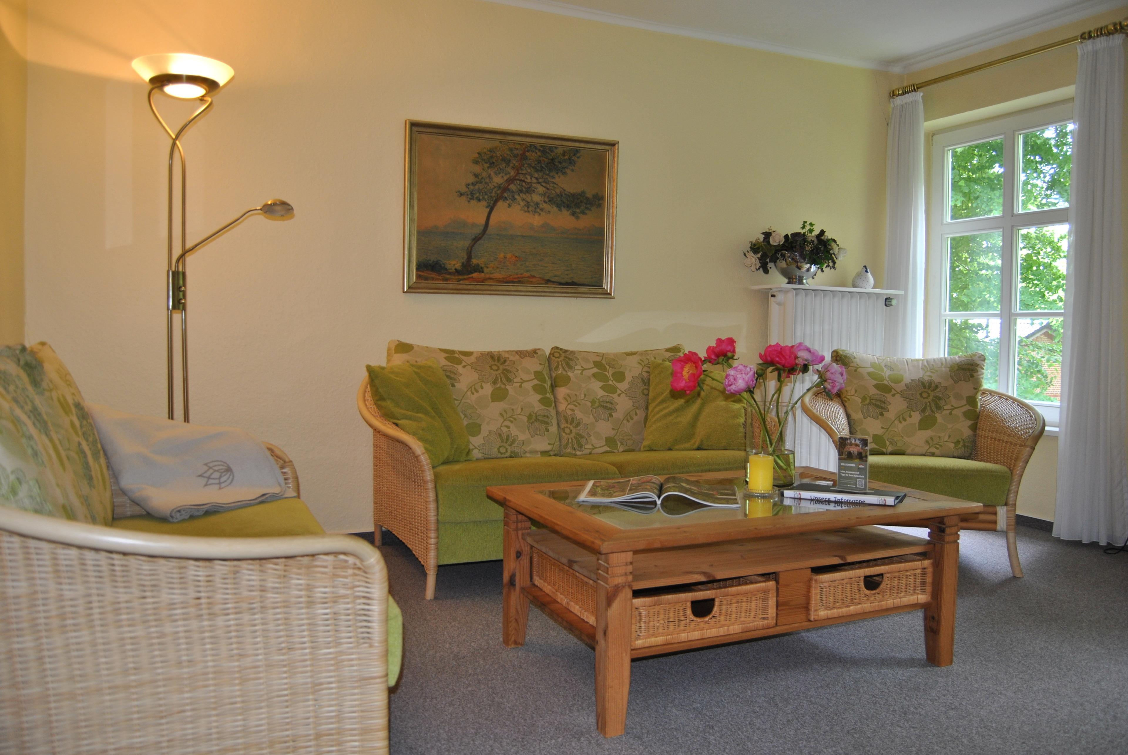 Vom geräumigen Flur aus erreicht man zudem das helle Duschbad, als auch das gemütliche Wohnzimmer mit bequemer Sitzgruppe Blick ins Grüne.