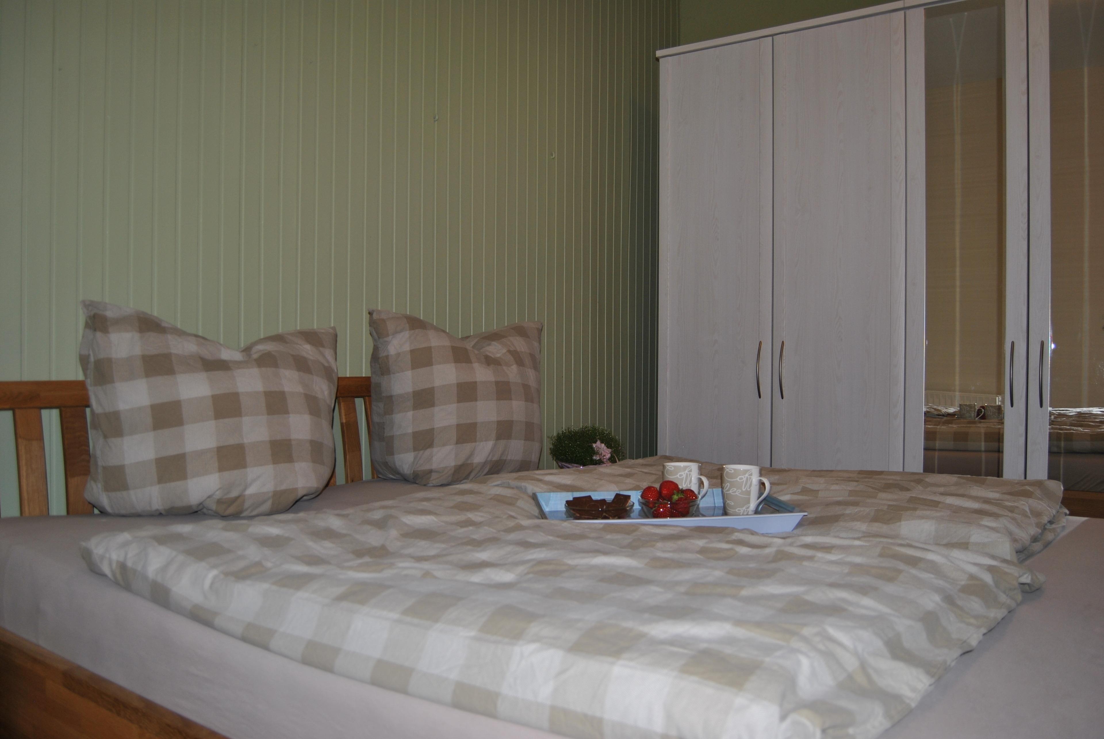 Zusätzlich verfügt das Ferienhaus über zwei Schlafzimmer. Eines ist mit einem großen Doppelbett, das andere mit zwei Einzelbetten eingerichtet.