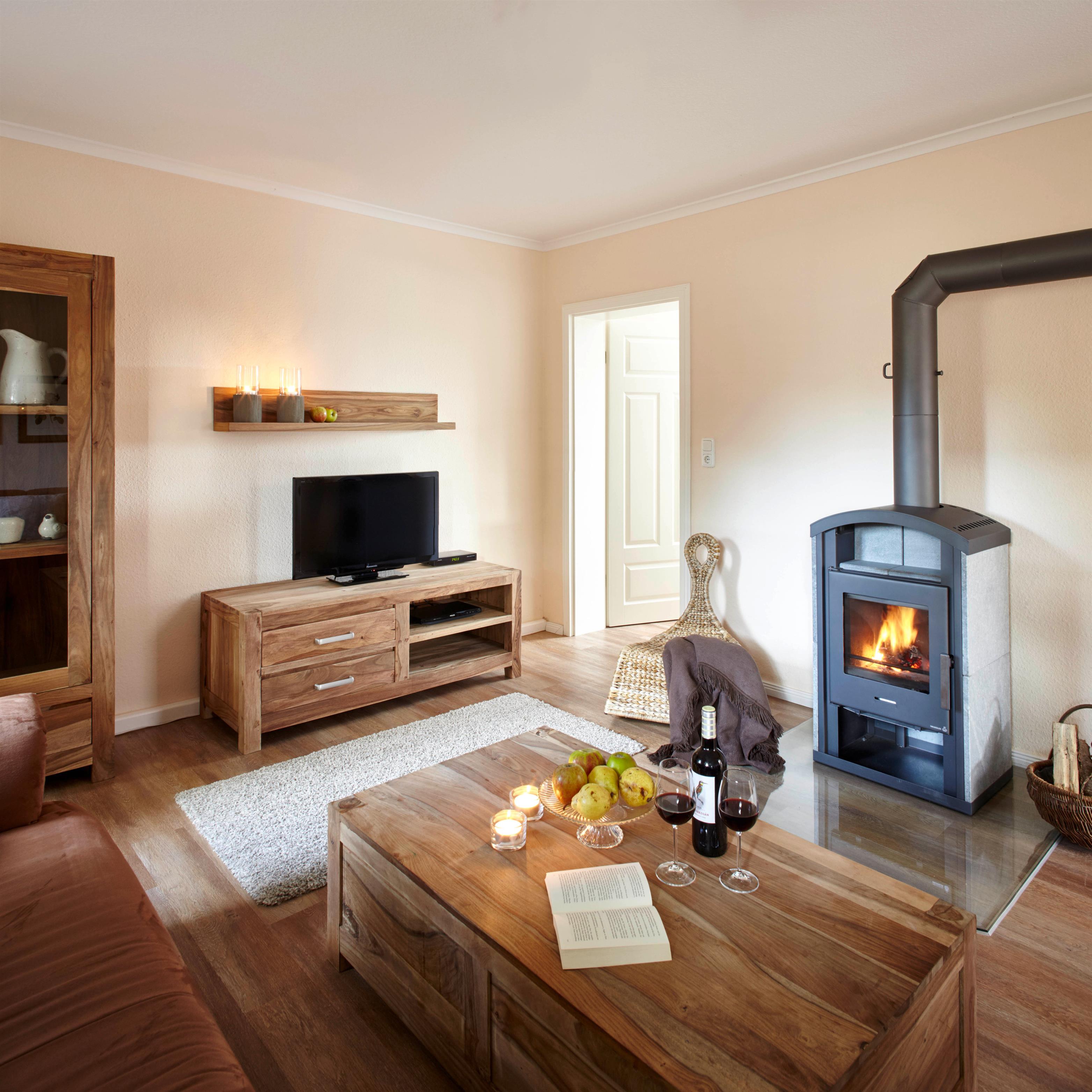 Das gemütliche Wohnzimmer ist ausgestattet mit einer schönen Sitzgruppe sowie einem Kaminofen für gemütliche Abende.