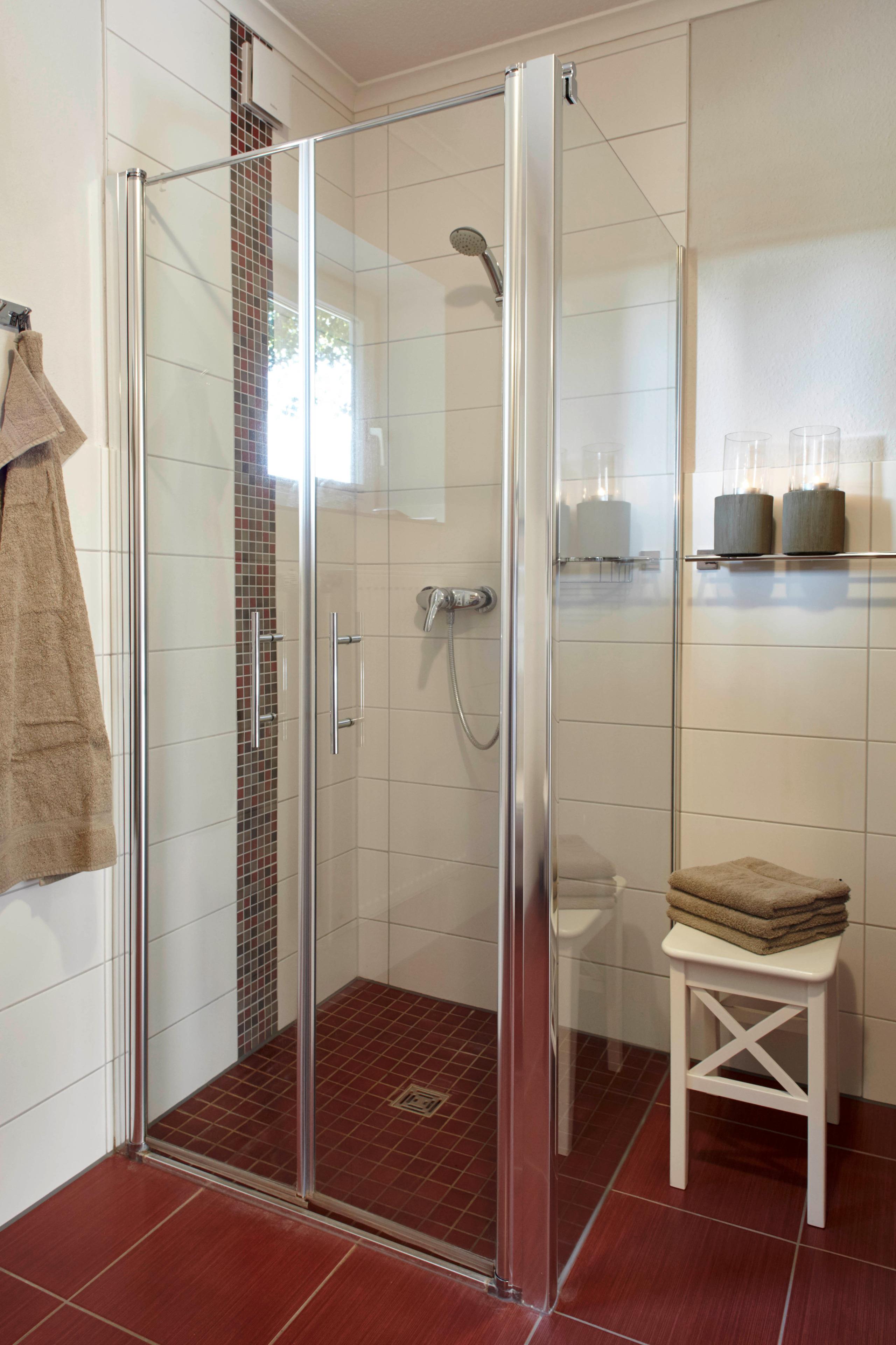 Ein Duschbad mit viel Platz und bodentiefer Dusche gehören außerdem zur Wohnungsausstattung.
