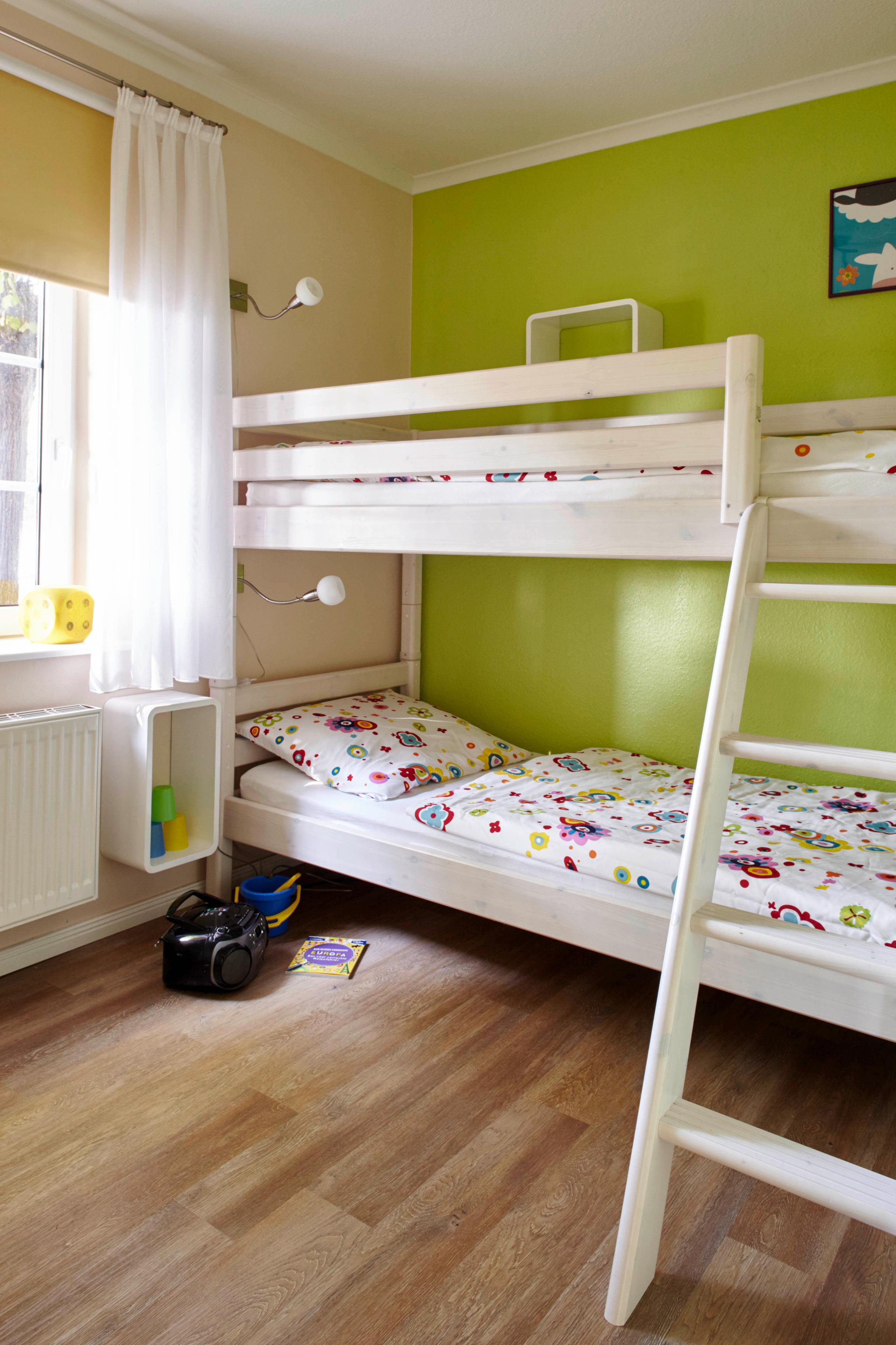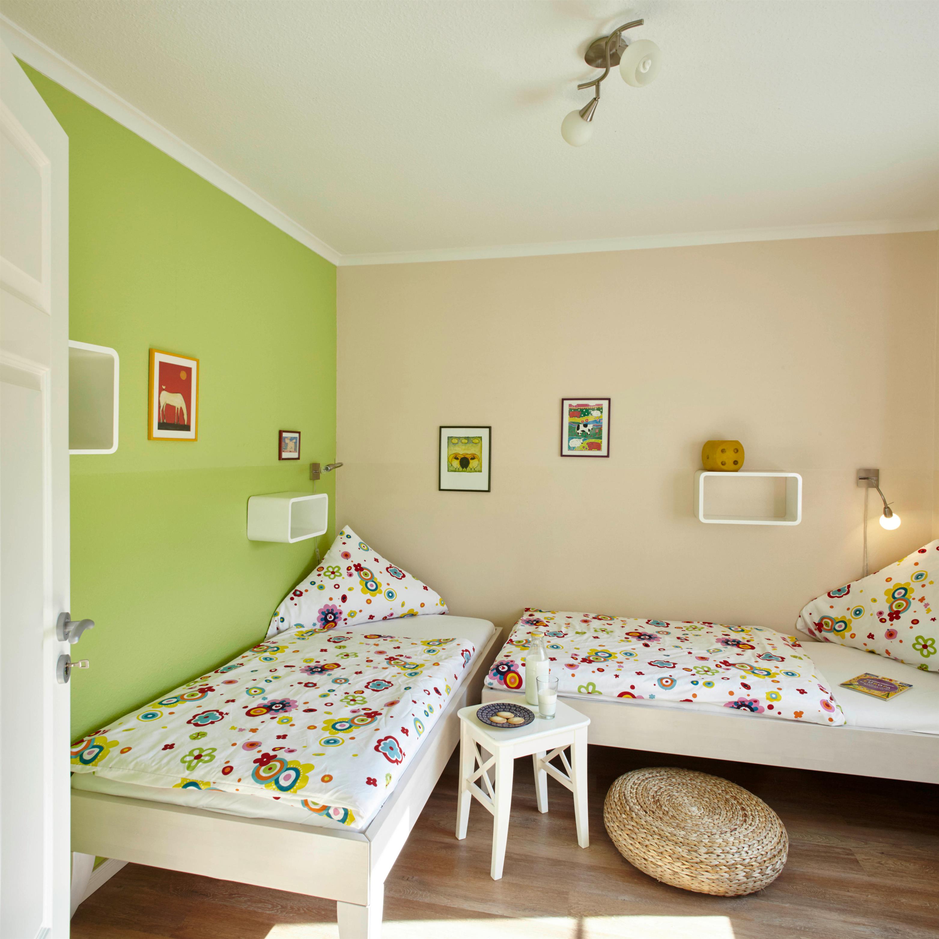 Bis zu sechs Personen finden in den drei Schlafzimmern des Ferienhauses Platz. Die Schlafzimmer haben zwei Einzelbetten, ein Doppel- bzw. ein Etagenbett.