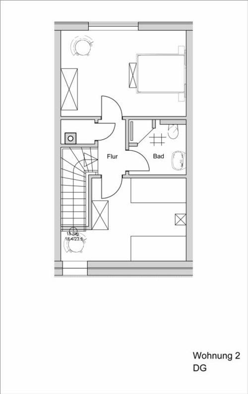 Im Obergeschoss liegen die beiden Schlafräume. Diese sind mit einem Doppel- bzw. zwei Einzelbetten ausgestattet. Zusätzlich befindet sich in diesem Bereich das zweite Duschbad.
