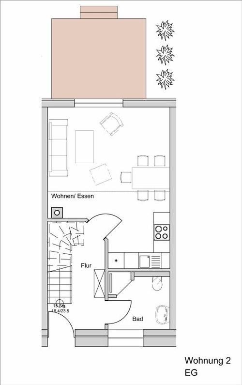 Die Wohnung teilt sich in zwei Bereiche auf. Im unteren Stockwerk befindet sich eines der zwei Duschbäder sowie der gemütliche Wohn- und Essbereich. Neben einer vollausgestatteten Küchenzeile und Essecke, gehört eine gemütliche Sitzgruppe zur Einrichtung. Ein Kaminofen, als auch die vom Wohnbereich zu erreichende Terrasse, runden das Wohlfühl-Angebot ab.