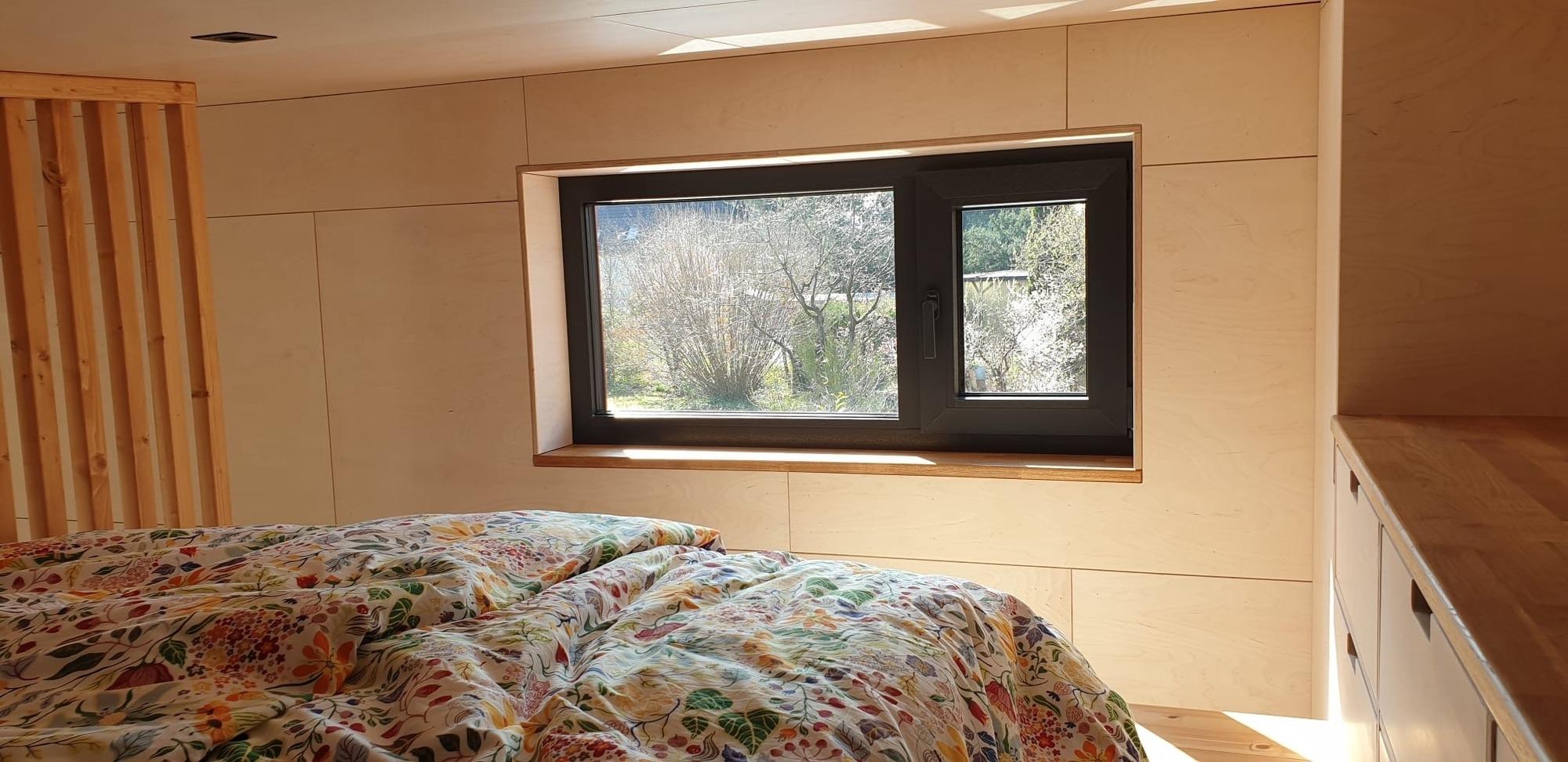 Mit viel Liebe zum Detail stilvoll eingerichtet, bietet das Tiny House auf kompakter Fläche ein durchdachtes Wohnkonzept für bis zu zwei Personen. Große Fenster und ein gemütlicher Wintergarten schaffen eine lichtdurchflutete Atmosphäre und eröffnen den Blick ins Grüne.