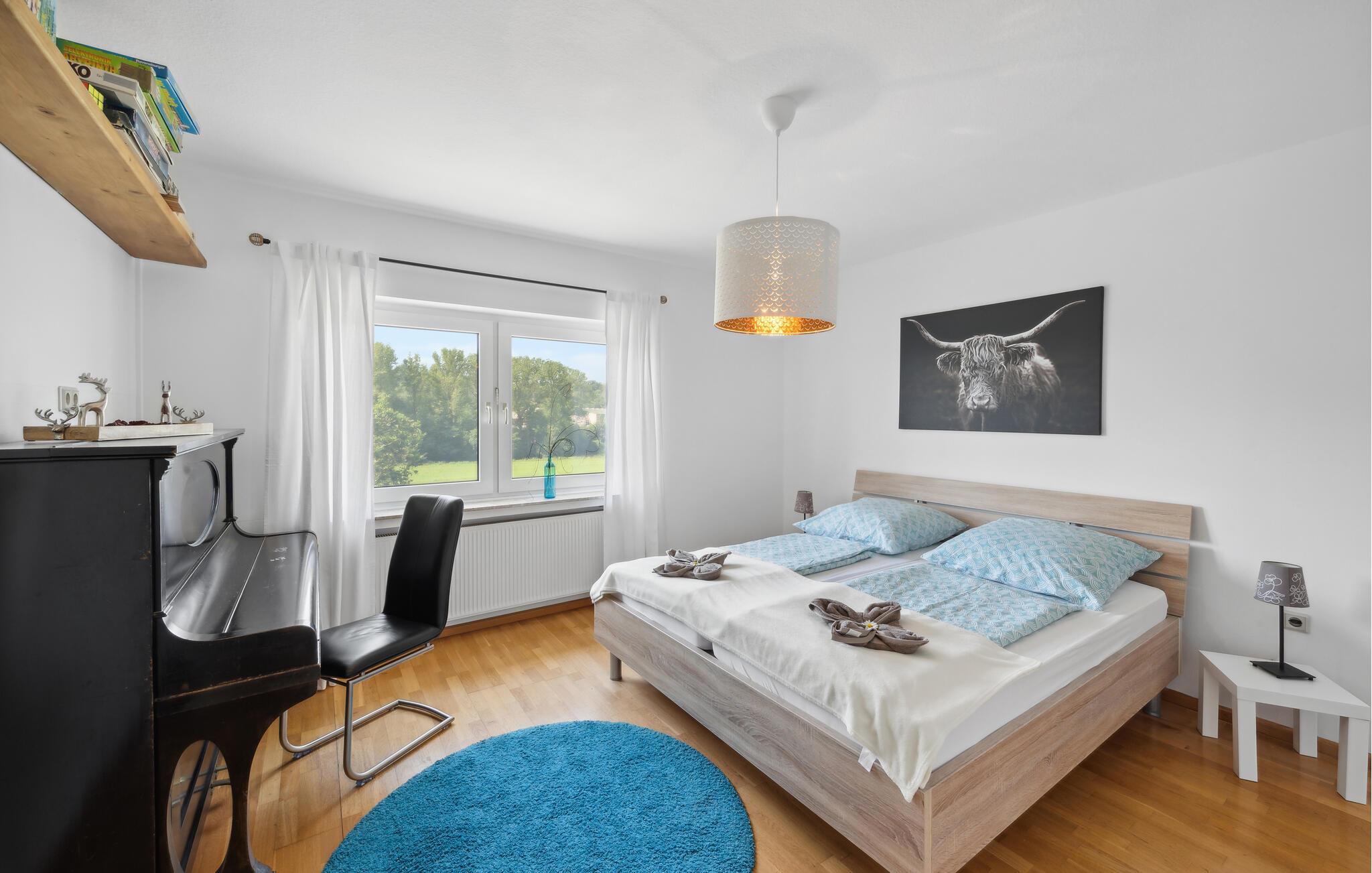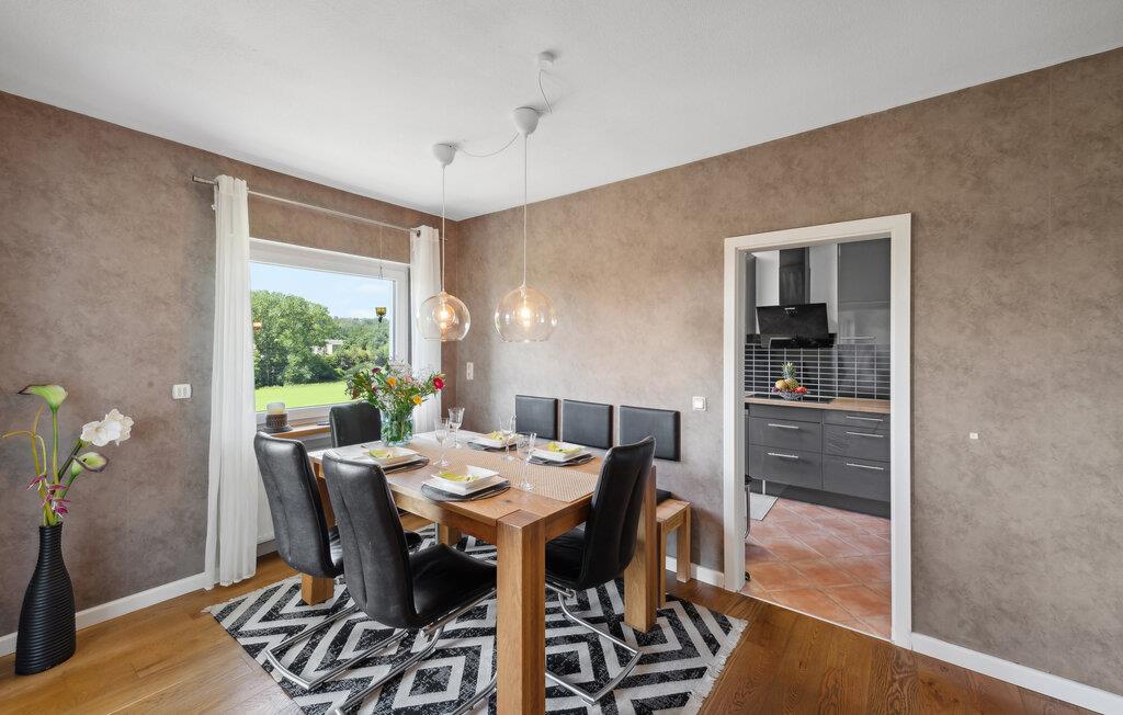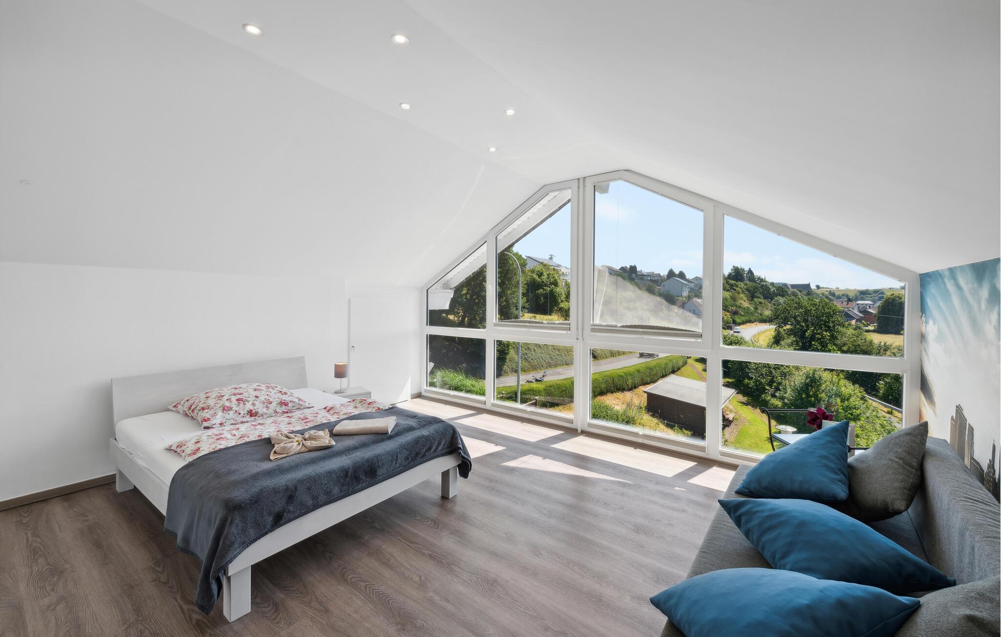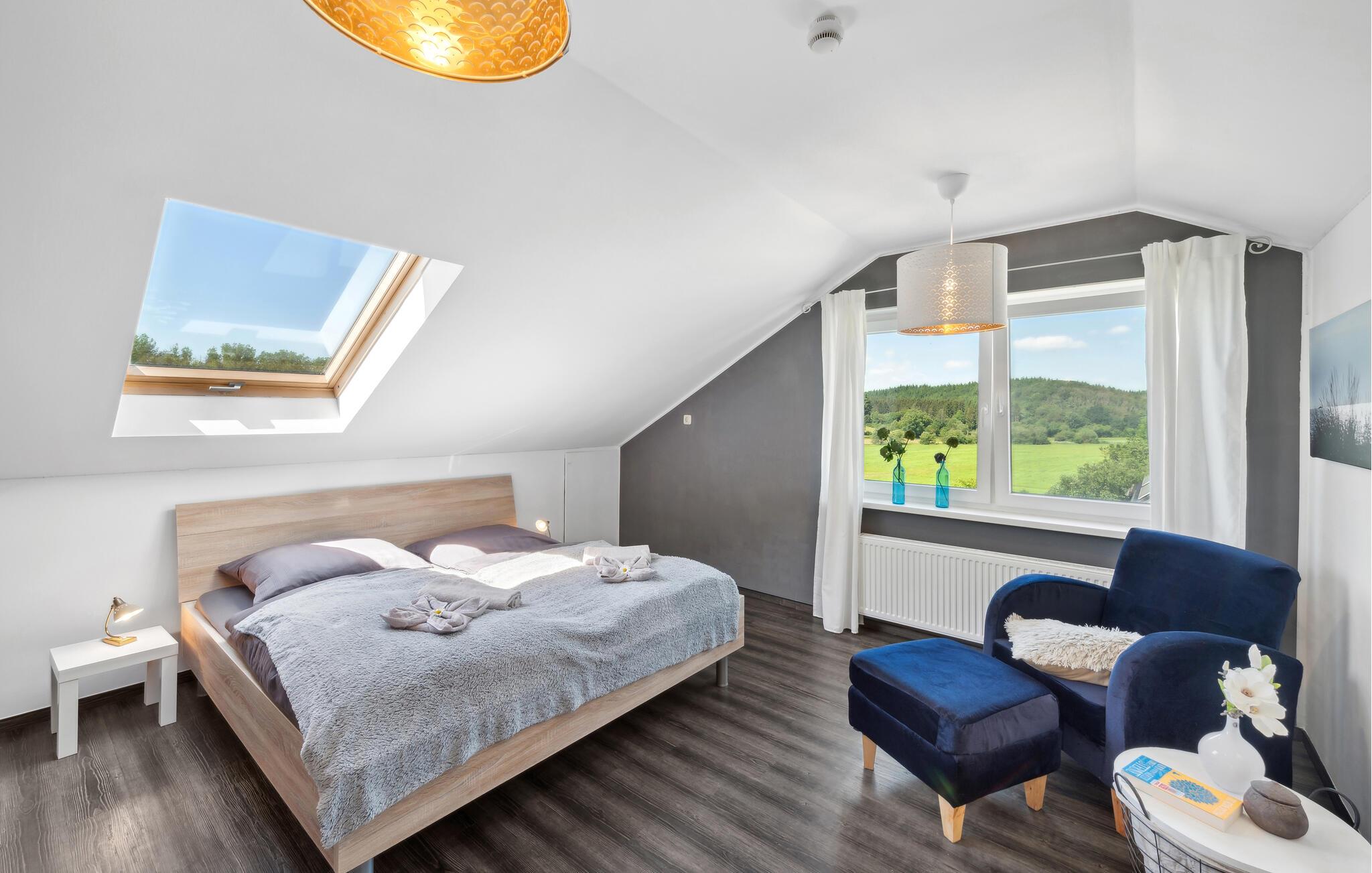 Denne rummelige og komfortable ferielejlighed i Gillenfeld lægger op til en afslappende ferie midt i den idylliske Eifel. Den lyse indretning, kombineret med moderne design, har en hyggelig atmosfære, hvor I straks vil føle jer hjemme. Nyd den store mængde plads og find jeres yndlingssted, uanset om I ser en film i stuen, leger ved spisebordet eller vågner op i sengen med panoramaudsigt over landskabet.