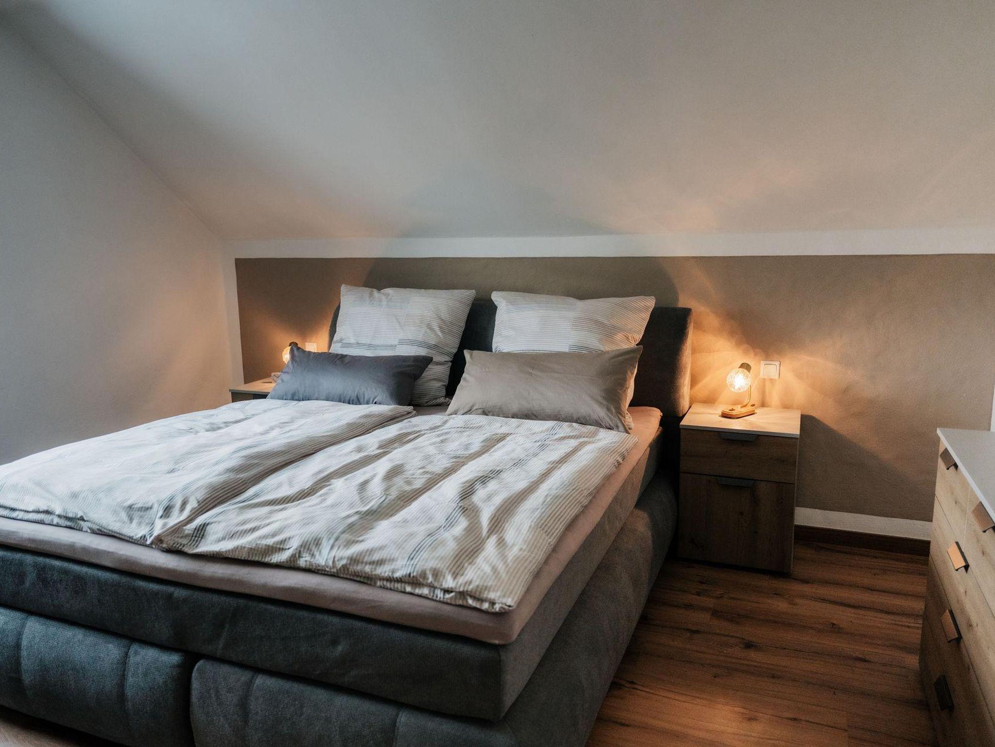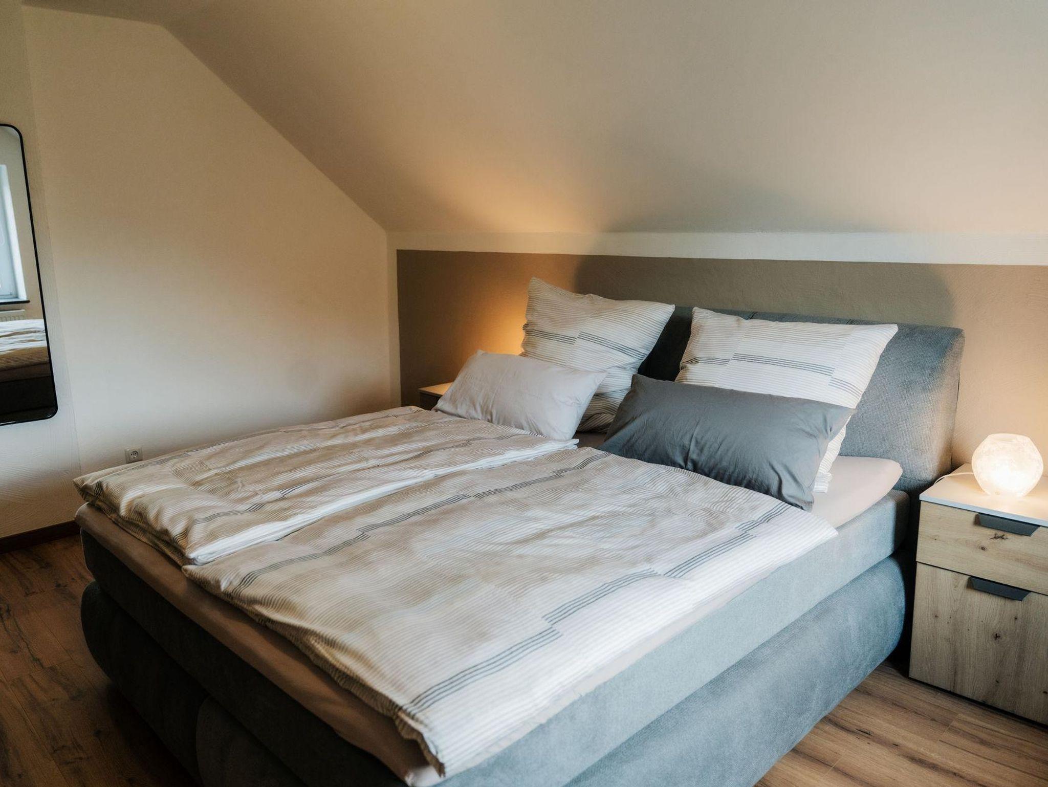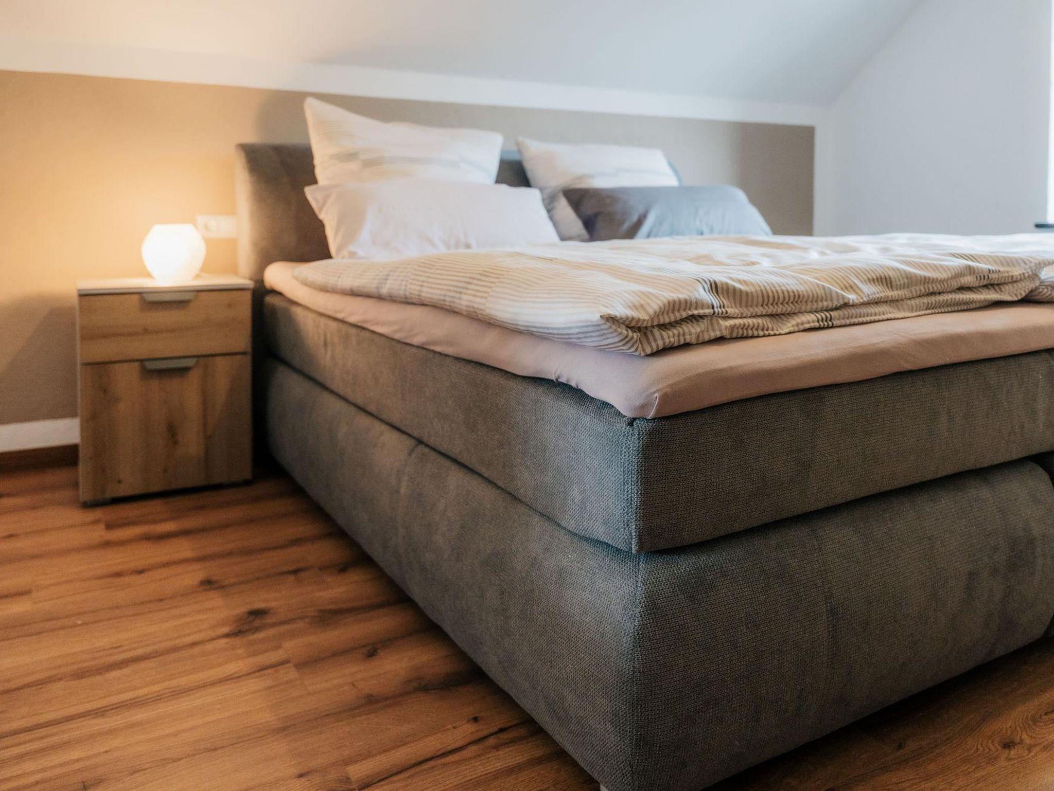 Auf der 1. Etage befinden sich, neben dem Bad, die zwei Schlafzimmer. Diese verfügen über zwei gemütliche, neue Boxspringbetten und bieten einen sehr hohen Schlafkomfort. Bei Bedarf stehen zwei Reisebetten kostenlos für Kinder bis ca. 3 Jahre zur Verfügung. Die Ausstattung der Schlafzimmer beinhaltet weiterhin jeweils einen kleinen Fernseher, eine Kommode und einen geräumigen Kleiderschrank. Das 2. Badezimmer im Obergeschoss bietet zusätzlich eine Badewanne.