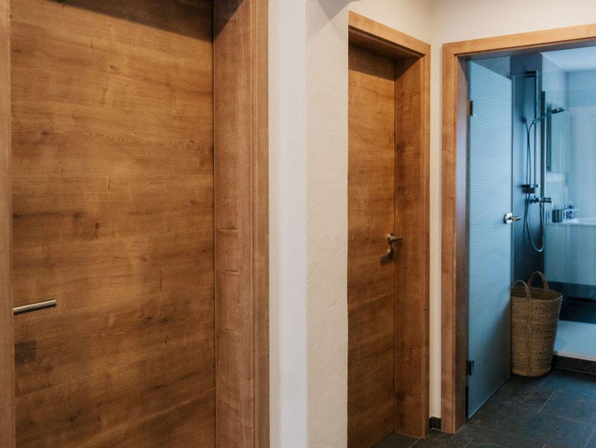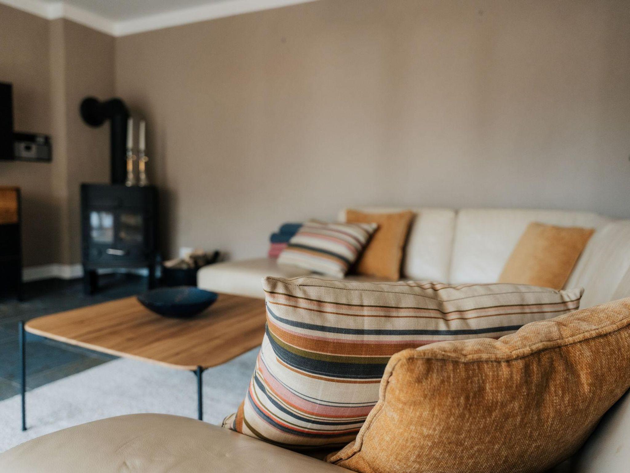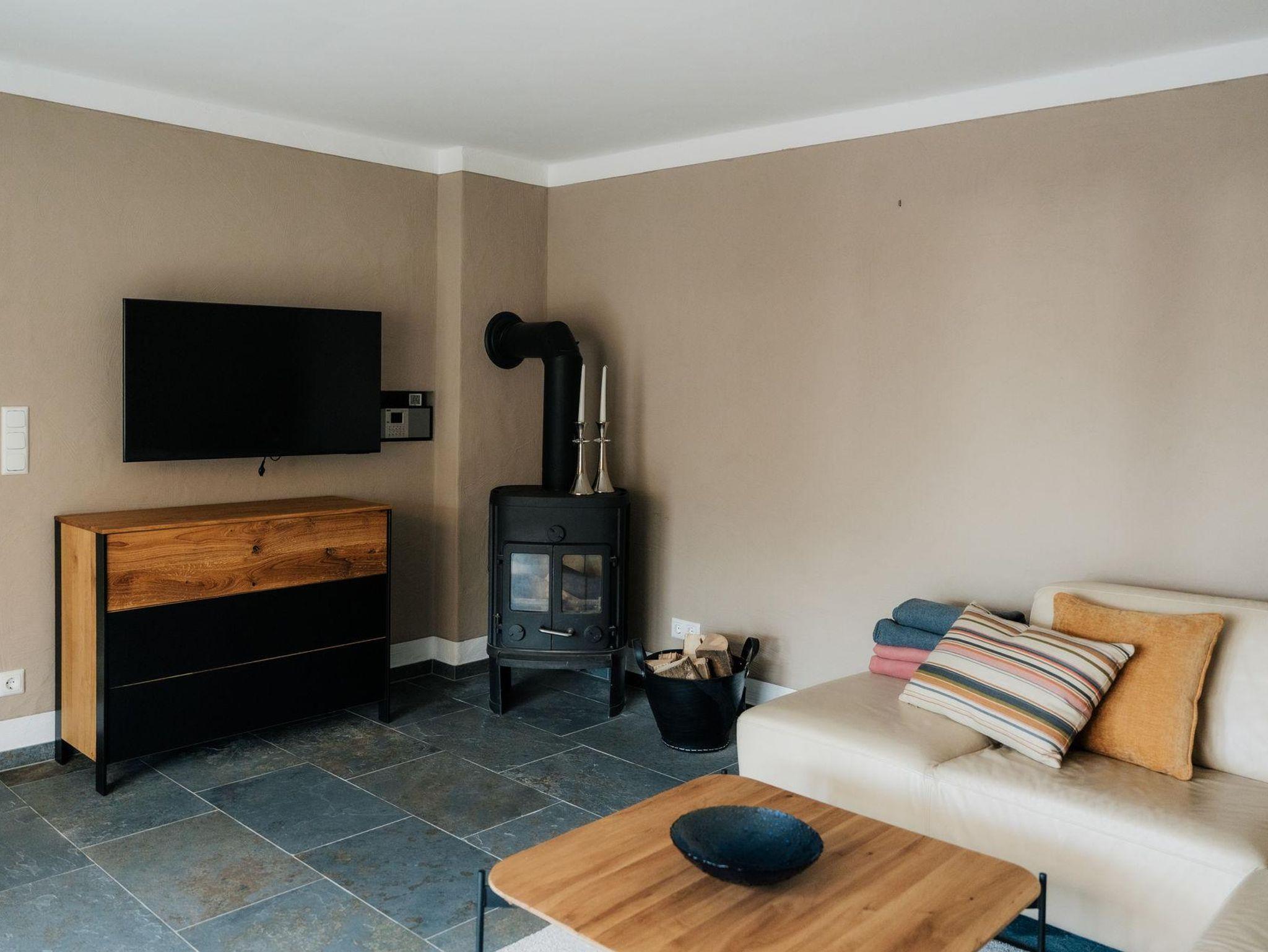 Das separate Wohnzimmer ist ausgestattet mit einer Ledercouch, Echtholzmöbel, Kaminofen und einem Smart TV.