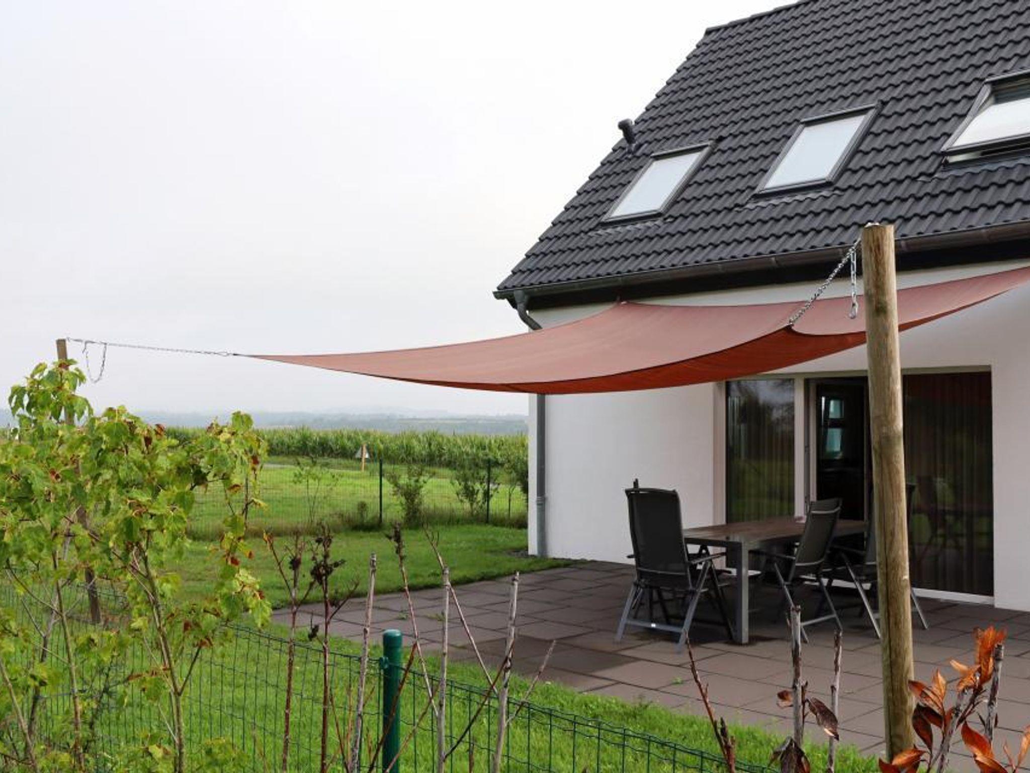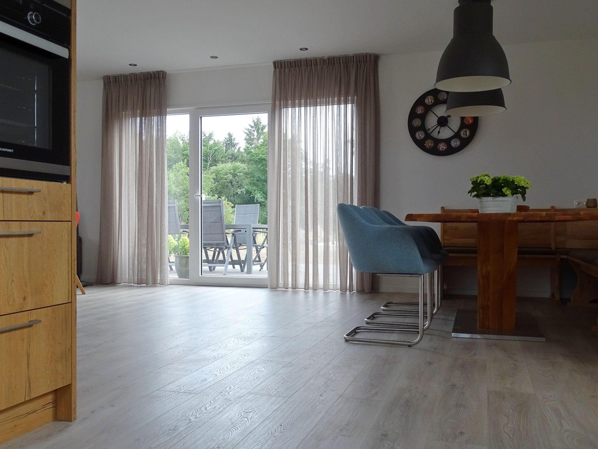 Für eine perfekte Temperatur im Haus ist das gesamte Haus mit einer Fußbodenheizung ausgestattet. Die Terrasse ist durch die Terrassentüren zugänglich. Auf der Terrasse stehen ein Tische mit jeweils sechs Stühlen.