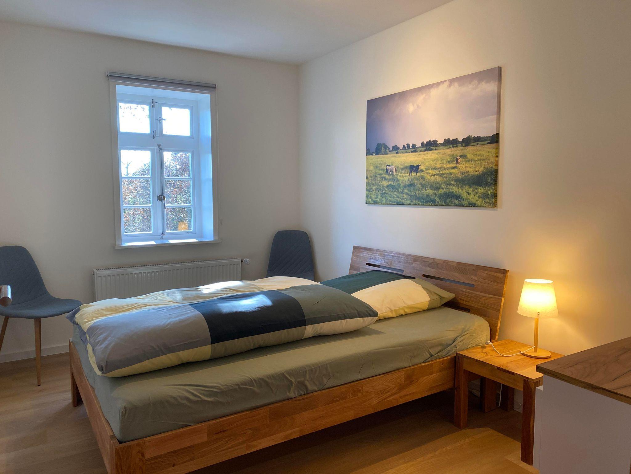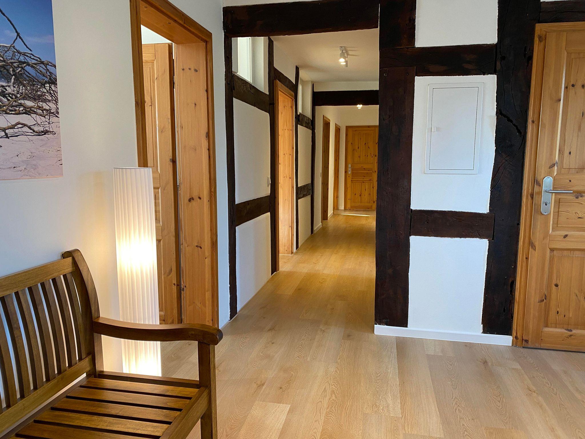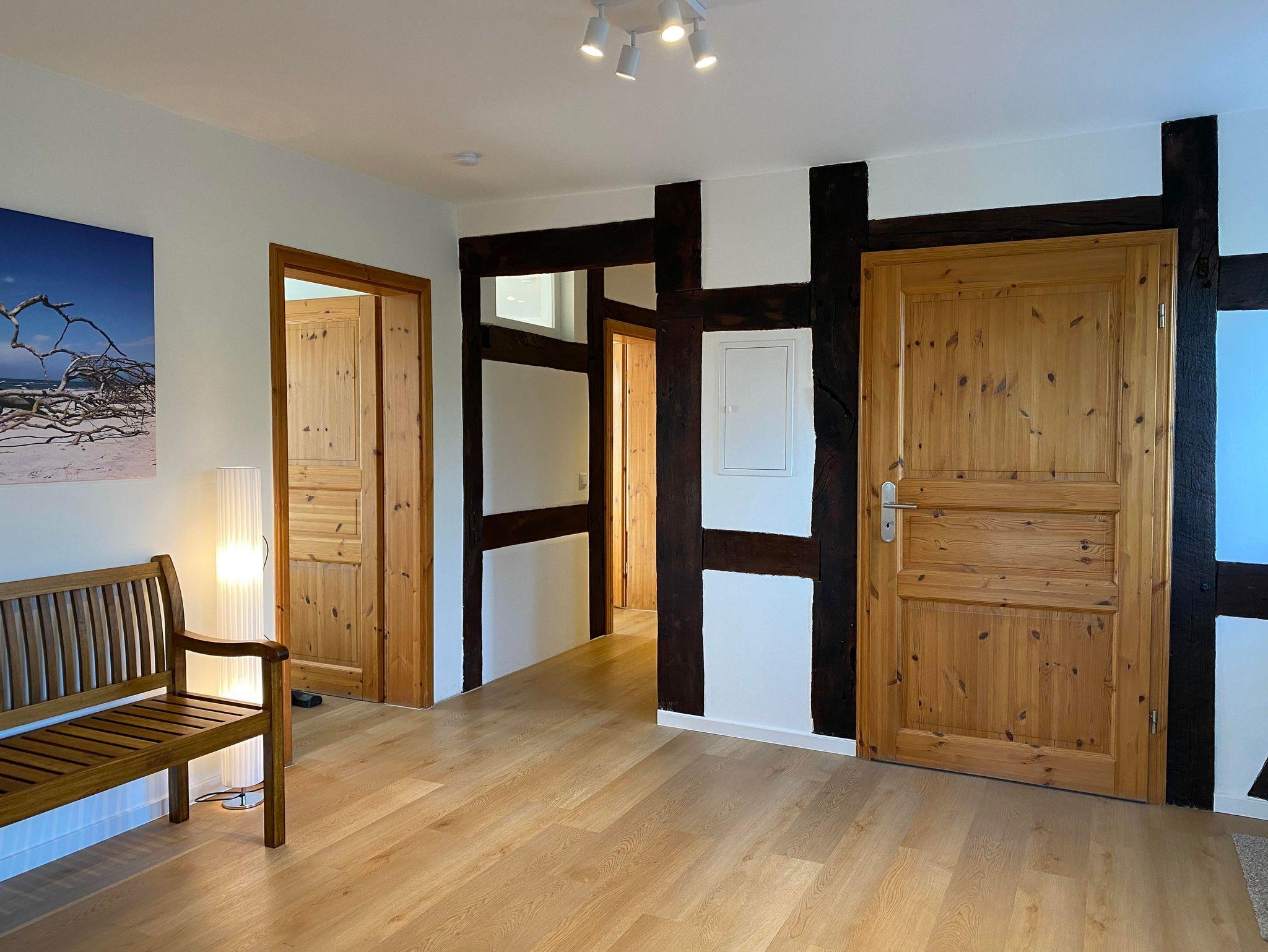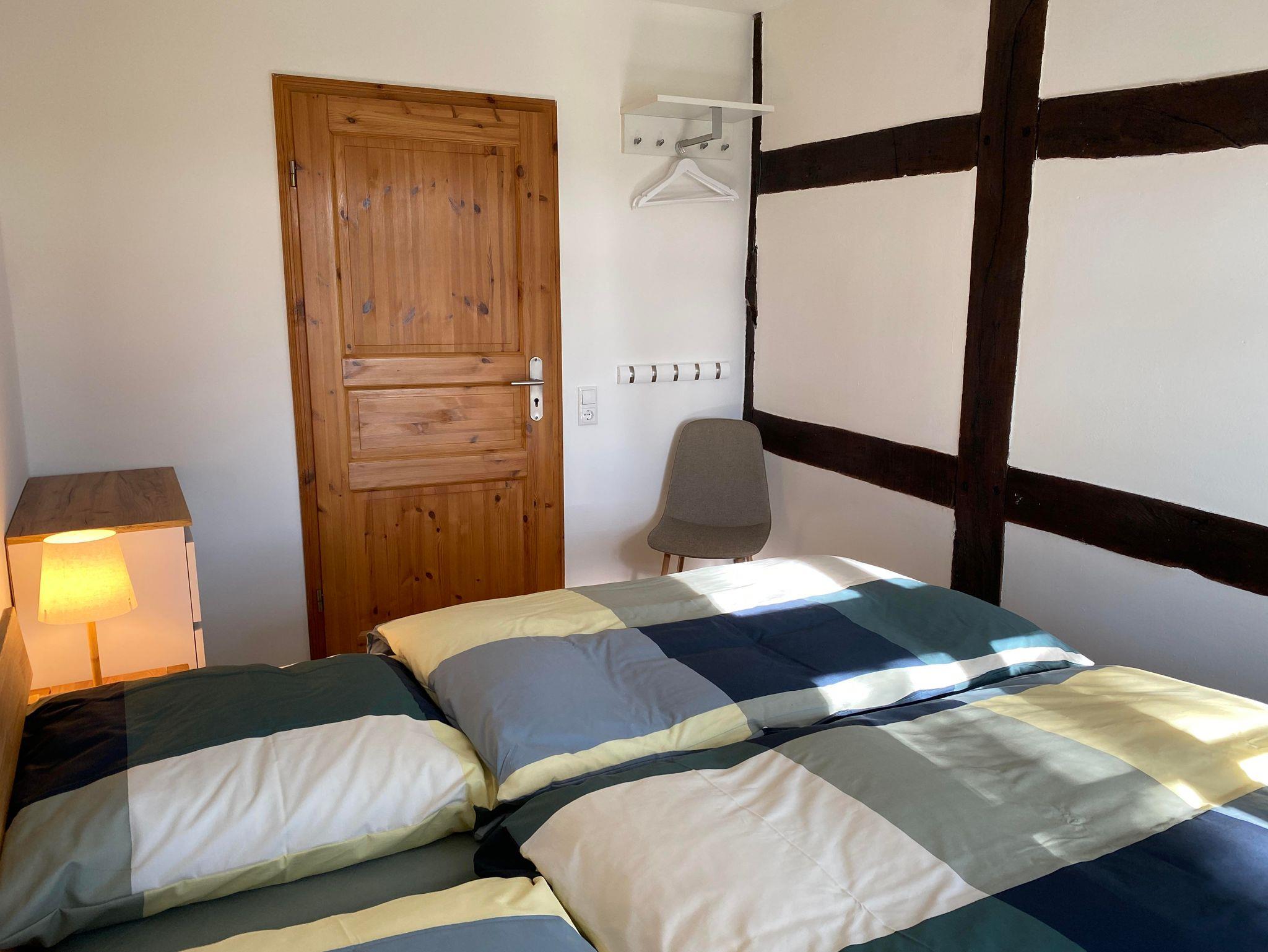 Die Wohnfläche des Fachwerkhauses „Weitblick 2“ befindet sich ausschließlich im Erdgeschoss und umfasst insgesamt ca. 105 m². Vom großzügigen Flur aus gelangt man in einen geräumigen Wohn-Essbereich und in die separate Küche mit direktem Zugang zu Terrasse und Garten. „Weitblick 2“ ist mit einem Badezimmer mit Dusche und WC sowie einem separaten Gäste-WC ausgestattet. Es stehen drei Schlafzimmer für insgesamt 5 Personen zur Verfügung: ein großes Schlafzimmer mit Doppelbett, ein kleines Schlafzimmer mit Doppelbett, ein Schlafzimmer mit großem Einzelbett (Breite: 1 x 140 cm).