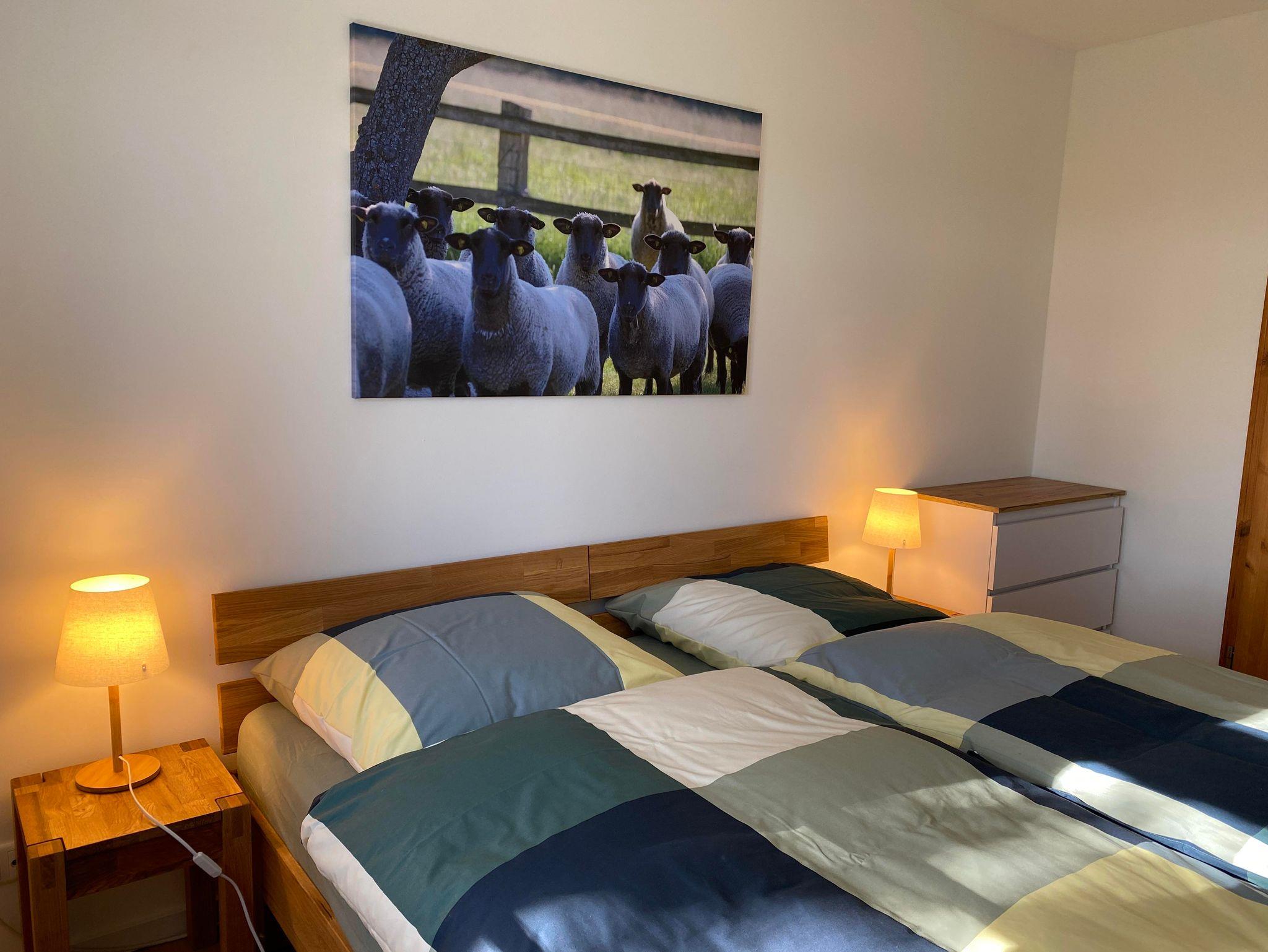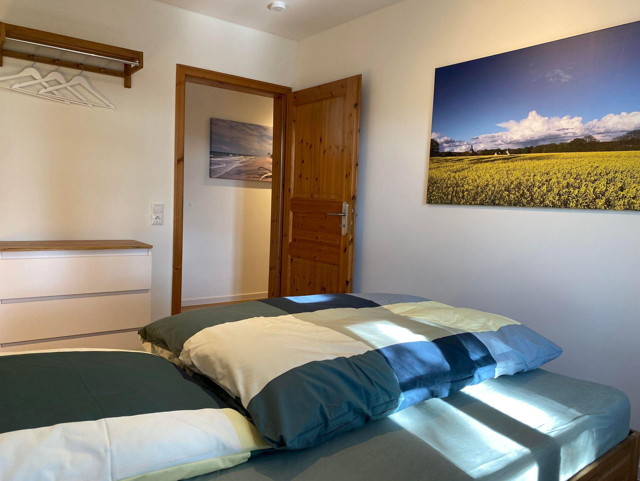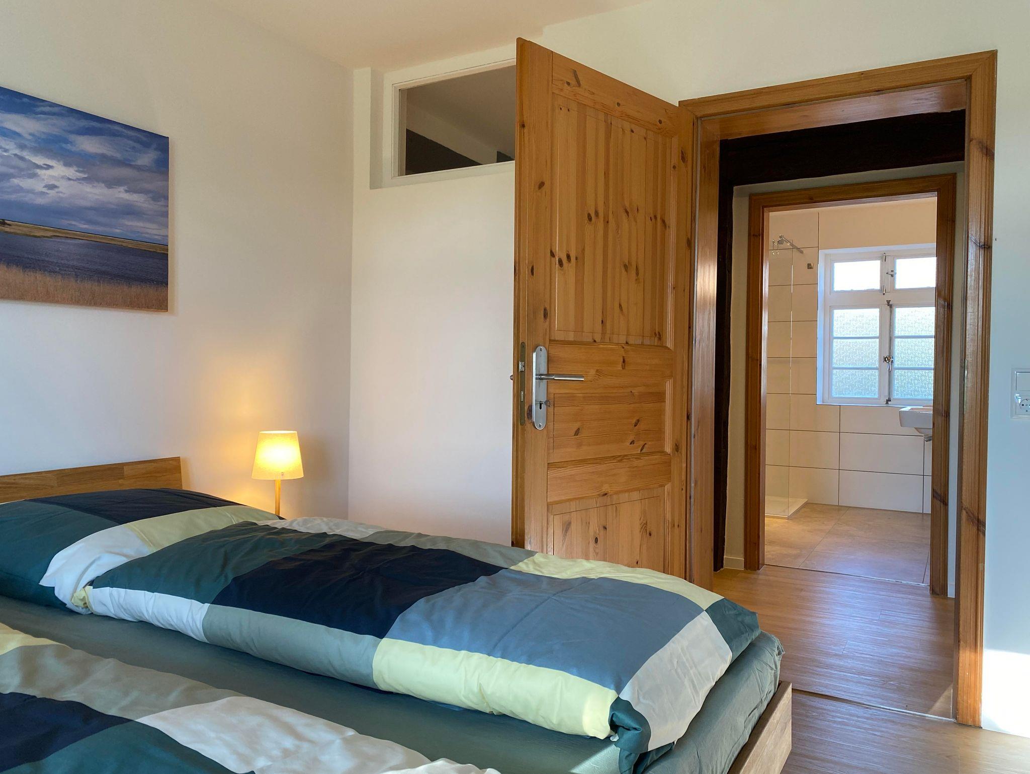 Die Wohnfläche des Fachwerkhauses „Weitblick 2“ befindet sich ausschließlich im Erdgeschoss und umfasst insgesamt ca. 105 m². Vom großzügigen Flur aus gelangt man in einen geräumigen Wohn-Essbereich und in die separate Küche mit direktem Zugang zu Terrasse und Garten. „Weitblick 2“ ist mit einem Badezimmer mit Dusche und WC sowie einem separaten Gäste-WC ausgestattet. Es stehen drei Schlafzimmer für insgesamt 5 Personen zur Verfügung: ein großes Schlafzimmer mit Doppelbett, ein kleines Schlafzimmer mit Doppelbett, ein Schlafzimmer mit großem Einzelbett (Breite: 1 x 140 cm).
