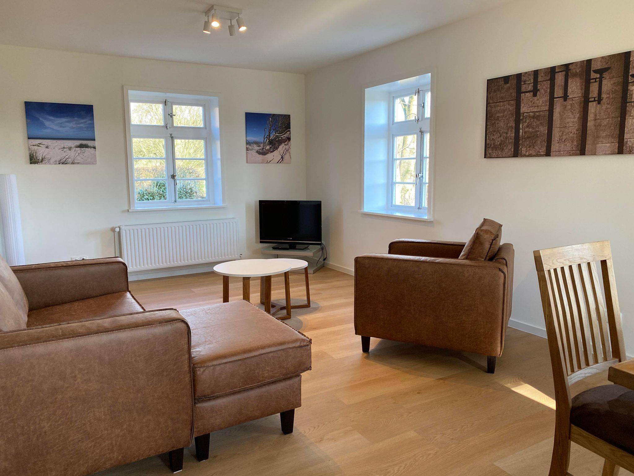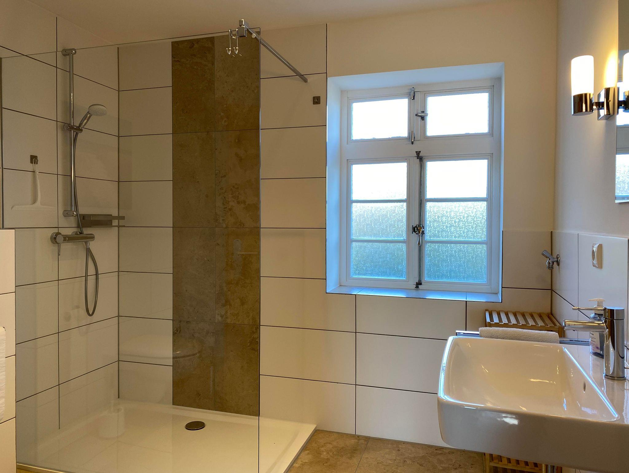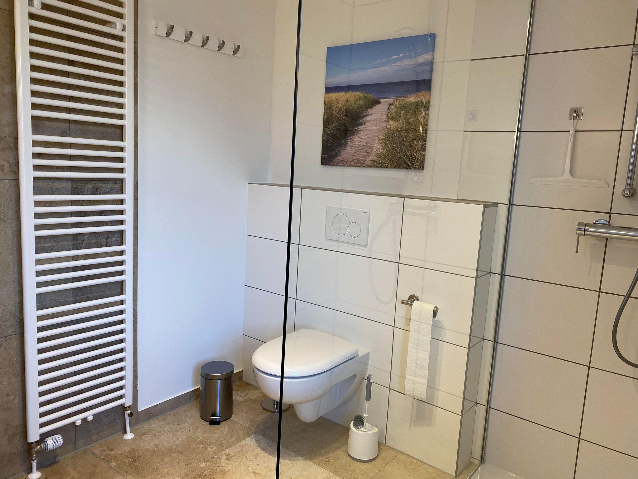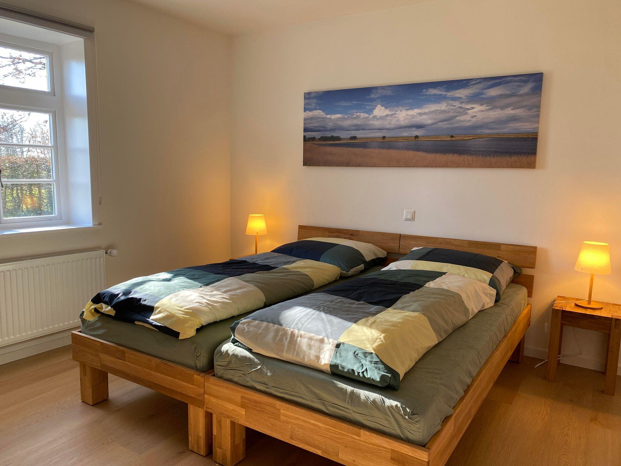 Die Wohnfläche des Fachwerkhauses „Weitblick 2“ befindet sich ausschließlich im Erdgeschoss und umfasst insgesamt ca. 105 m². Vom großzügigen Flur aus gelangt man in einen geräumigen Wohn-Essbereich und in die separate Küche mit direktem Zugang zu Terrasse und Garten. „Weitblick 2“ ist mit einem Badezimmer mit Dusche und WC sowie einem separaten Gäste-WC ausgestattet. Es stehen drei Schlafzimmer für insgesamt 5 Personen zur Verfügung: ein großes Schlafzimmer mit Doppelbett, ein kleines Schlafzimmer mit Doppelbett, ein Schlafzimmer mit großem Einzelbett (Breite: 1 x 140 cm).