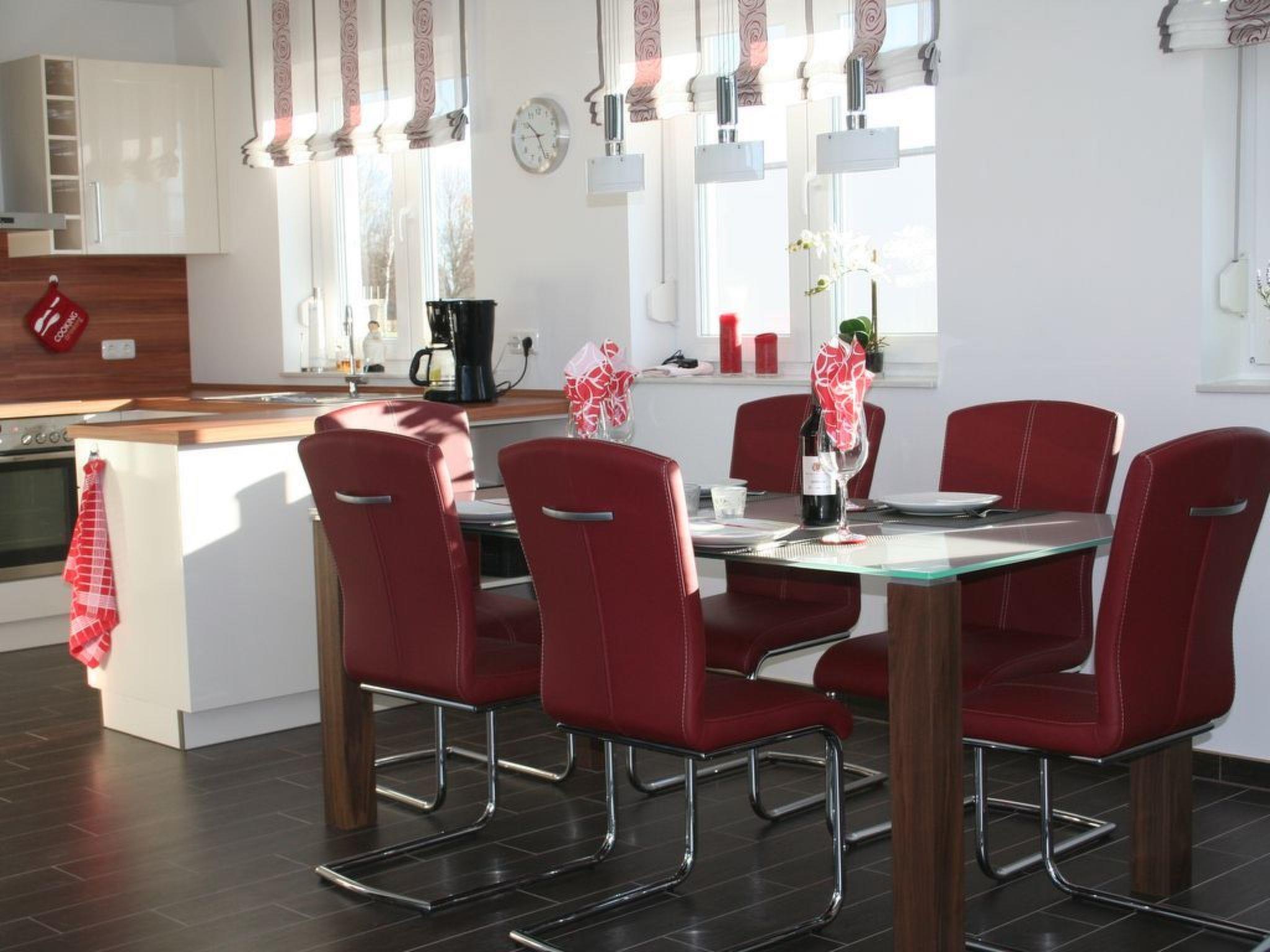 It provides 162m² and rooms are flooded with daylight and have modern and stylish furnishing. The interior is of a very high standard and provides everything you need. There is a sauna house for cold winter days. It is perfect holiday accommodation for discerning guests. The ground floor consists of a living and dining room with a fireplace, a flatscreen TV, a DVD player and radio, a dining corner and a fully-equipped kitchen with a stove, oven, microwave, coffee machine and dishwasher, as well as two bedrooms each with a double bed (180cm wide) and a flatscreen TV, two bathrooms with a shower, of which one is ensuite. The upper floor has a further bedroom with a double bed (180cm wide) and a flatscreen TV, as well as an ensuite bathroom with a shower and bath, and a gallery with a view towards the bodden and the island Hiddensee.