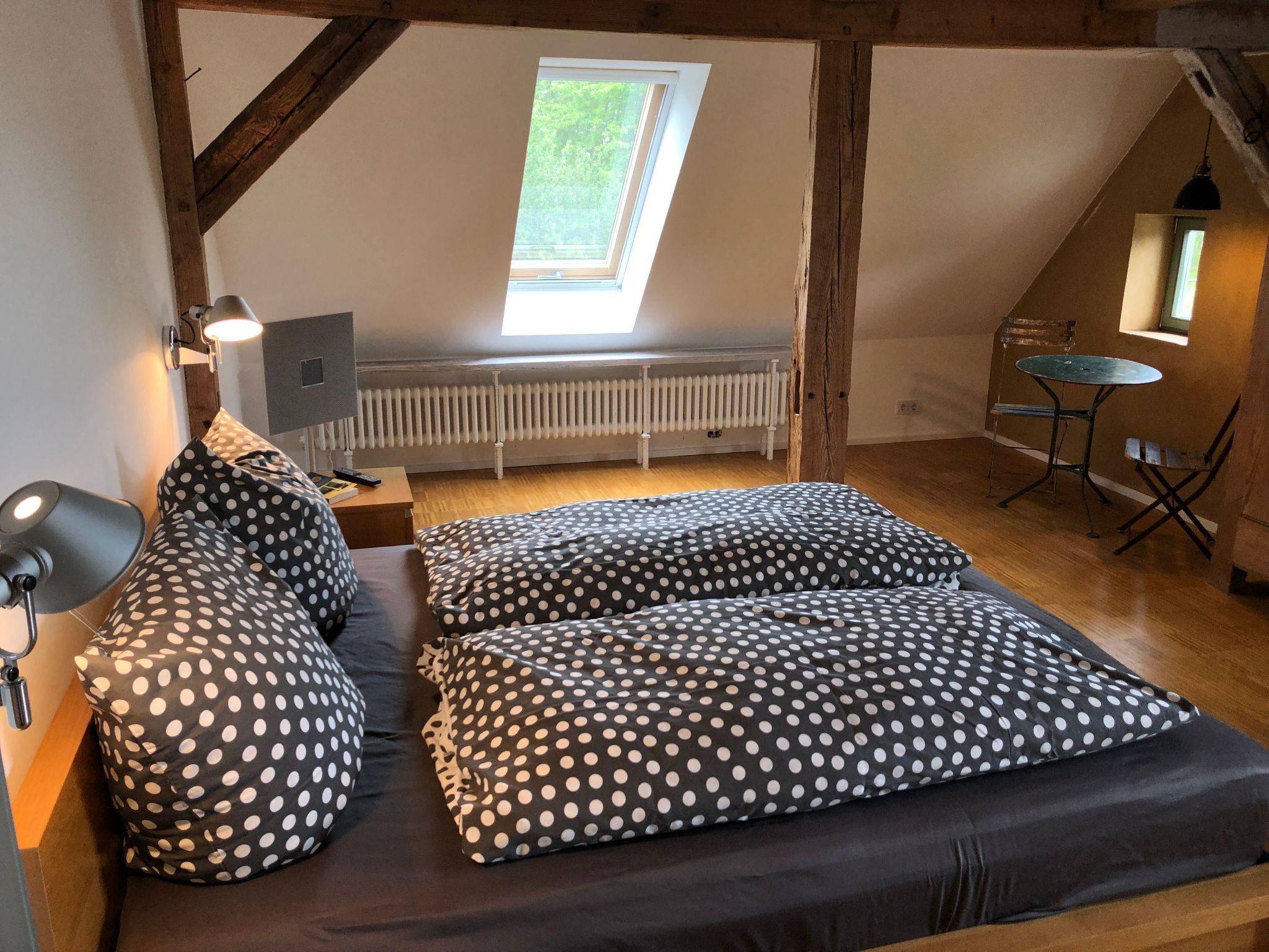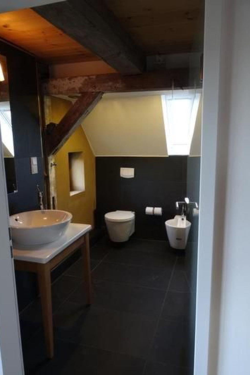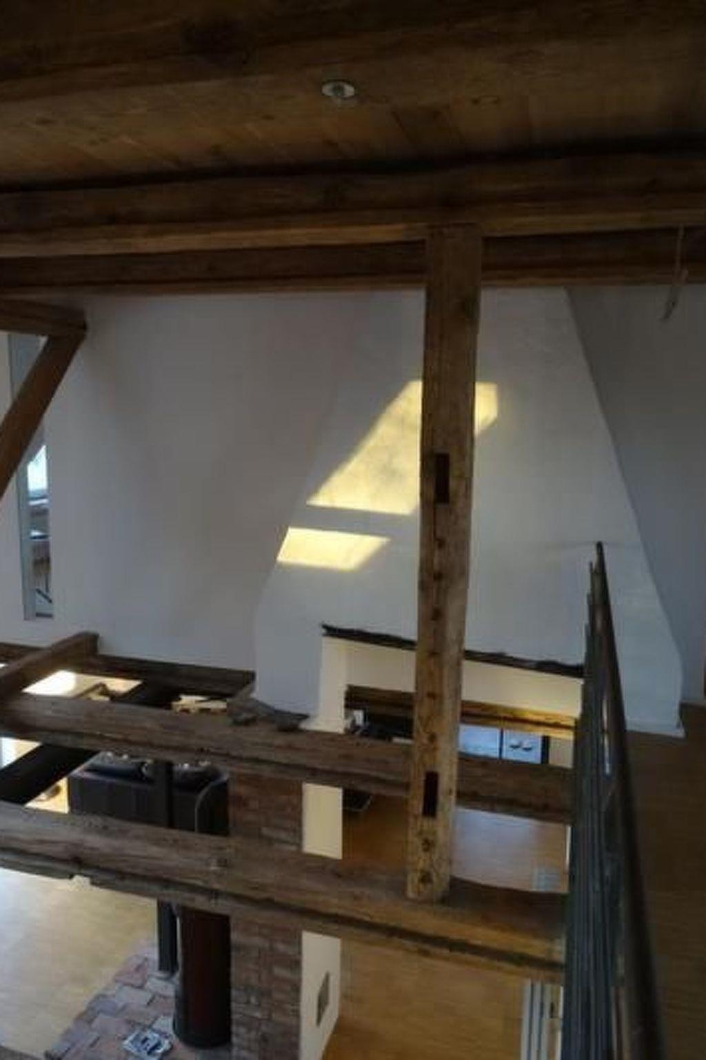 Inside, you can expect an open and light-flooded interior design with wooden parquet floors and a kitchen with historic brick flooring. A raw iron steel staircase with wooden flooring leads you to the open gallery, which invites you to spend hours reading with a view of the expansive fields. The bathrooms are elegantly furnished with natural stone and sanitaryware by Philippe Starck, while the exposed beams and walls partially lined with clay bricks emphasise the historic charm. Two bedrooms and two bathrooms offer additional comfort and provide cosy retreats in this unique ambience.