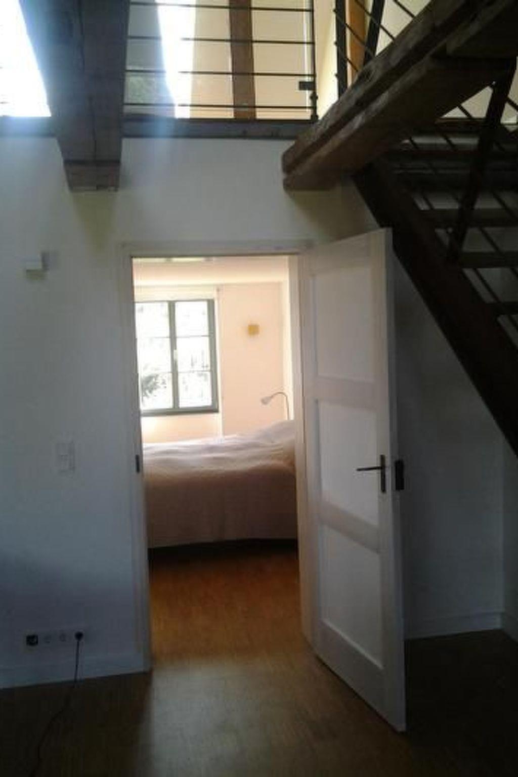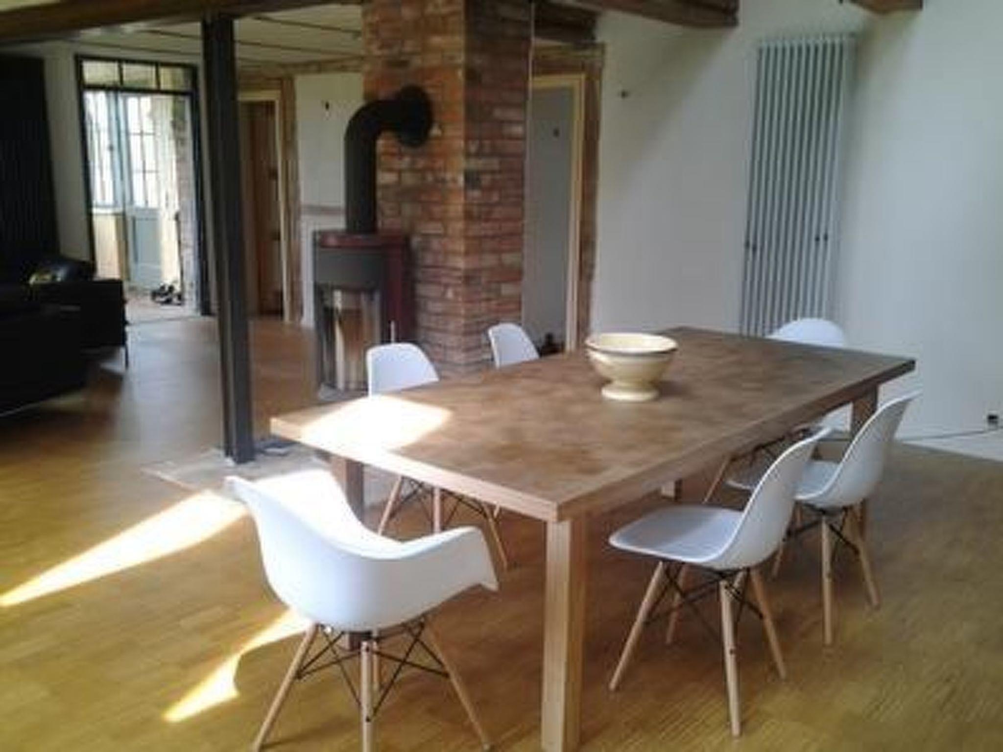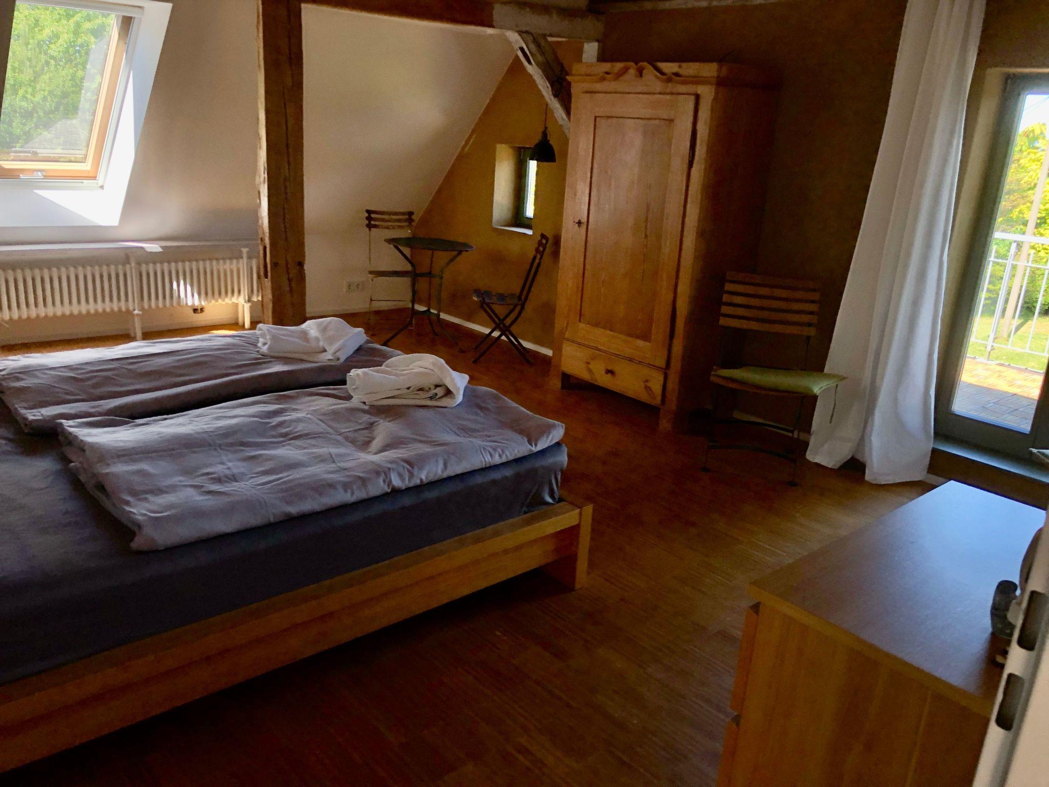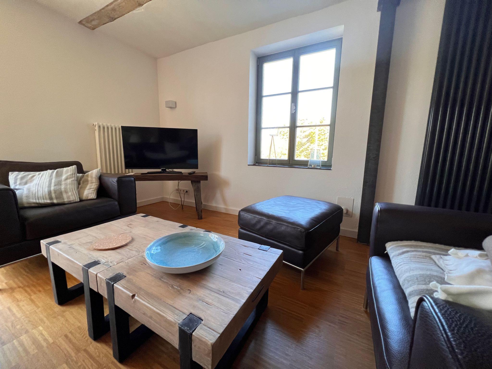 Inside, you can expect an open and light-flooded interior design with wooden parquet floors and a kitchen with historic brick flooring. A raw iron steel staircase with wooden flooring leads you to the open gallery, which invites you to spend hours reading with a view of the expansive fields. The bathrooms are elegantly furnished with natural stone and sanitaryware by Philippe Starck, while the exposed beams and walls partially lined with clay bricks emphasise the historic charm. Two bedrooms and two bathrooms offer additional comfort and provide cosy retreats in this unique ambience.
