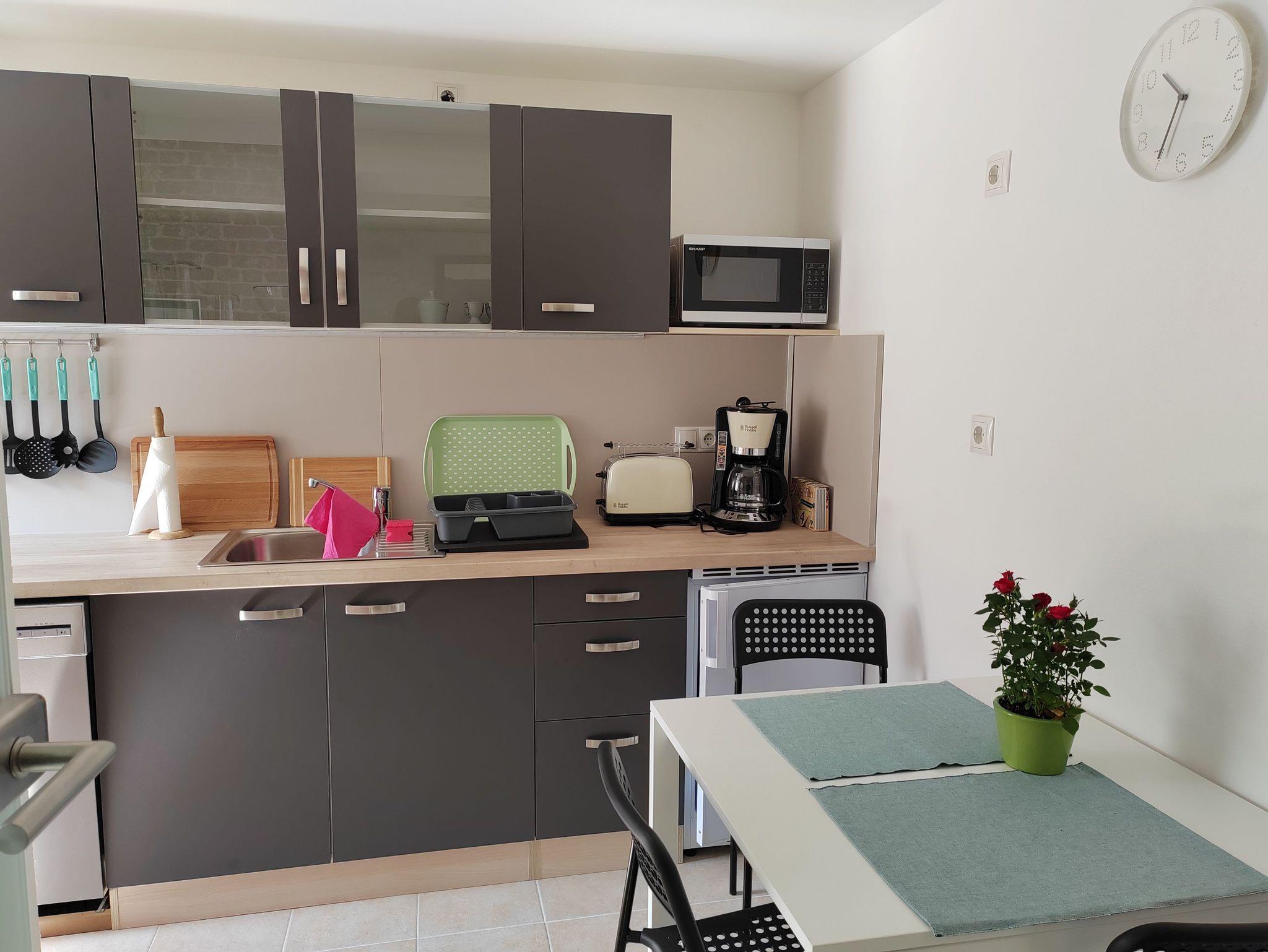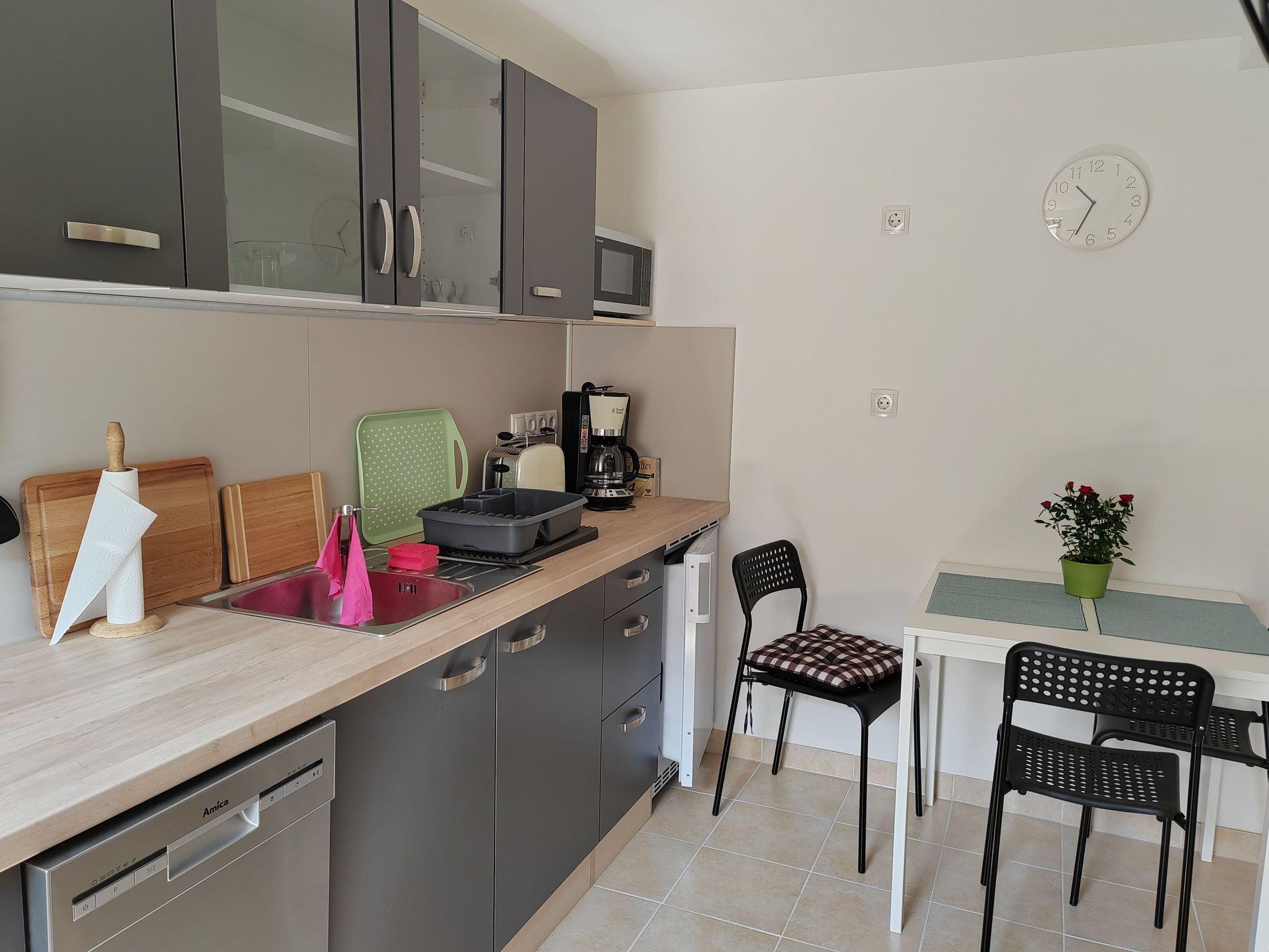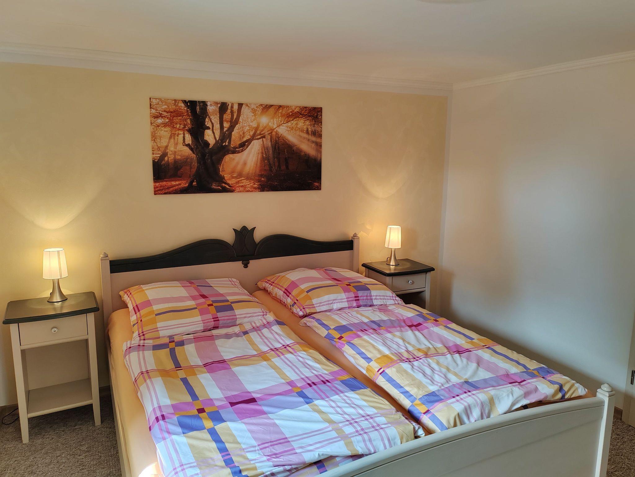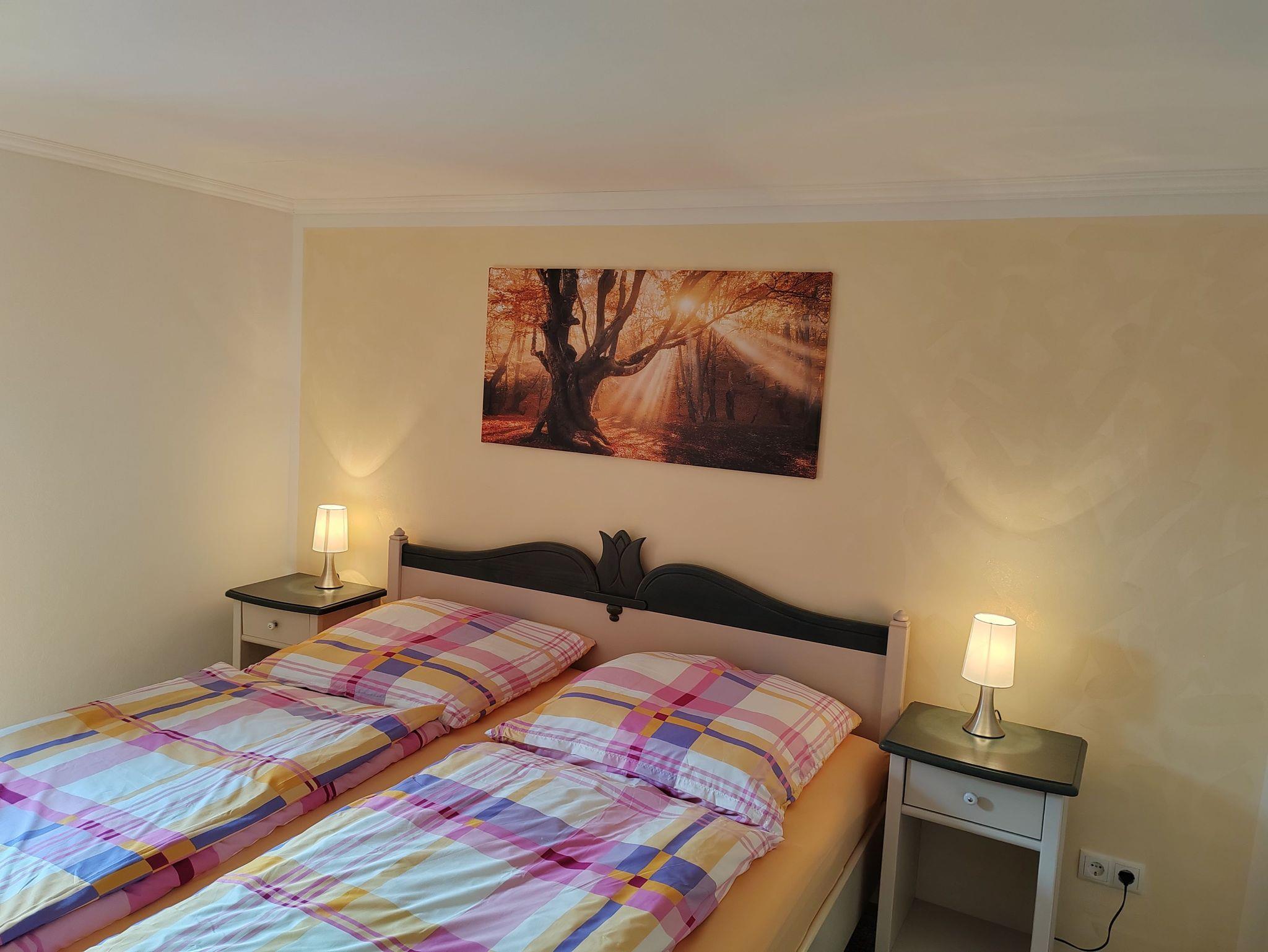 Ihnen steht ein gemütlich eingerichtetes Wohnzimmer mit Schlafsofa, ein Schlafzimmer mit Doppelbett und Kleiderschrank, eine Küche mit Essplatz sowie der separaten Toilette und eine Dusche zur Verfügung.