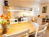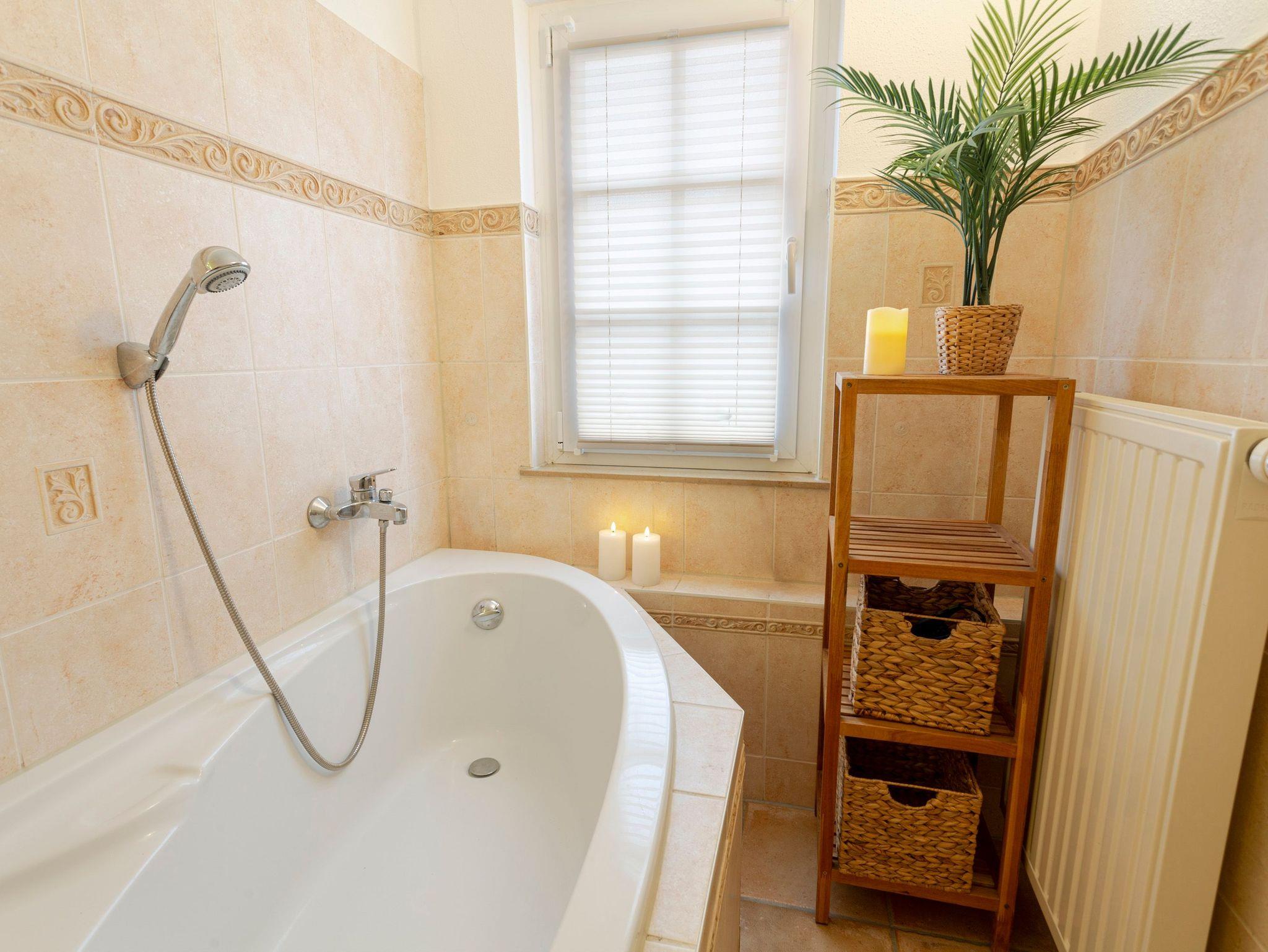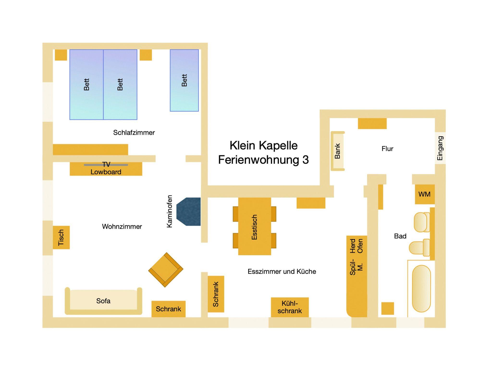 Die Ferienwohnung 3 im Haus Klein Kapelle befindet sich im Erdgeschoss des Hauses und bietet auf 57 m² genügend Platz für bis zu 4 Personen und einem Baby. Das Wohnzimmer verfügt neben einem Schlafsofa (150x210) und einem großen TV über einen modernen Kamin, der angenehme Wärme an kalten Abenden spendet. Das Schlafzimmer schließt sich an das Wohnzimmer und bietet ein Doppelbett (160x200) und ein Einzelbett (70x175) für erholsame Nächte. Die geräumige Küche lädt zum Kochen und gemeinsamen Genießen ein. Im Zentrum steht der große Esstisch und rund herum befindet sich die voll ausgestattete Küche im Landhausstil. Kochen sie ganz wie zu Hause, dafür stehen ihnen Herd, Backofen, Kühlschrank, Geschirrspüler und Mikrowelle zur Verfügung. Die kleinen Küchenhelfer des Alltags, wie Kaffeemaschine, Toaster, Wasserkocher und Milchaufschäumer befinden sich ebenfalls in der Küche. Das Bad ist mit einer Badewanne, WC, Waschbecken und einer Waschmaschine ausgestattet.