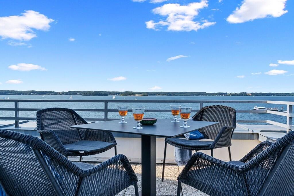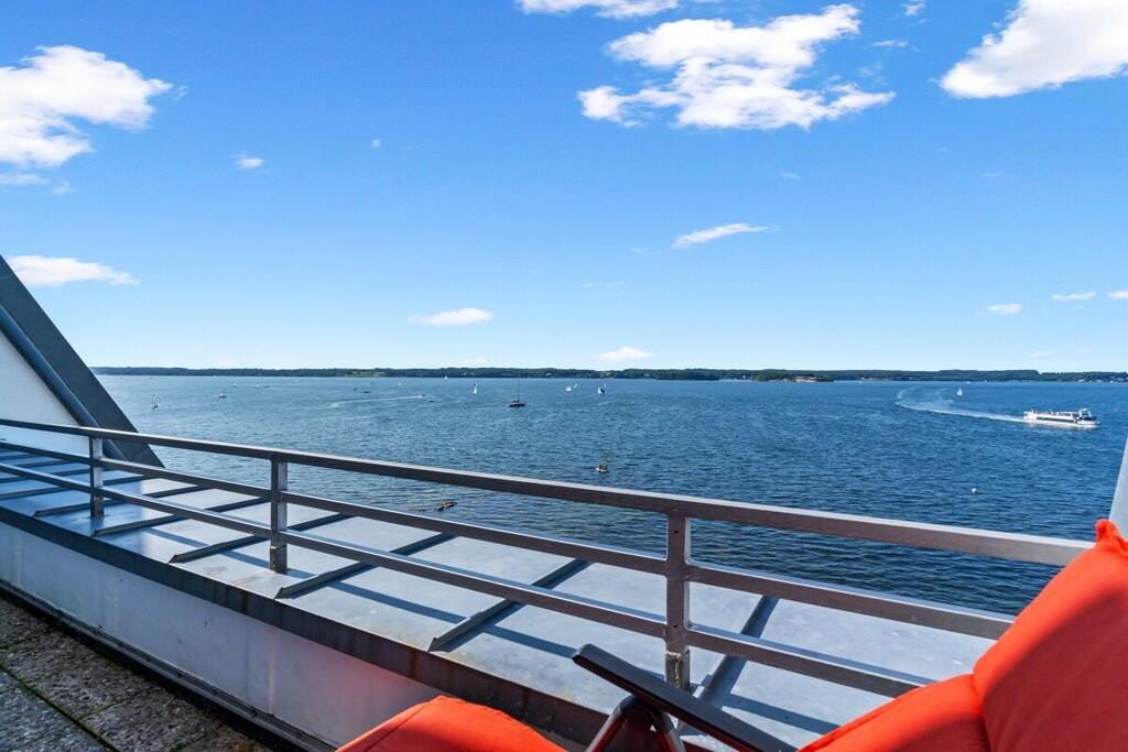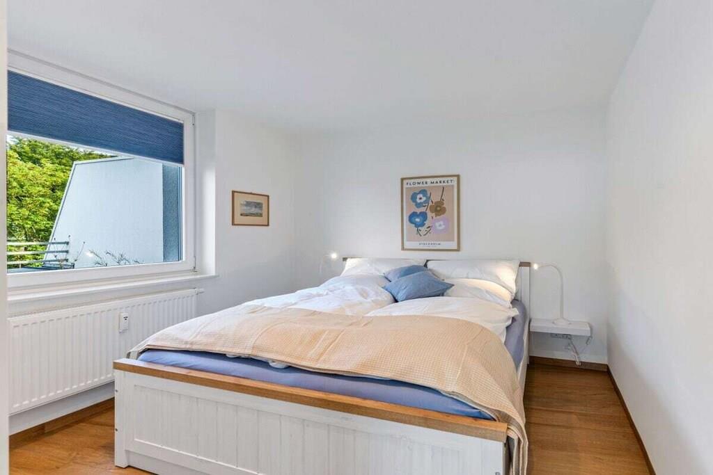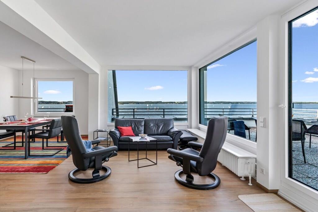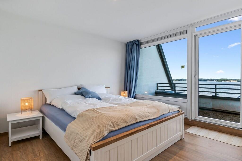 Holiday apartment for 4 people in a top location, right on Sandwig beach in Glücksburg, Flensburg Fjord, with a secluded balcony and a large roof terrace facing the water. 2 bedrooms, living-dining room and open kitchen with a view over the fjord to the Ochsen Islands in Denmark. Bathroom and additional guest toilet. Spacious roof terrace for breakfast and also for yoga or Pilates exercises for two or possibly with a fitness trainer...? (Addresses for booking purposes can be provided.) Yacht school and swimming in the fjord or in autumn/winter in the Fördeland thermal baths, which are a 5-minute walk away? Pure relaxation and fitness!