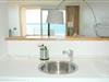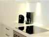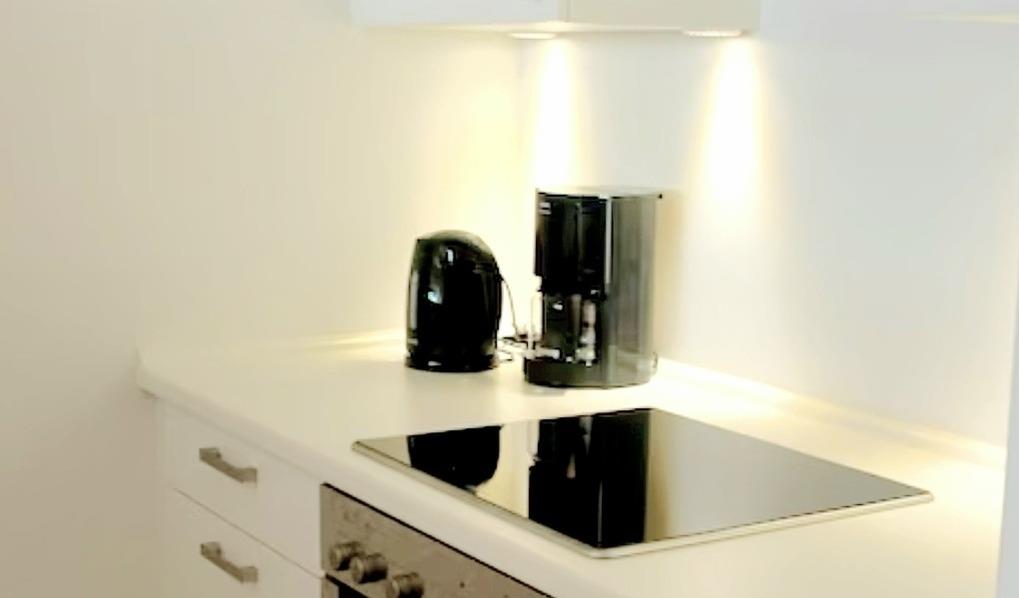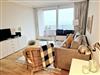 Das Schlafzimmer präsentiert sich in einem maritimen Stil, gehalten in Weiß und Türkis. Sowohl das Bett als auch die Matratzen sind brandneu. Die nagelneue Einbauküche ist komplett ausgestattet mit einem Geschirrspüler, einem Kühlschrank und einem Backofen mit Cerankochfeld. Von Ihrem Küchentresen aus können Sie den Blick ins Wohnzimmer genießen und weiter auf die Förde schweifen lassen.