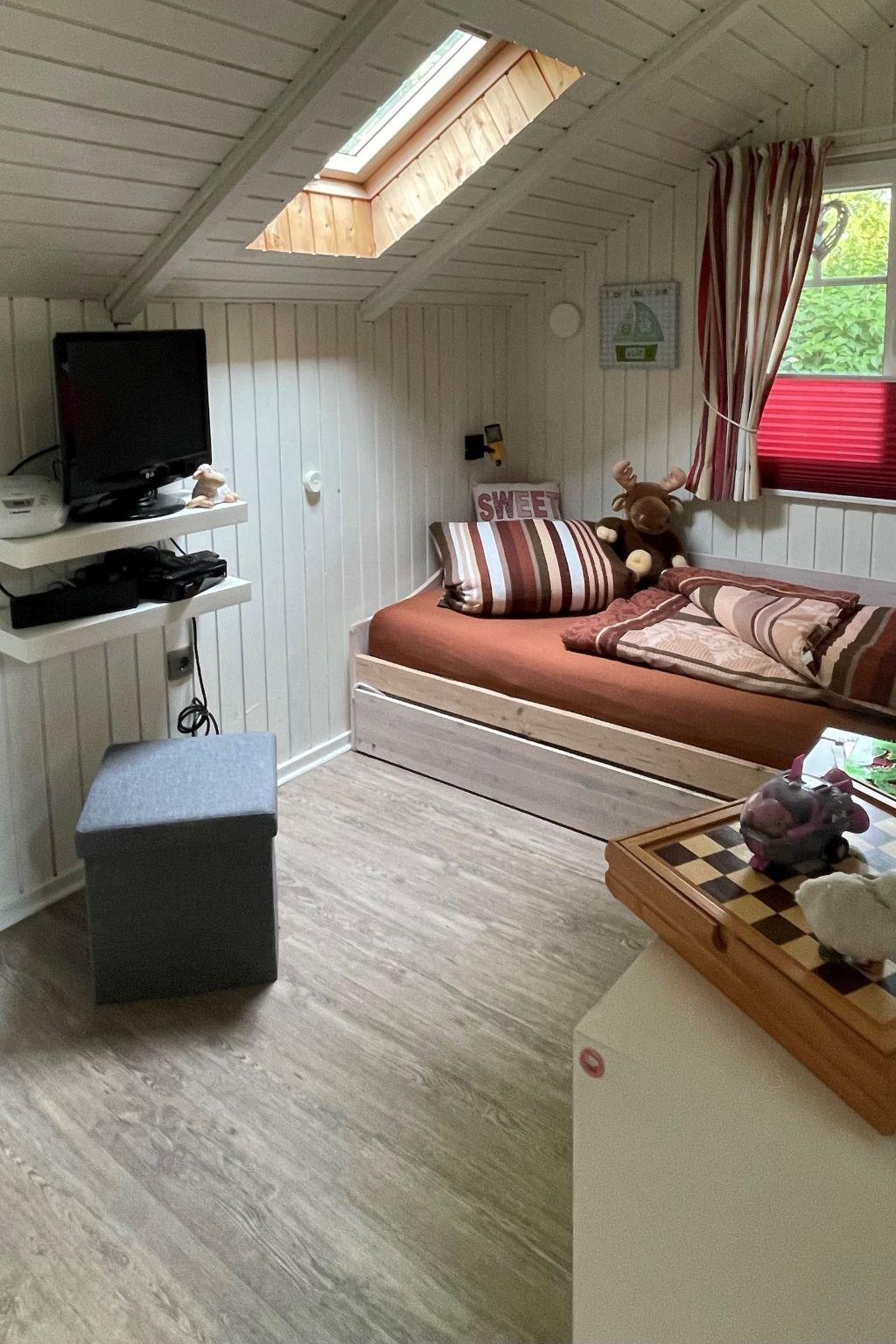 A cosy double bed (140 x 200 cm) and a single bed (90 x 200 cm) in the children's room.