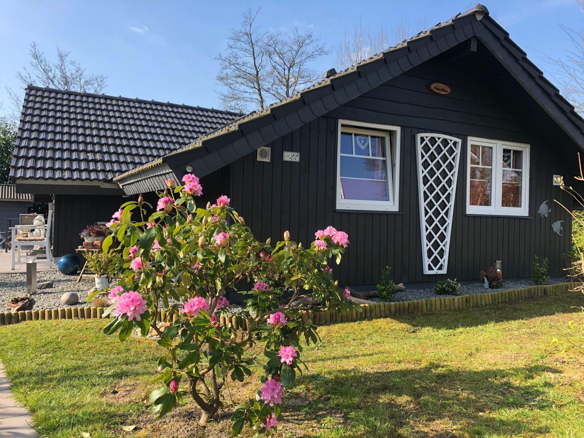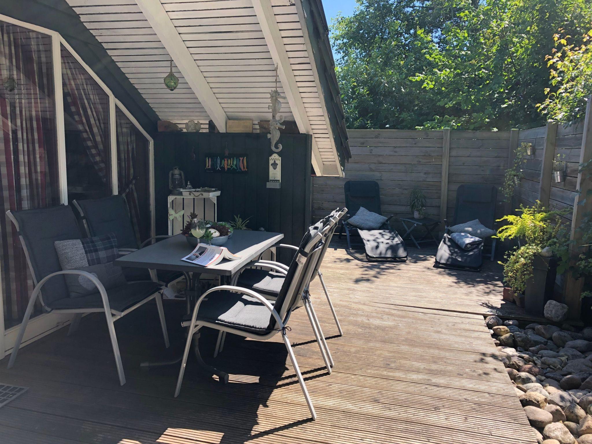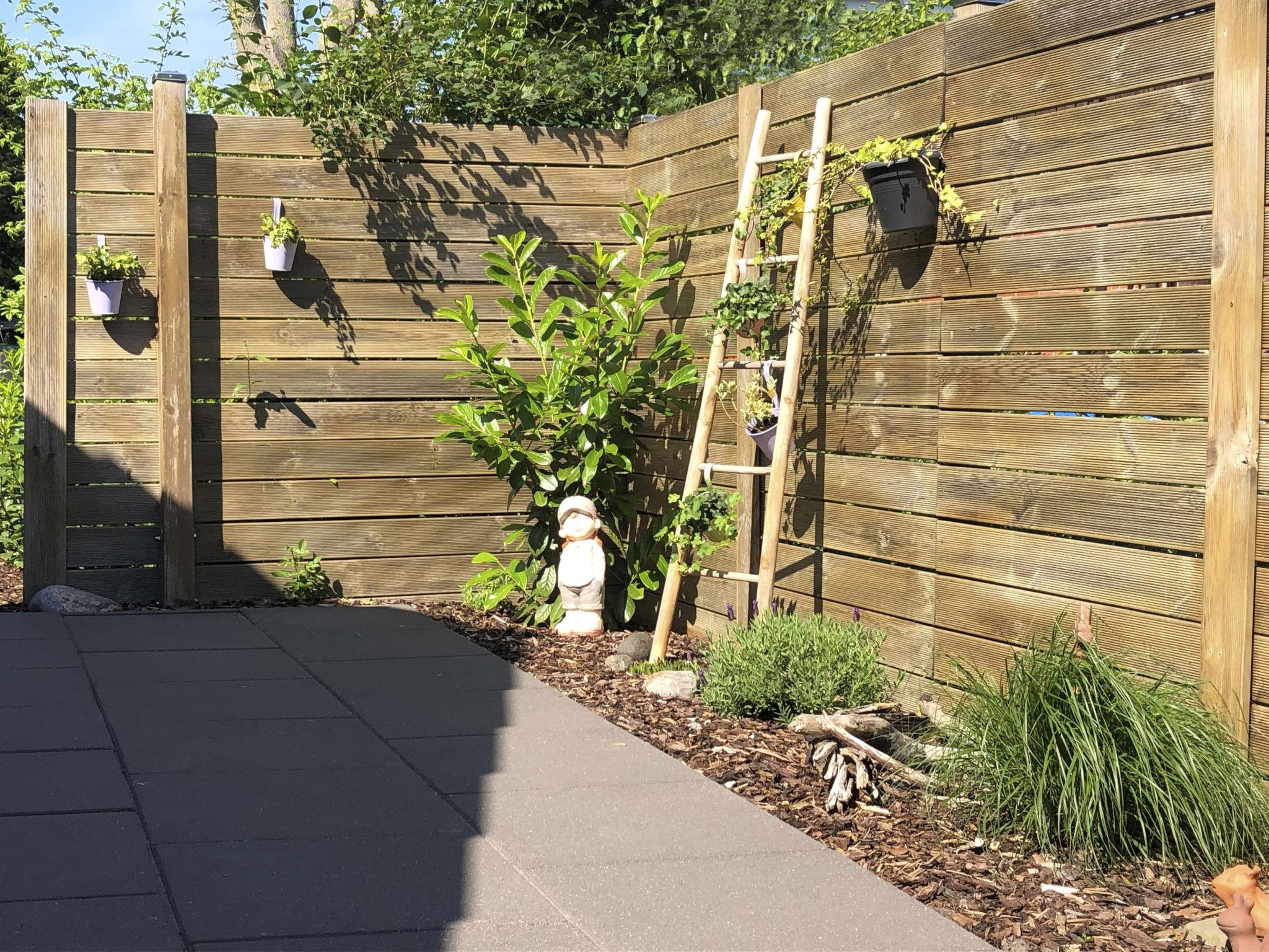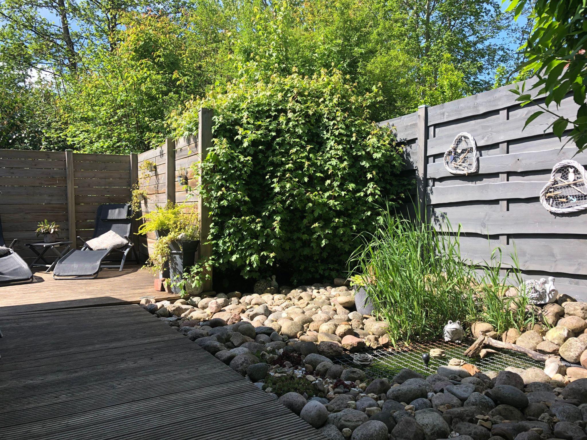The holiday home is located on a green, overgrown plot of approx. 500 m² with a partially fenced garden and two sun terraces.
