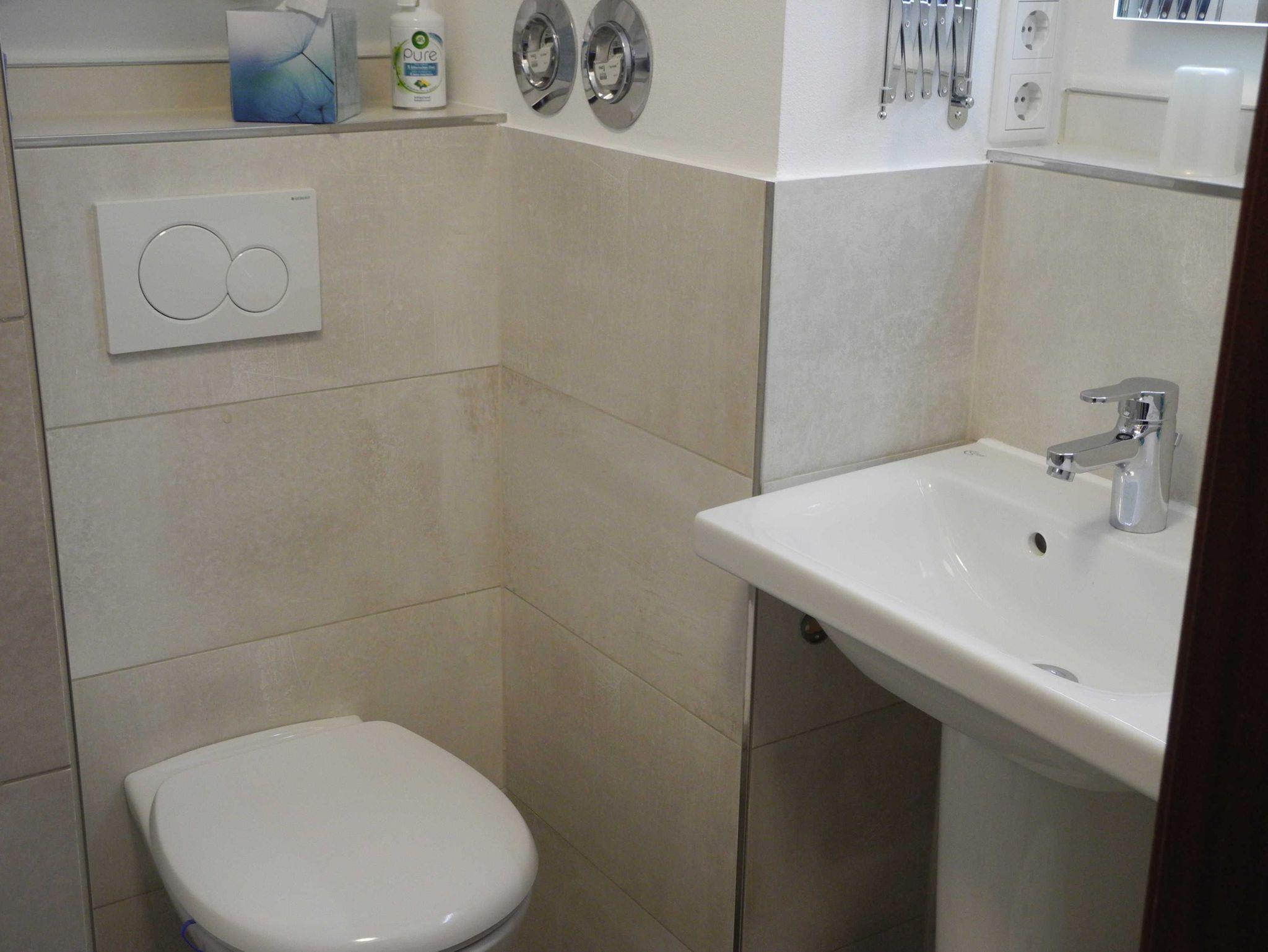• Bad mit Dusche, WC, Waschbecken und verschiedenen Ablagen