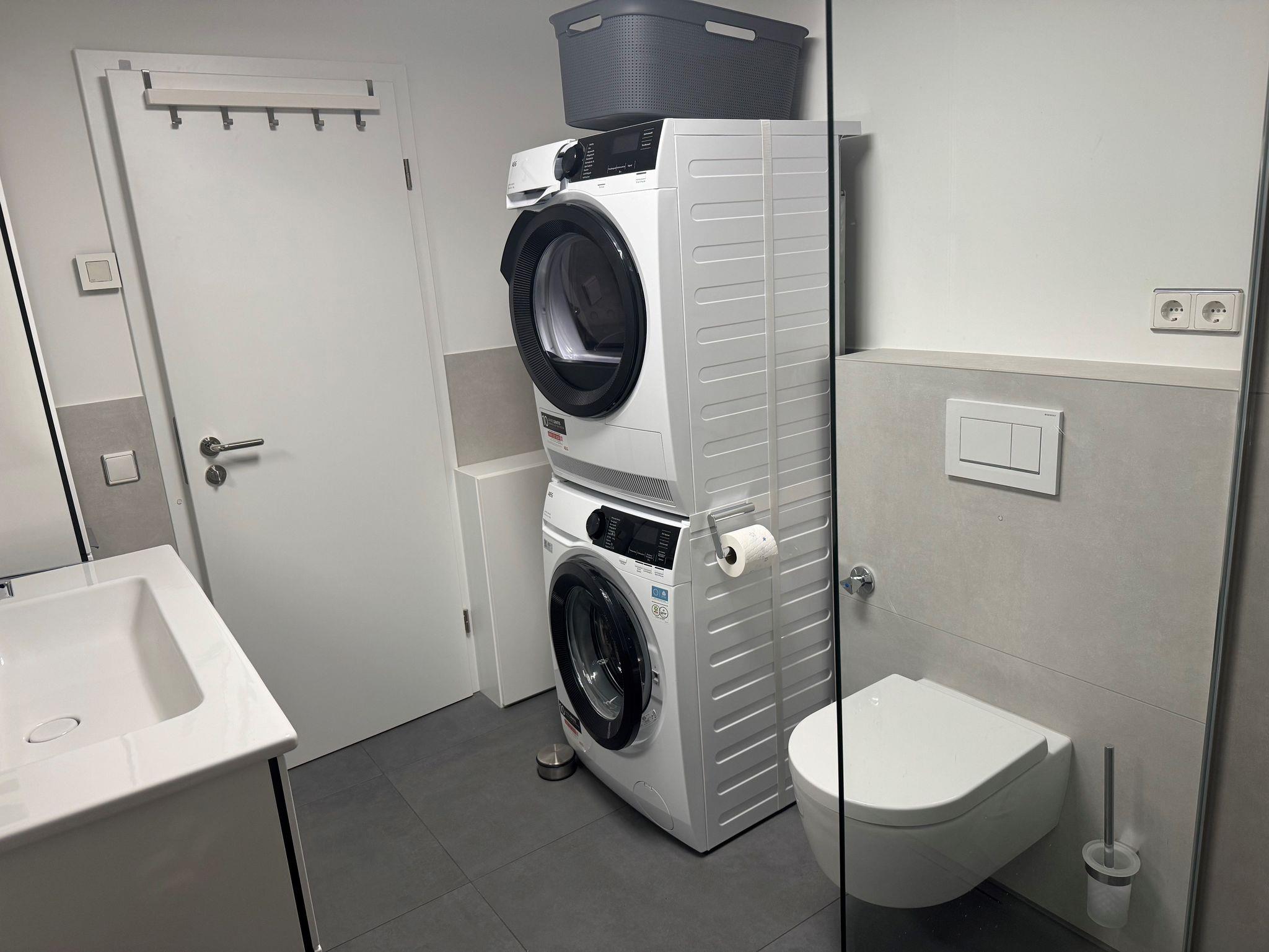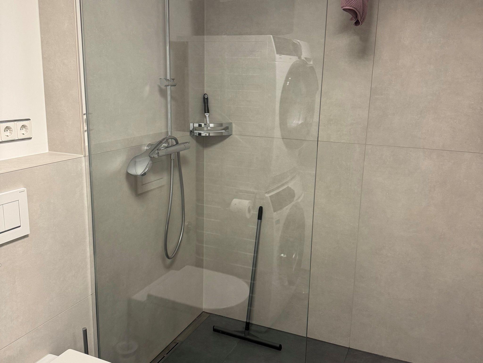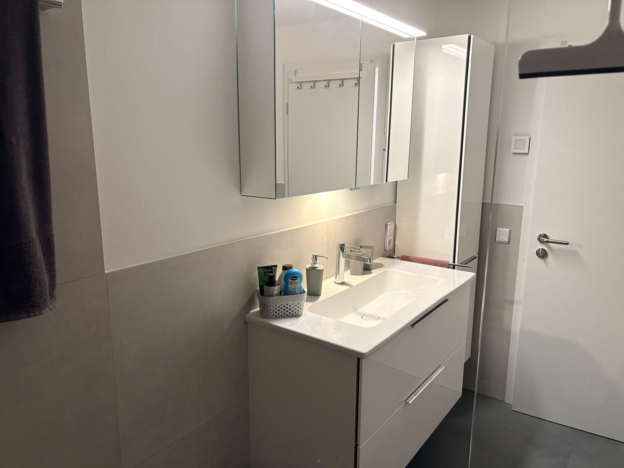 • Luxusbad mit begehbarer Dusche, Spiegelschrank, Waschmaschine und Trockner