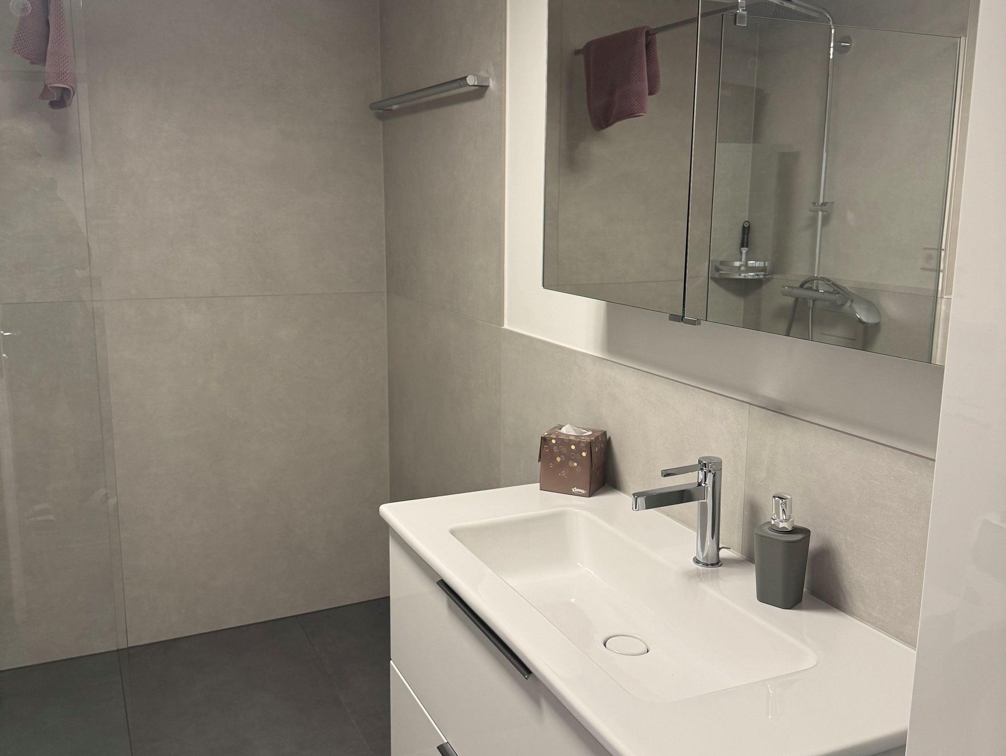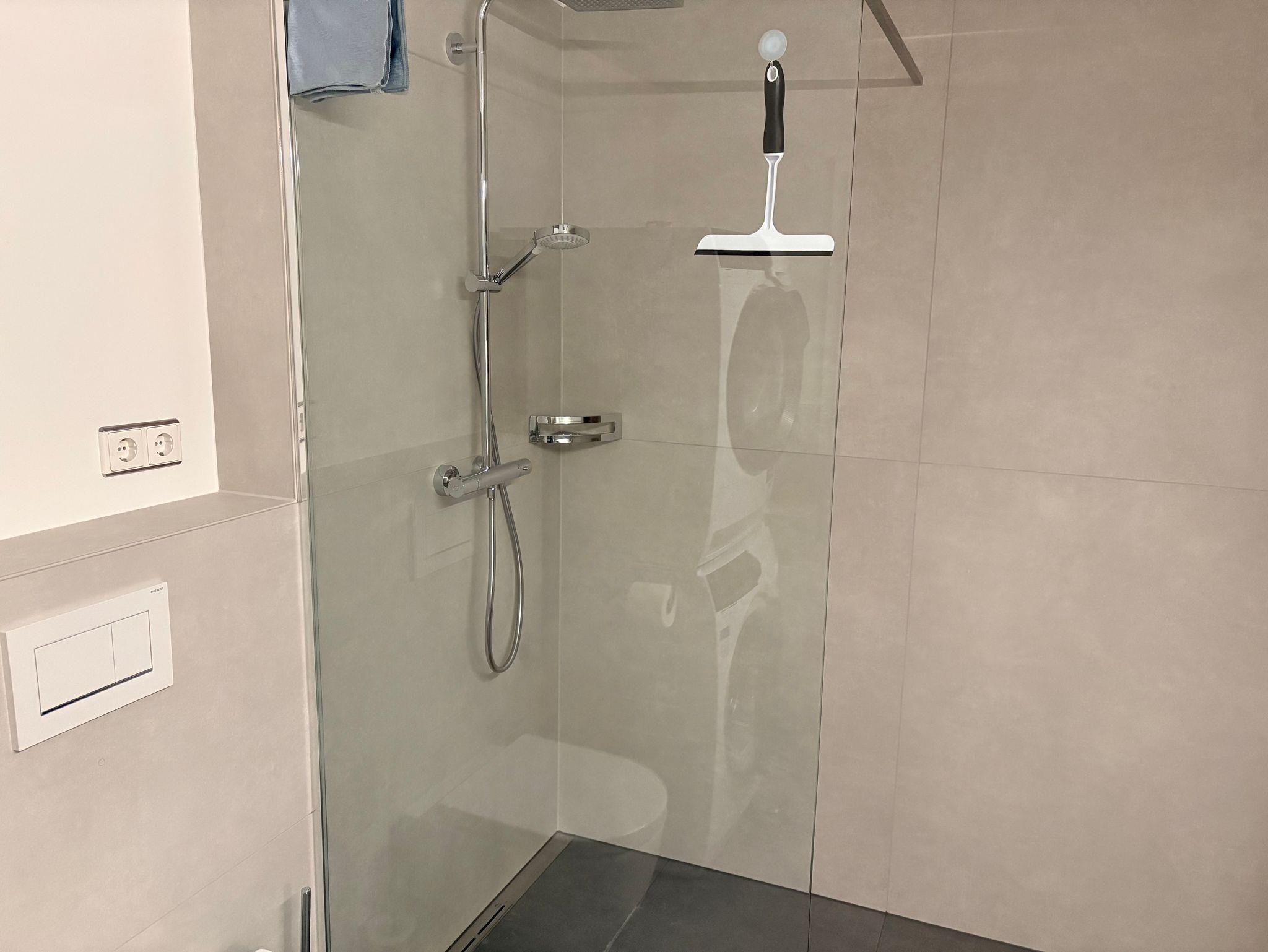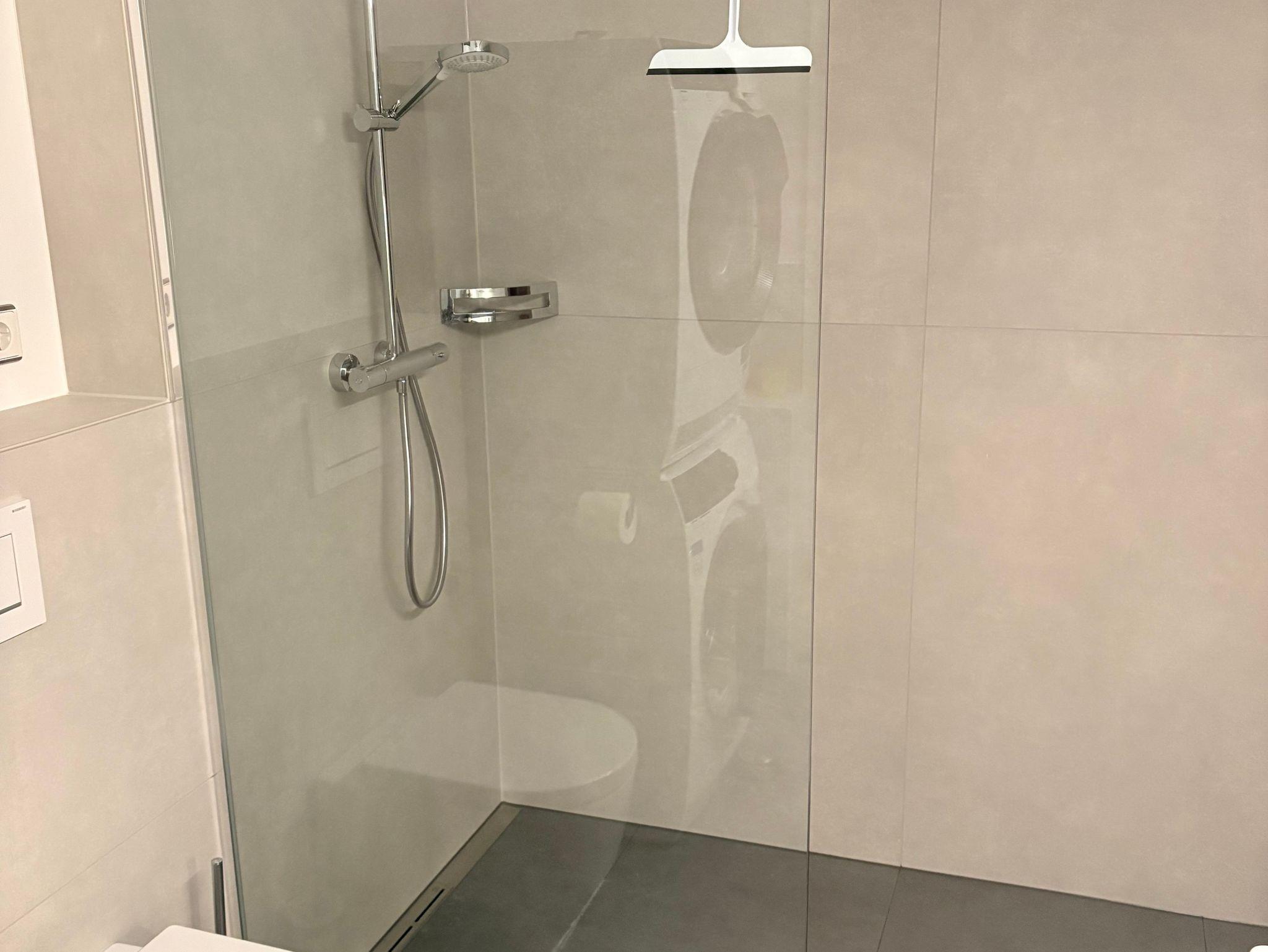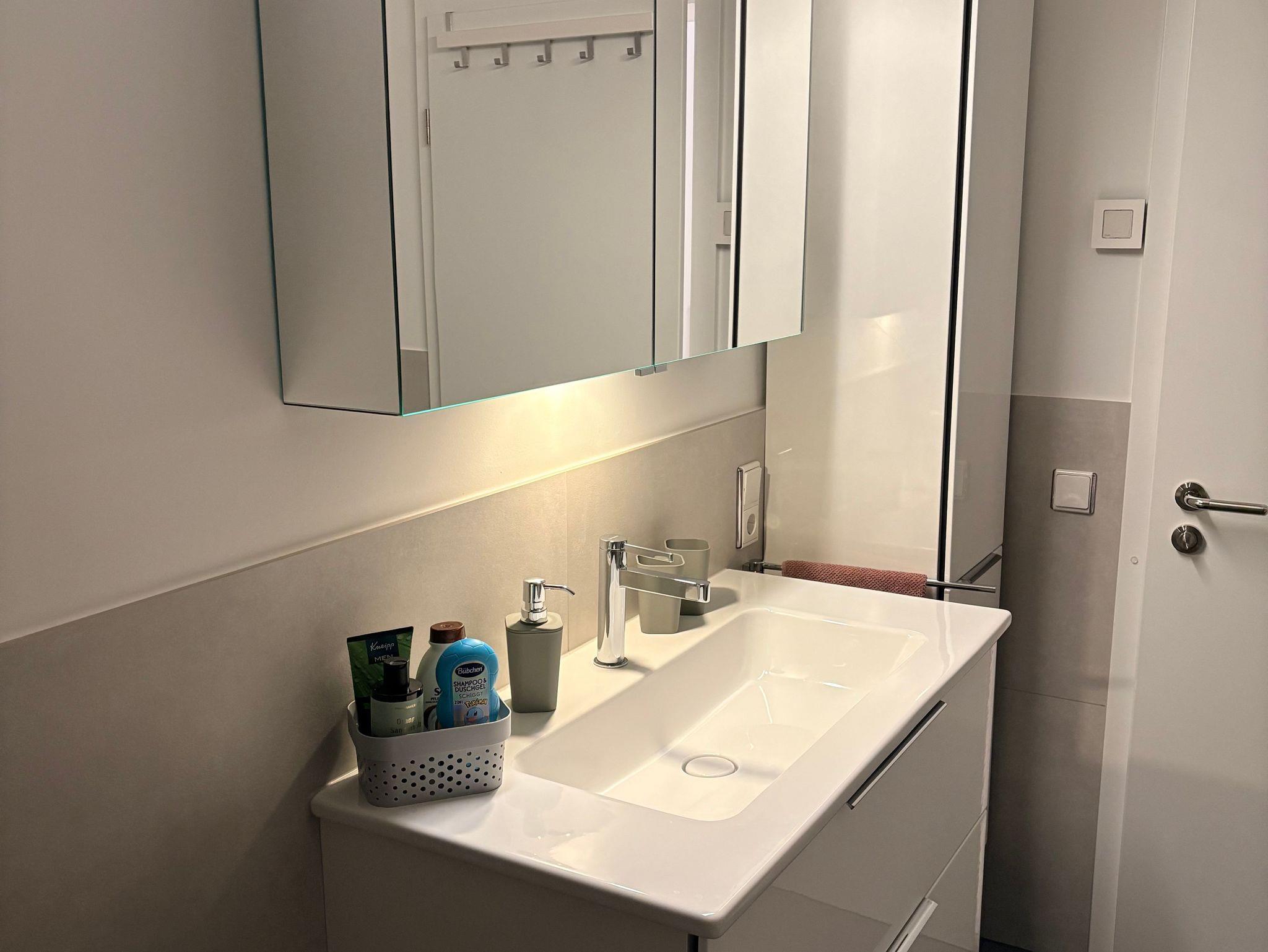 • Luxusbad mit begehbarer Dusche, Spiegelschrank, Waschmaschine und Trockner
