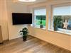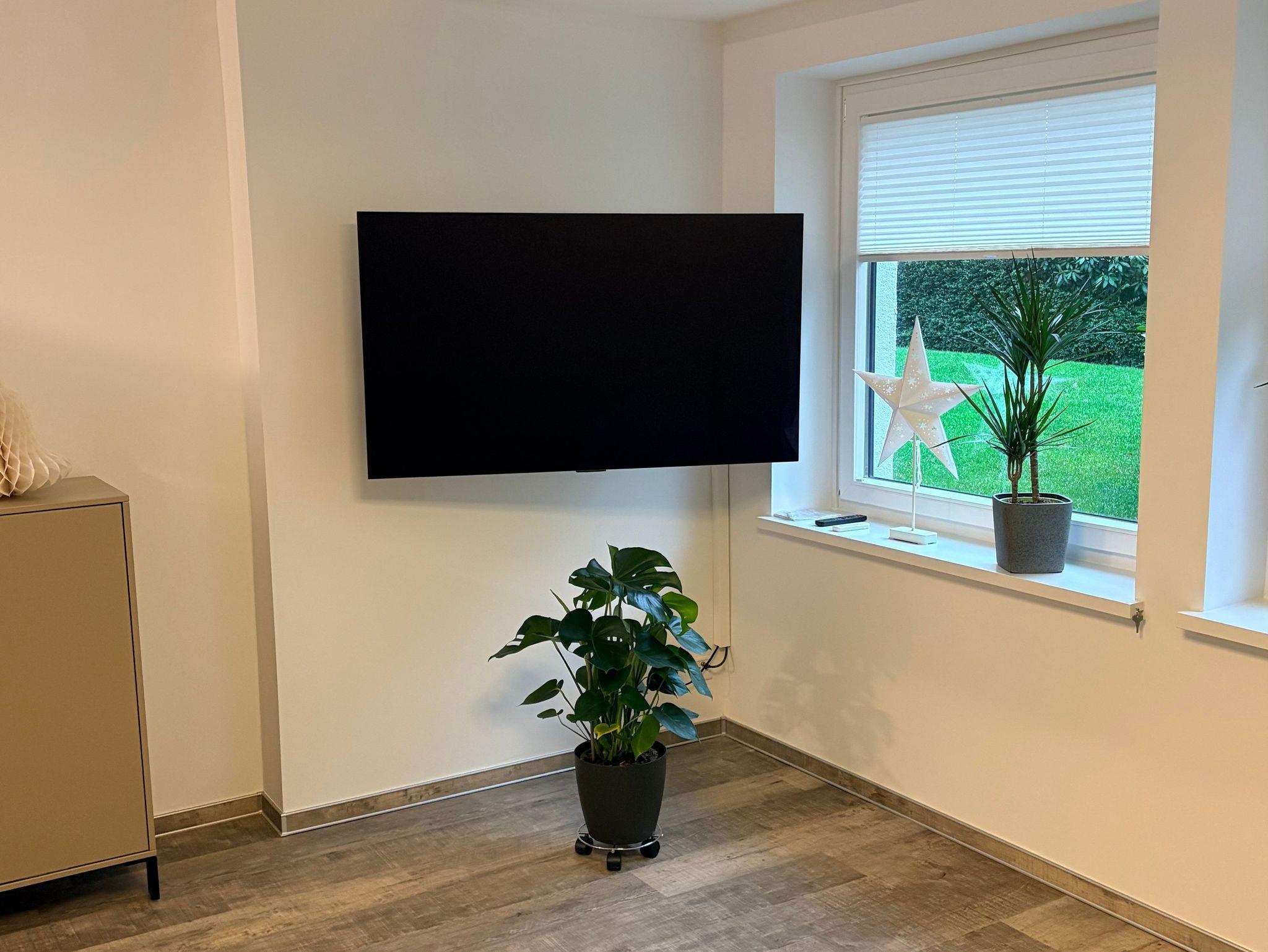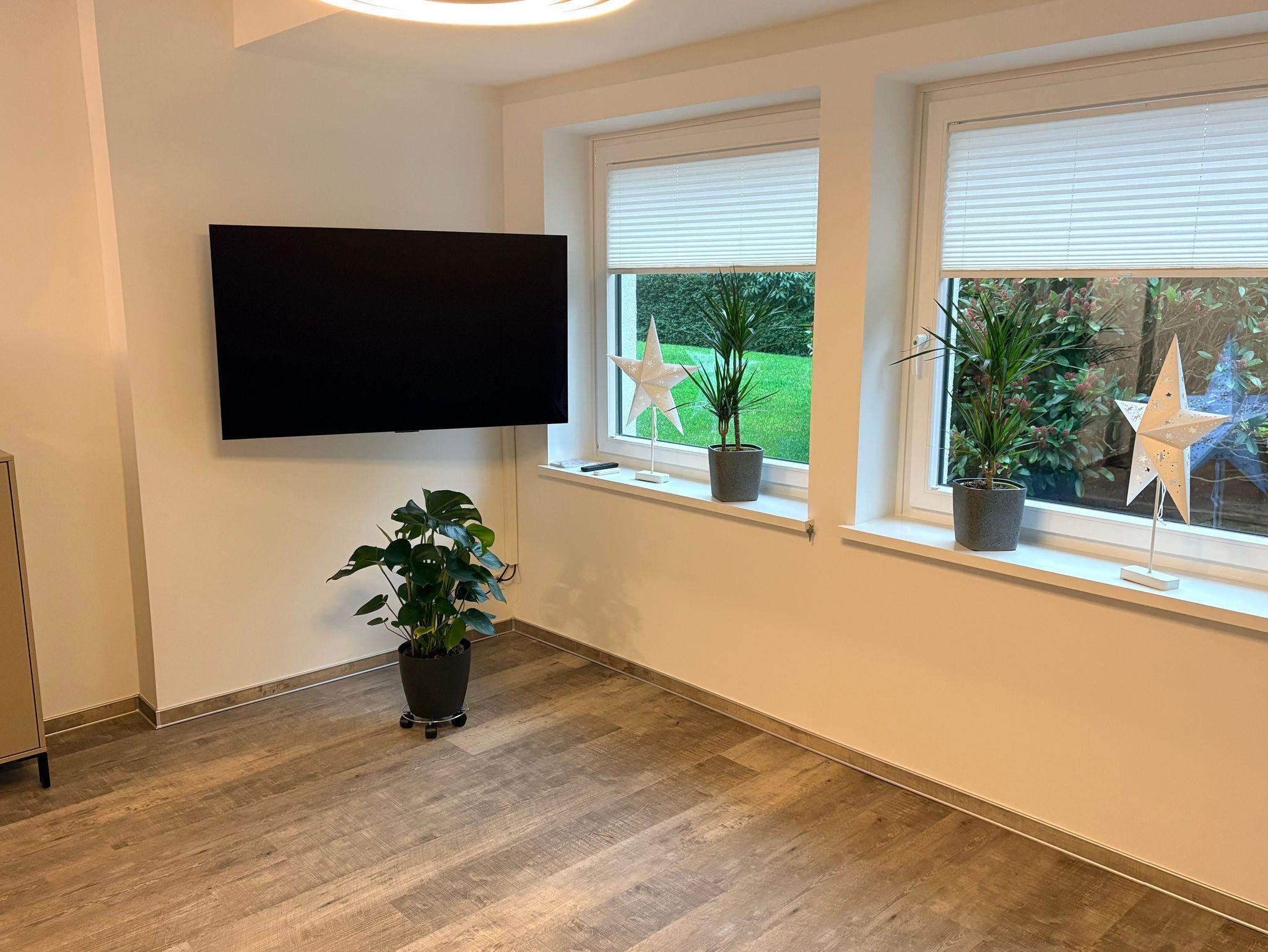 Wohnzimmer zum Garten mit Flachbild-TV mit eigener Satelitenschüssel, HD-Karte und OLED-Bildtechnik.