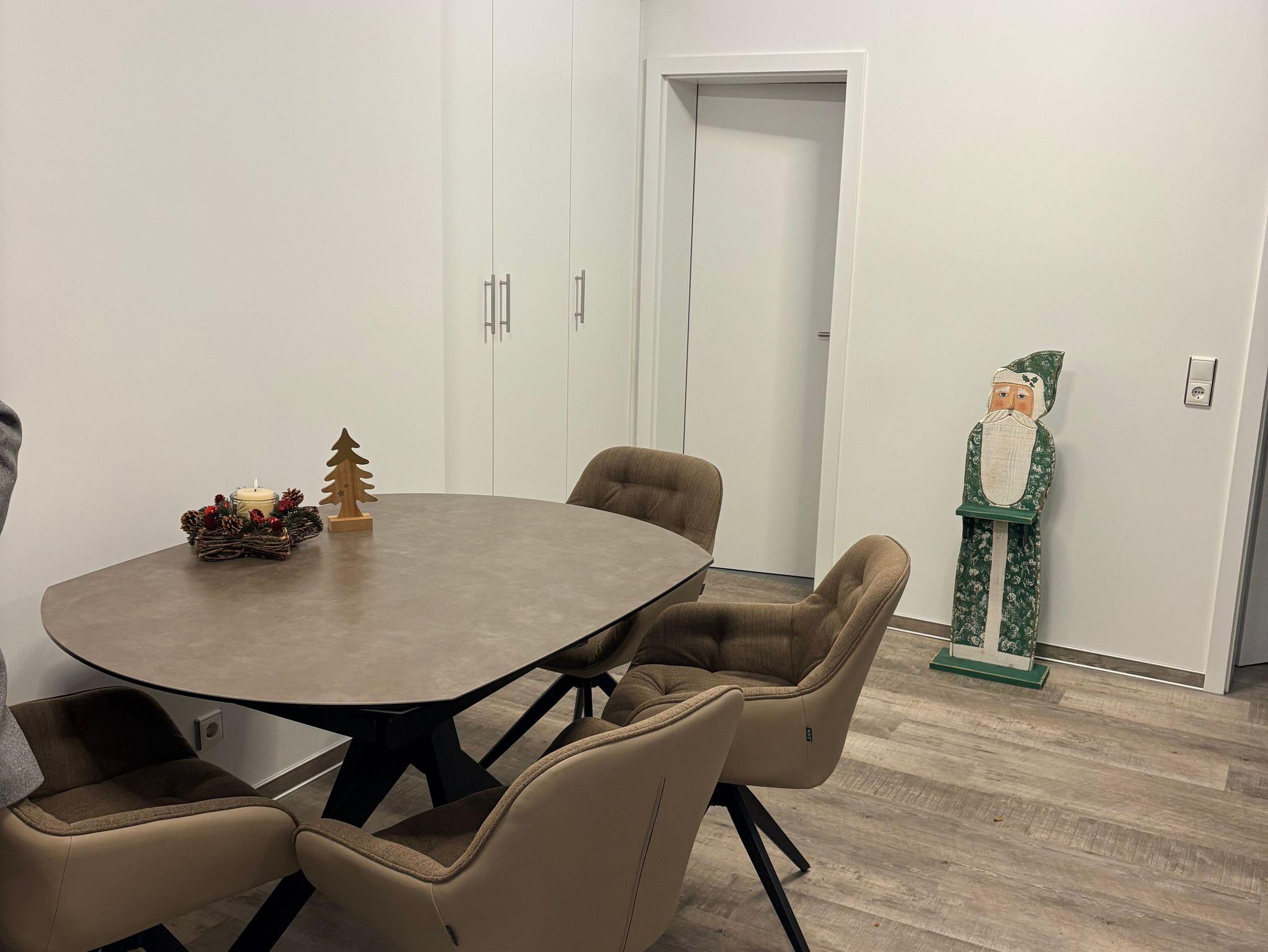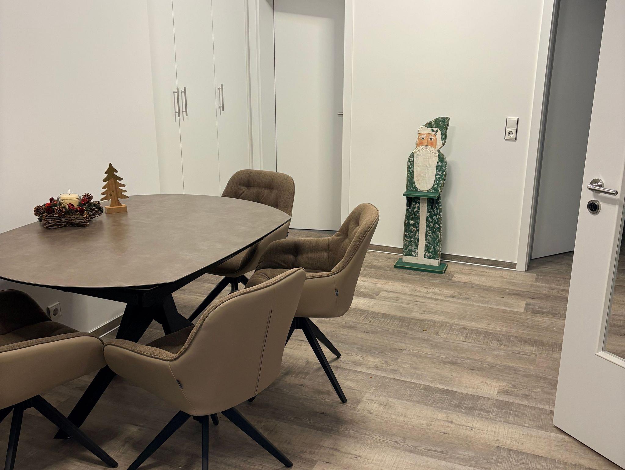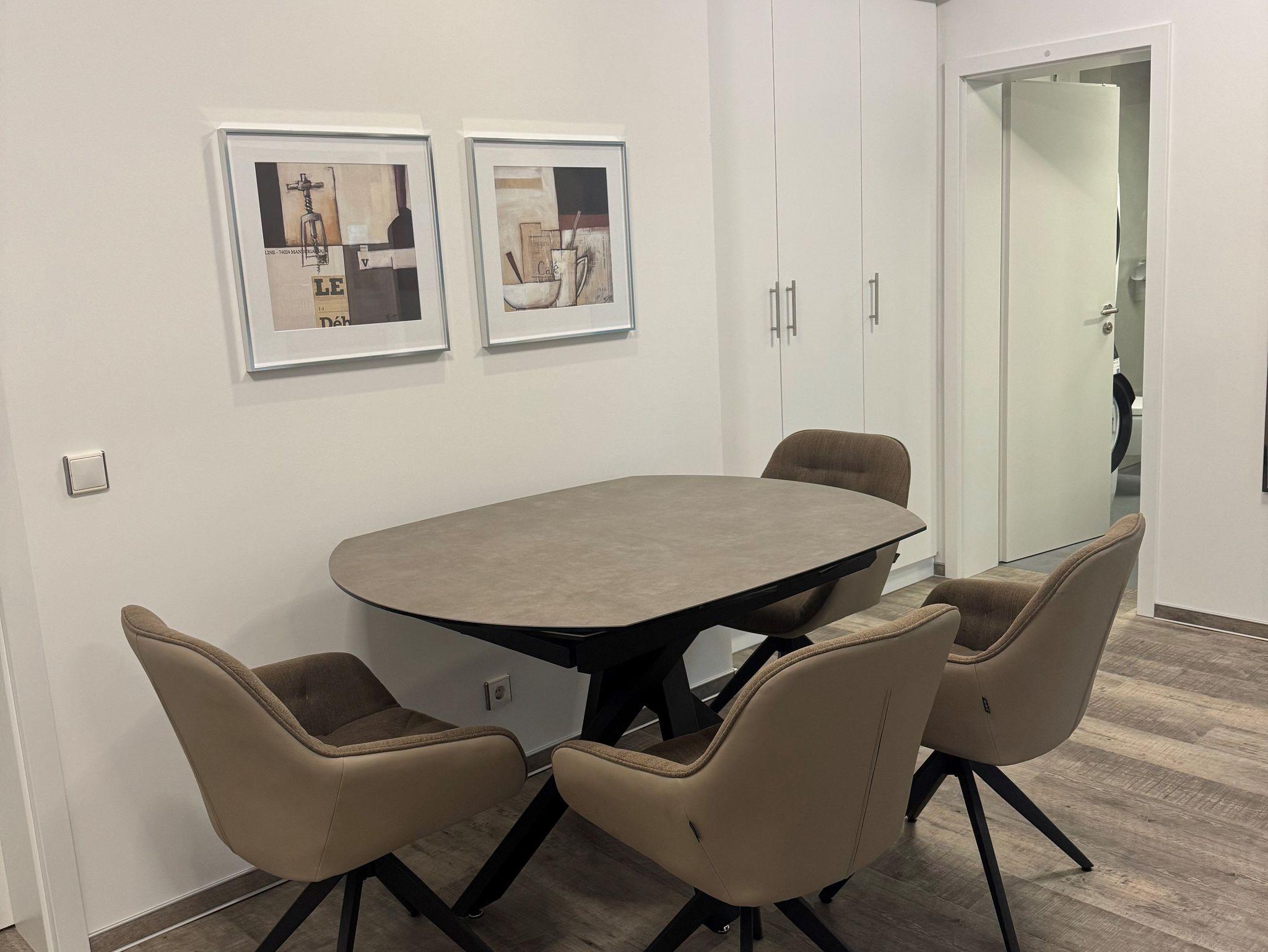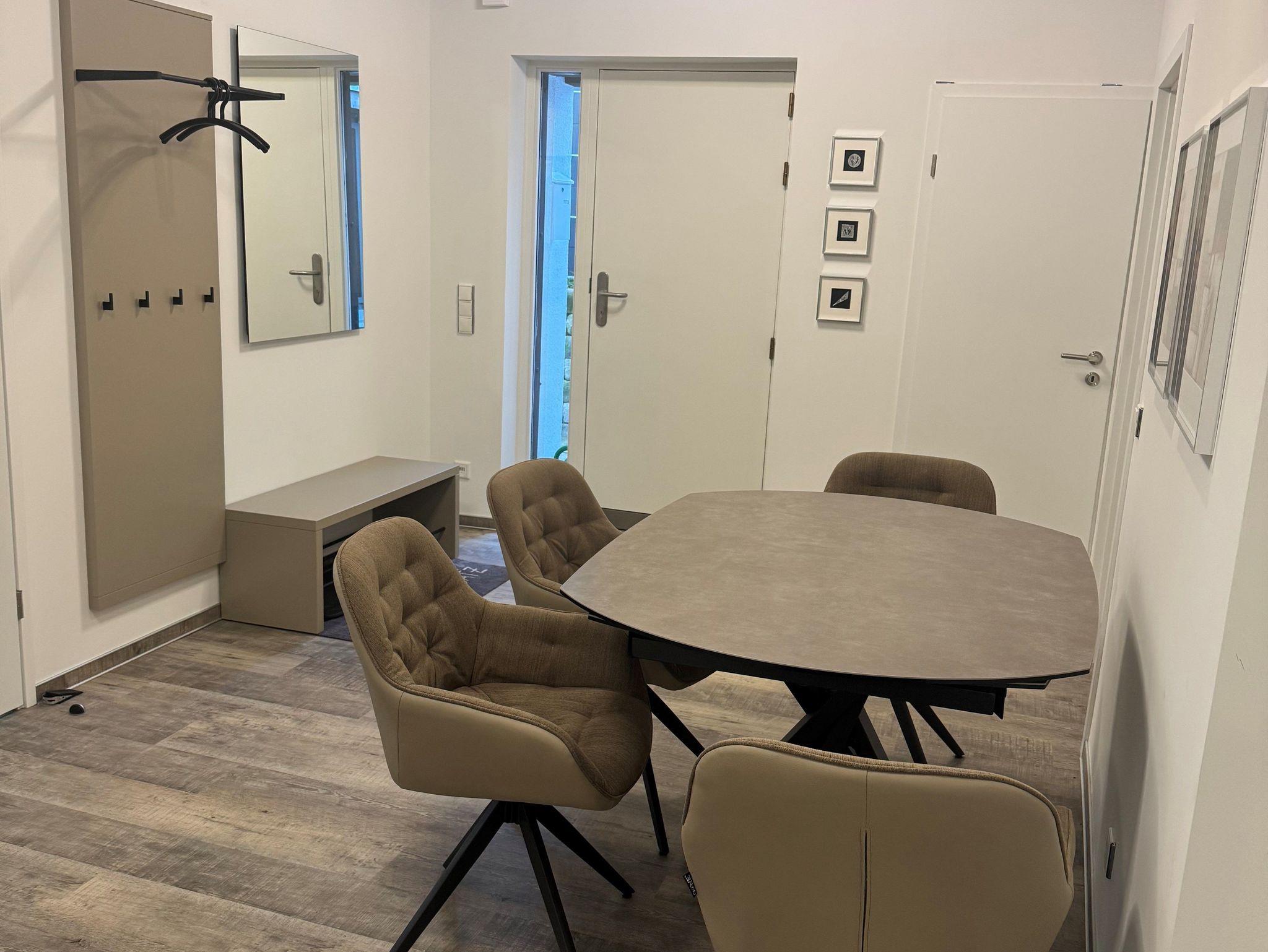 Im lichtdurchfluteten Flur variabler Esstisch mit bequemen Stühlen und guter Arbeitsmöglichkeit bei kostenlosem WLAN mit Glasfaser-Anschluß.