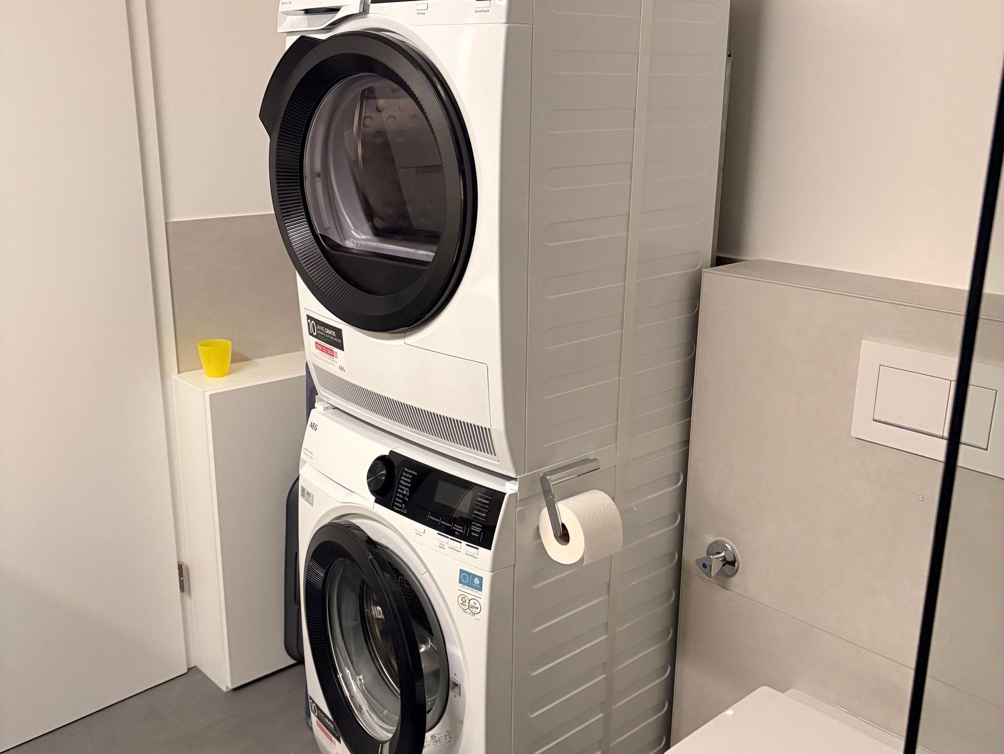 Luxusbad mit begehbarer Dusche, Waschmachine, Trockner sowie Spiegelschrank.