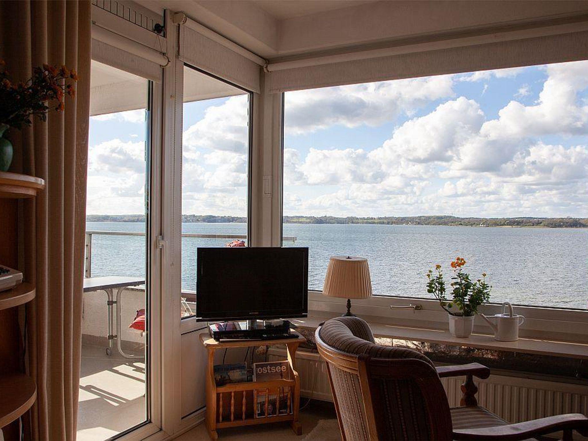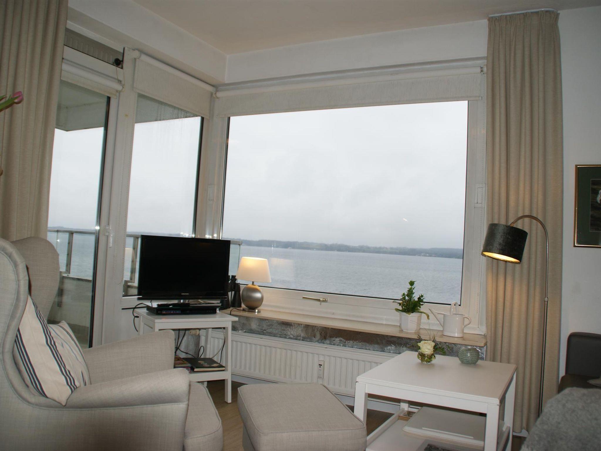 Unsere sehr gepflegte Ferienwohnung *** befindet sich in der 5. Etage (Fahrstuhl) eines Mehrparteienhauses direkt an der Flensburger Förde.