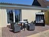 • sonnige Terrasse mit Gartenmöbeln und Strandkorb