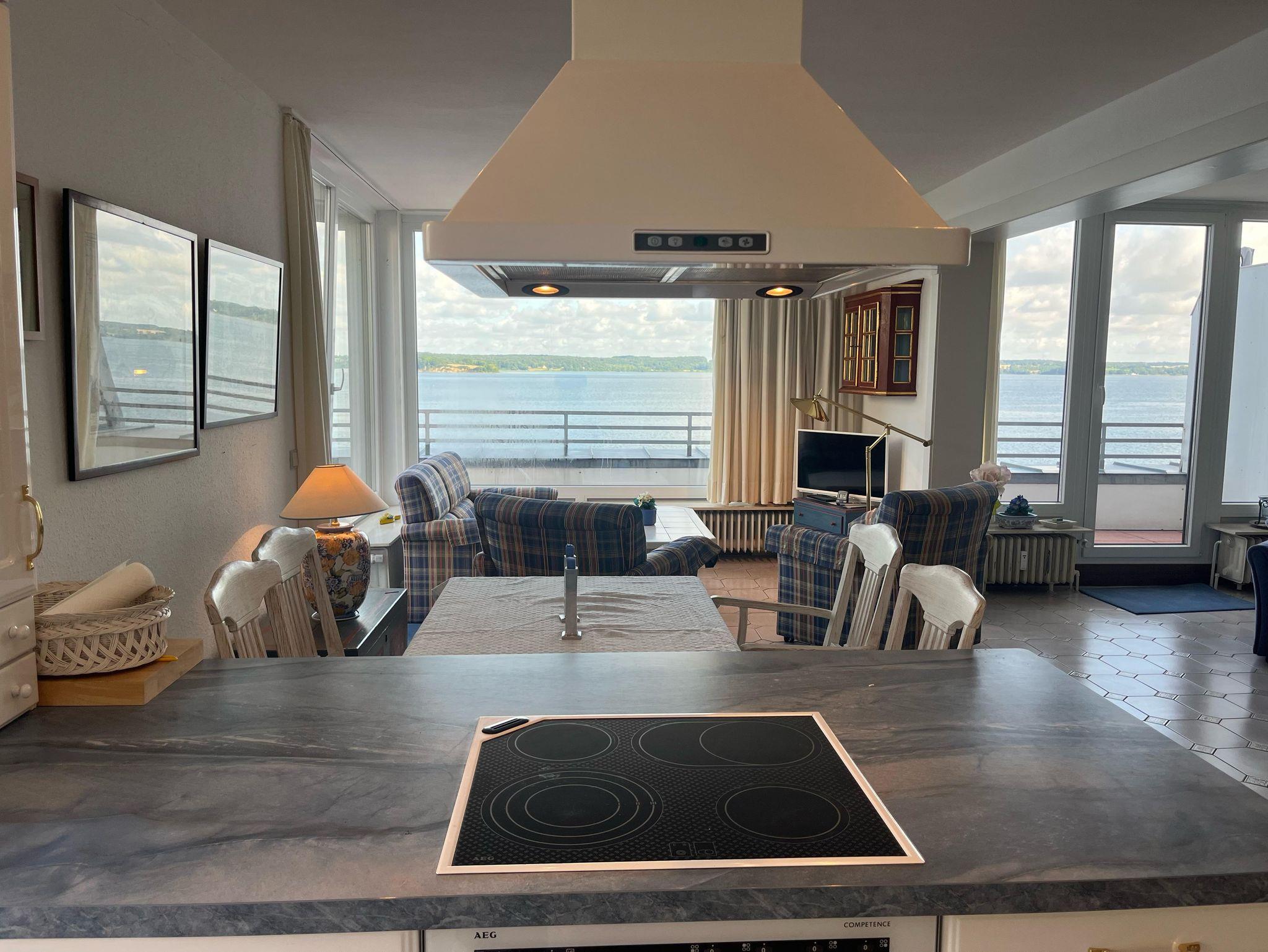 Die Schlafzimmer sind gemütlich eingerichtet, eins davon mit Doppelbett, das andere mit einem Queensize Bett (140x200 cm) für bis zu zwei Personen und eigenem Balkon. Alternativ gibt es im Wohnzimmer ein Schrankbett für eine Person. In der Küche und dem übergehenden Wohnzimmer haben Sie einen herrlichen Blick direkt auf die Flensburger Förde. Der angrenzende Rundum-Balkon bietet genug Platz um zu entspannen oder die Aussicht zu genießen.