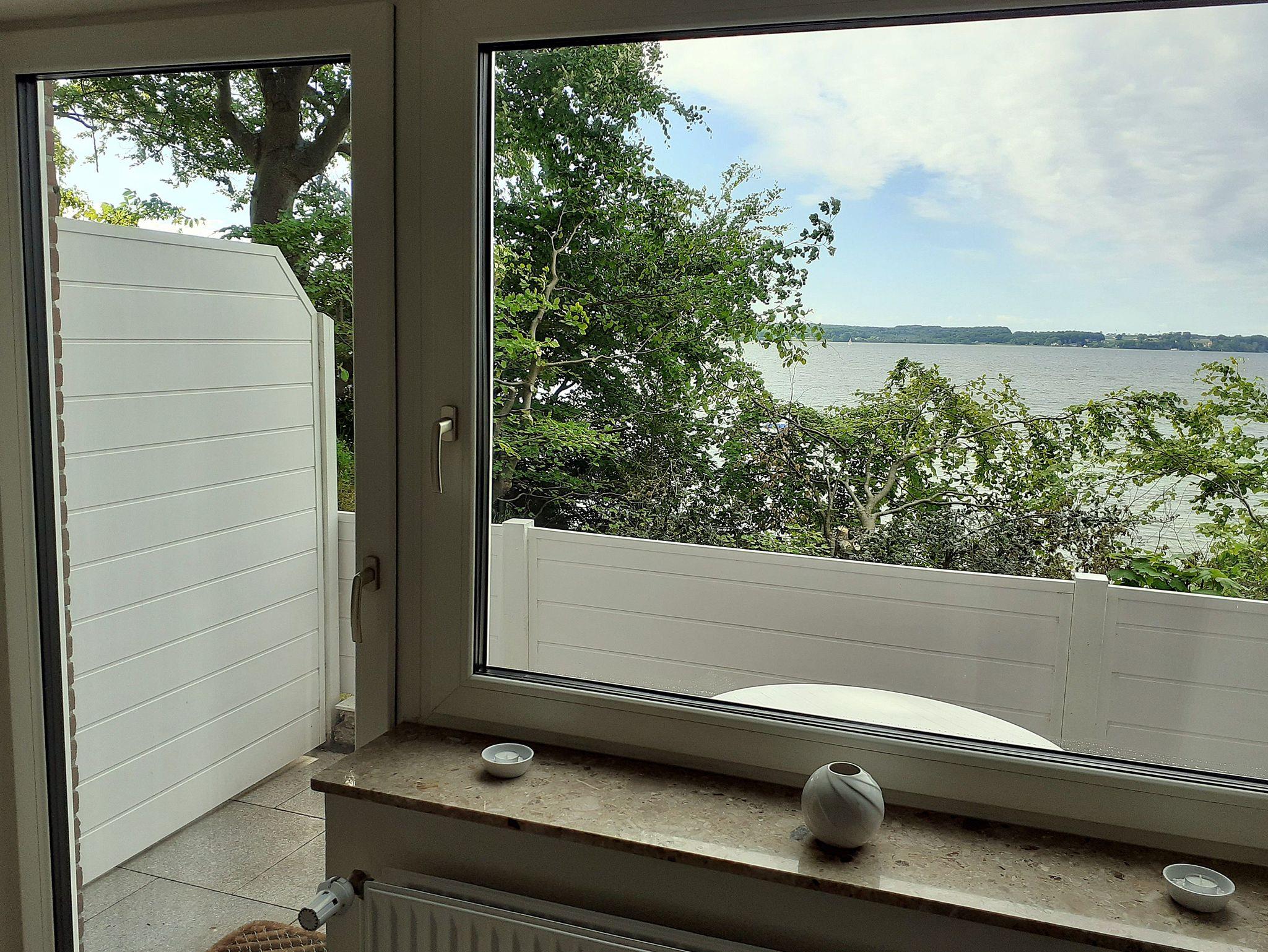 Das Appartement liegt zur Meerseite im Erdgeschoss des Hauses. Es verfügt über eine Terrasse mit direktem Blick auf die Förde, ein innenliegendes Badezimmer mit Dusche, ein Wohnzimmer mit Couch, Schrankbett (90cmx1,90 cm) sowie einem Schreib-/Esstisch. Im Wohnzimmer befindet sich zudem ein Bistro-Vitrinenschrank. Dieser ist ausgestattet mit einer Spüle, Kühlschrank, Filterkaffeemaschine, Wasserkocher, Toaster und Mikrowelle.