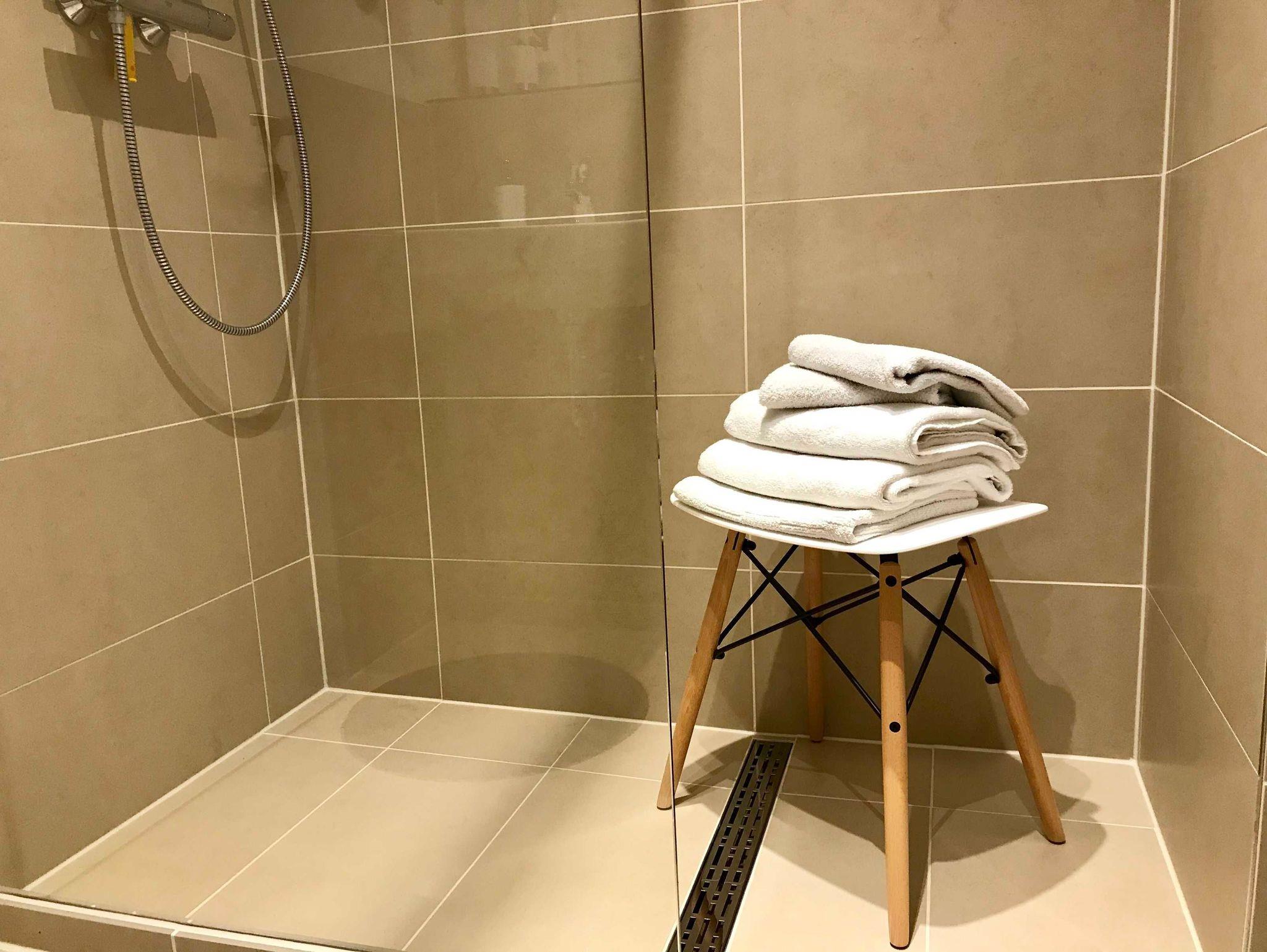 Das moderne und neuwertige Badezimmer inklusive Toilette bietet eine ebenerdige Dusche, einen Handtuchwärmer, einen Fön, einen großen Spiegel und einen kleinen Kosmetikspiegel.