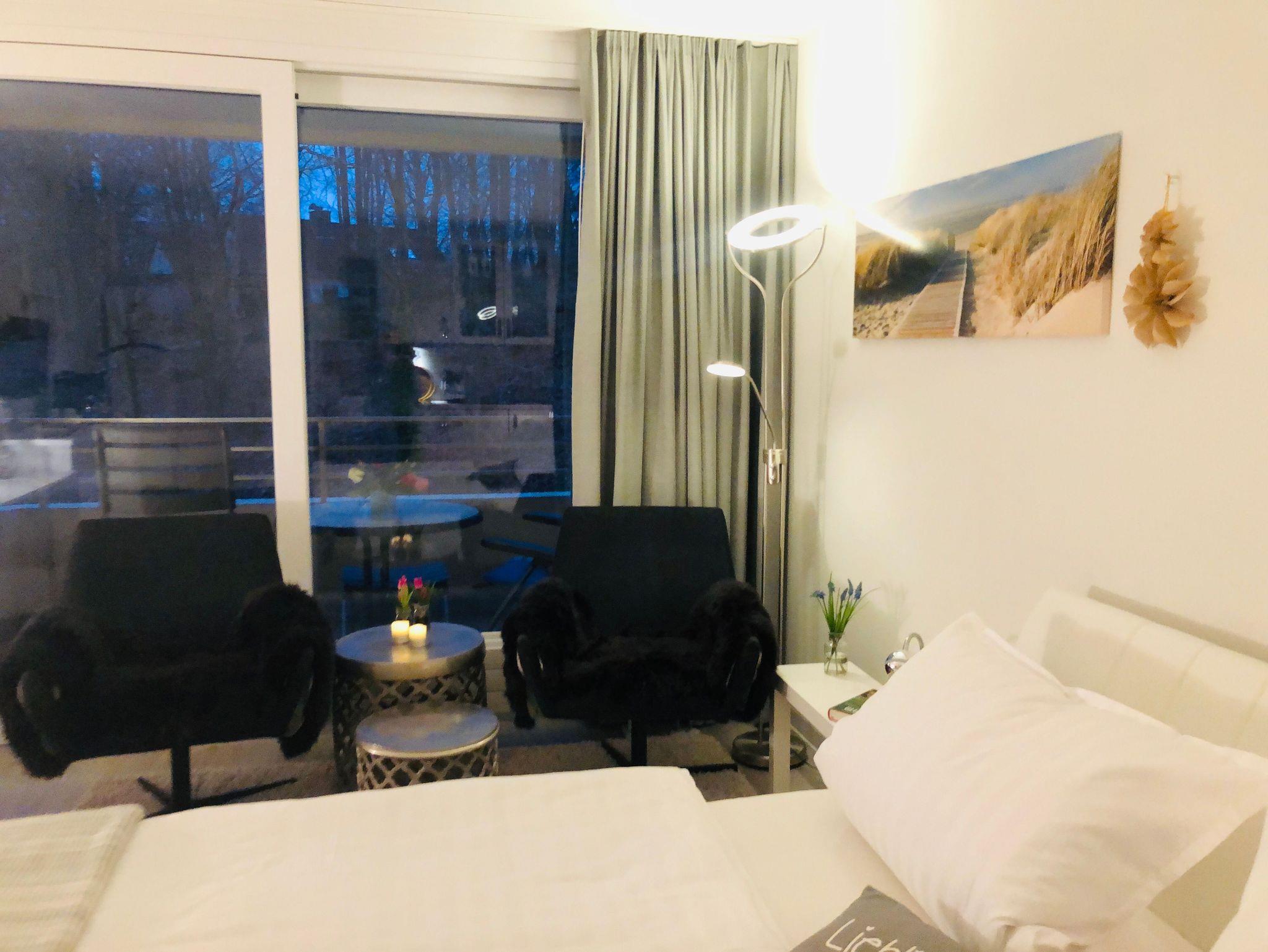 Das sonnenseitige 1-Zimmerappartement mit schönem Balkon befindet sich im 3. Stock des Hotel Intermar mit Blick ins Grüne. In wenigen Schritten erreicht man den Kurstrand, Wanderwege und die Fördeland Therme.