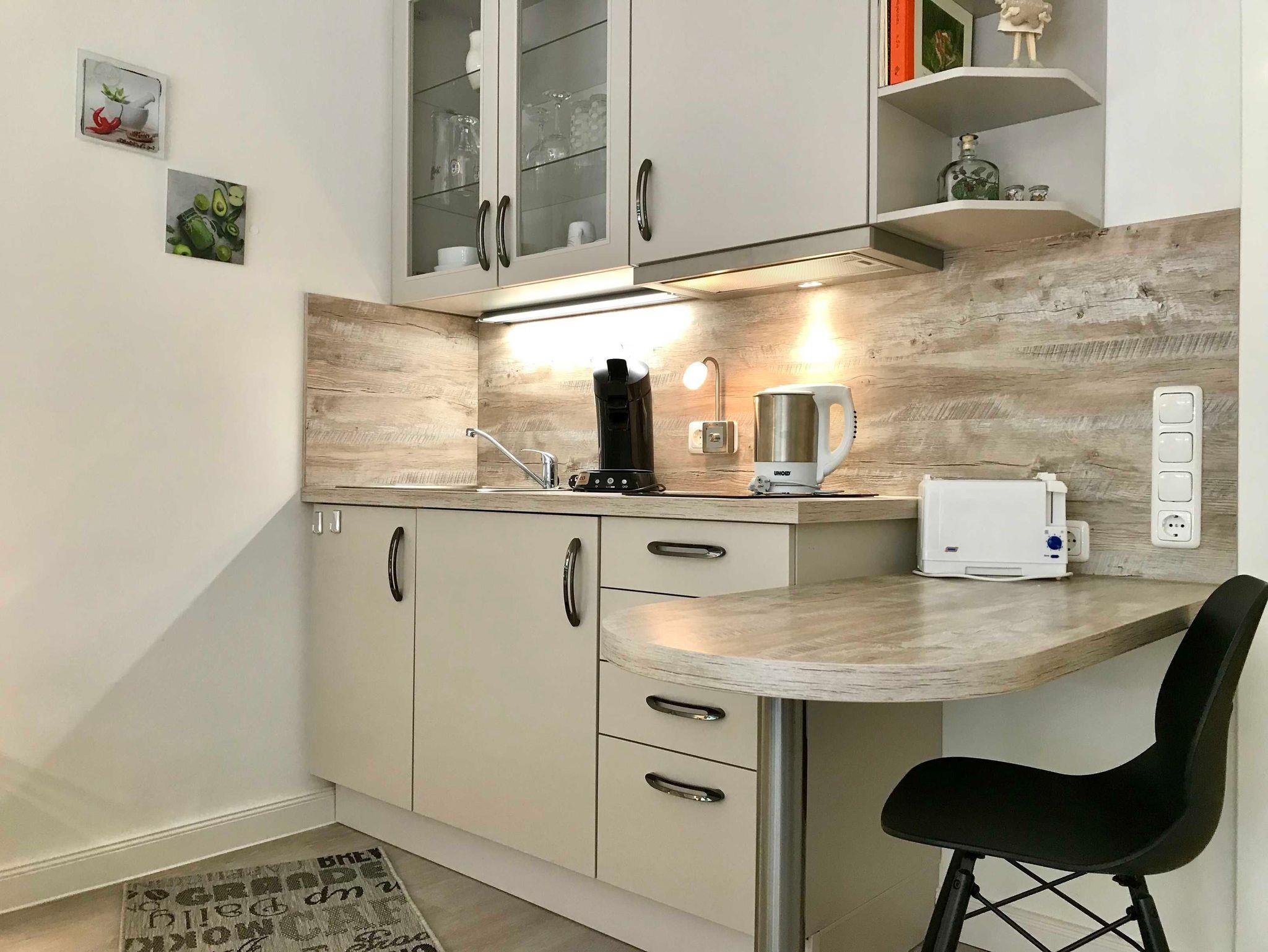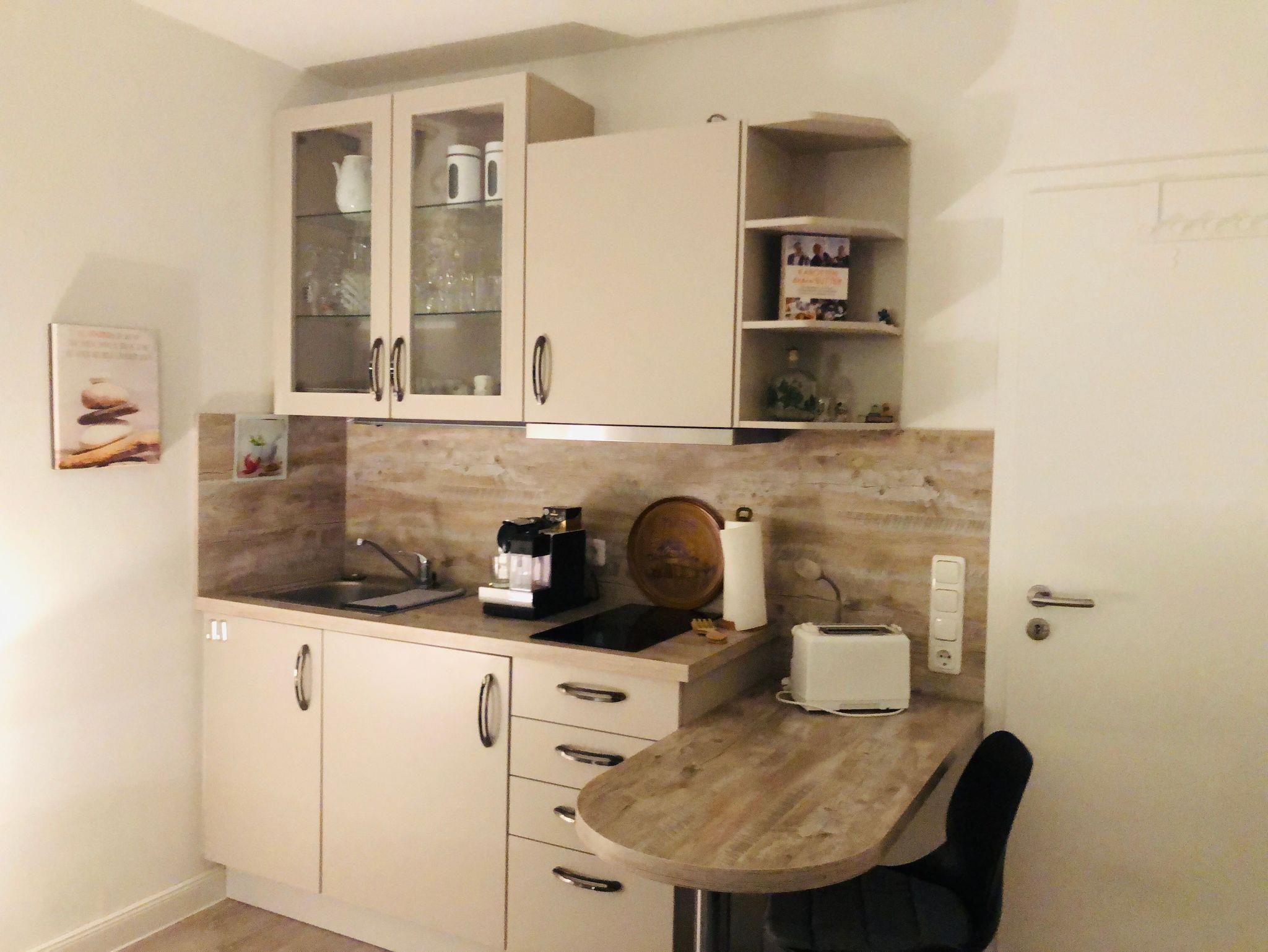 • Küchenzeile mit Kaffeemaschinen, Wasserkocher, Toaster, Cerankochfeld