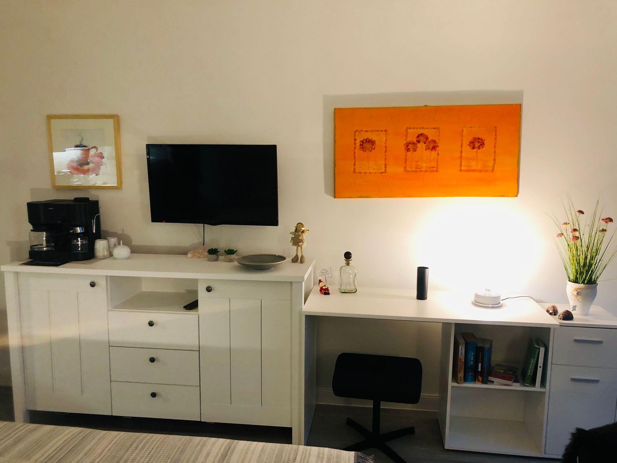 An der Wand gegenüber des Bettes befindet sich ein Flachbildfernseher. WLAN ist vorhanden.