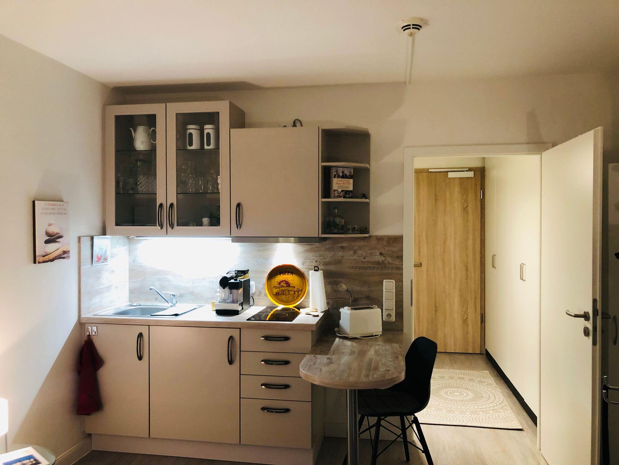 Im Flur befinden sich große Einbauschränke, die viel Stauraum bieten. In einem der Schränke befindet sich außerdem ein Safe. Eine Tür trennt den Flur vom Wohn- und Schlafbereich, in dem sich eine gemütliche und stilvolle Sitzecke, ein großes Doppelbett, ein Essbereich und eine kleine, aber voll ausgestattete Küchenzeile mit Cerankochfeld, Dunstabzugshaube, Kühlschrank, Toaster, Wasserkocher und Kaffeemaschinen (Filter und Kapsel) befindet.