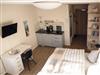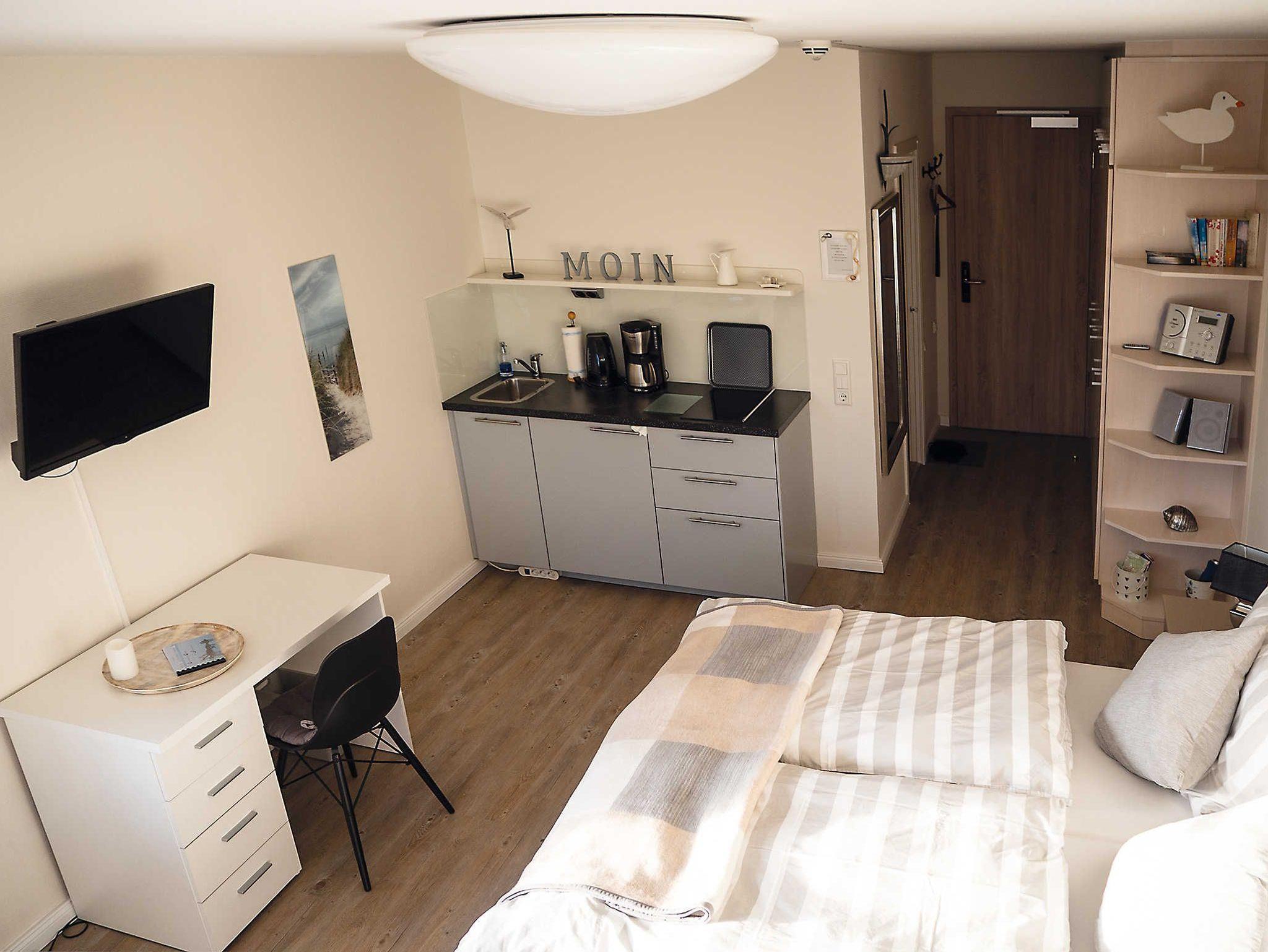 Der behagliche Wohn-Schlafraum mit großem, hochwertigem Doppelbett verfügt über eine kleine Küchenzeile, einen Schreibtisch und einen gemütlichen Sitzbereich.