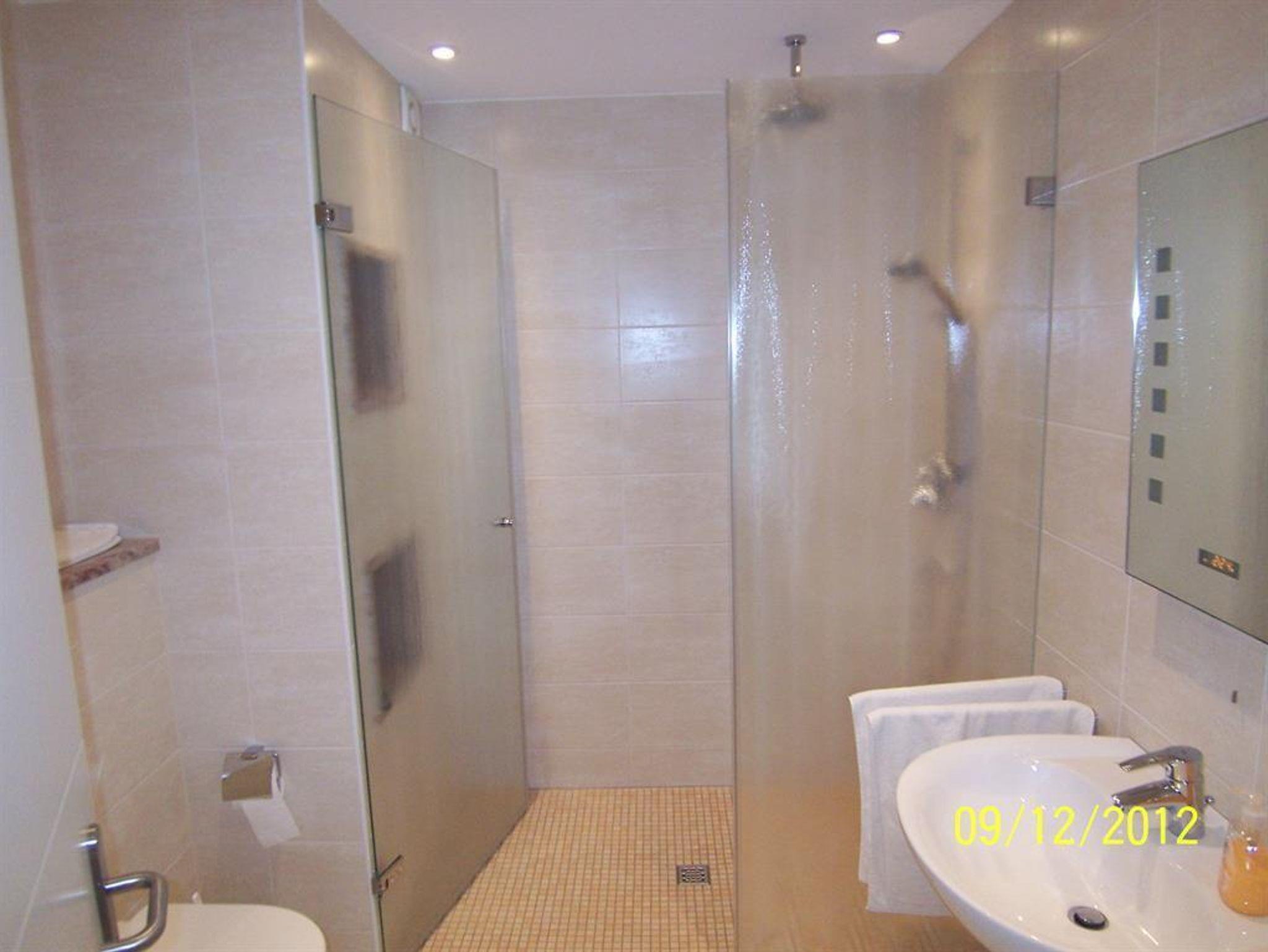 • 1 modernes Bad mit WC, Bidet, Waschtisch und sehr großer verglaster Dusche