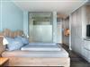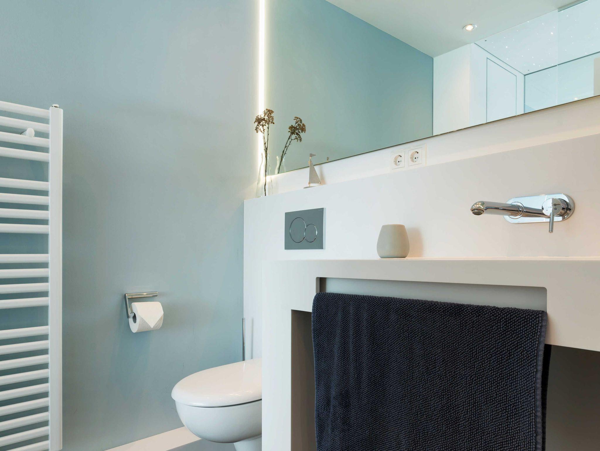 Das Badezimmer ist zum Wohn-/Schlafbereich hin mit einer Glasscheibe (im Mittelteil satiniert) ausgestattet. So hat man selbst beim Duschen Blick auf die Förde. Zusätzlich besitzt die Dusche einen Sternenhimmel aus winzigen Lichtern.