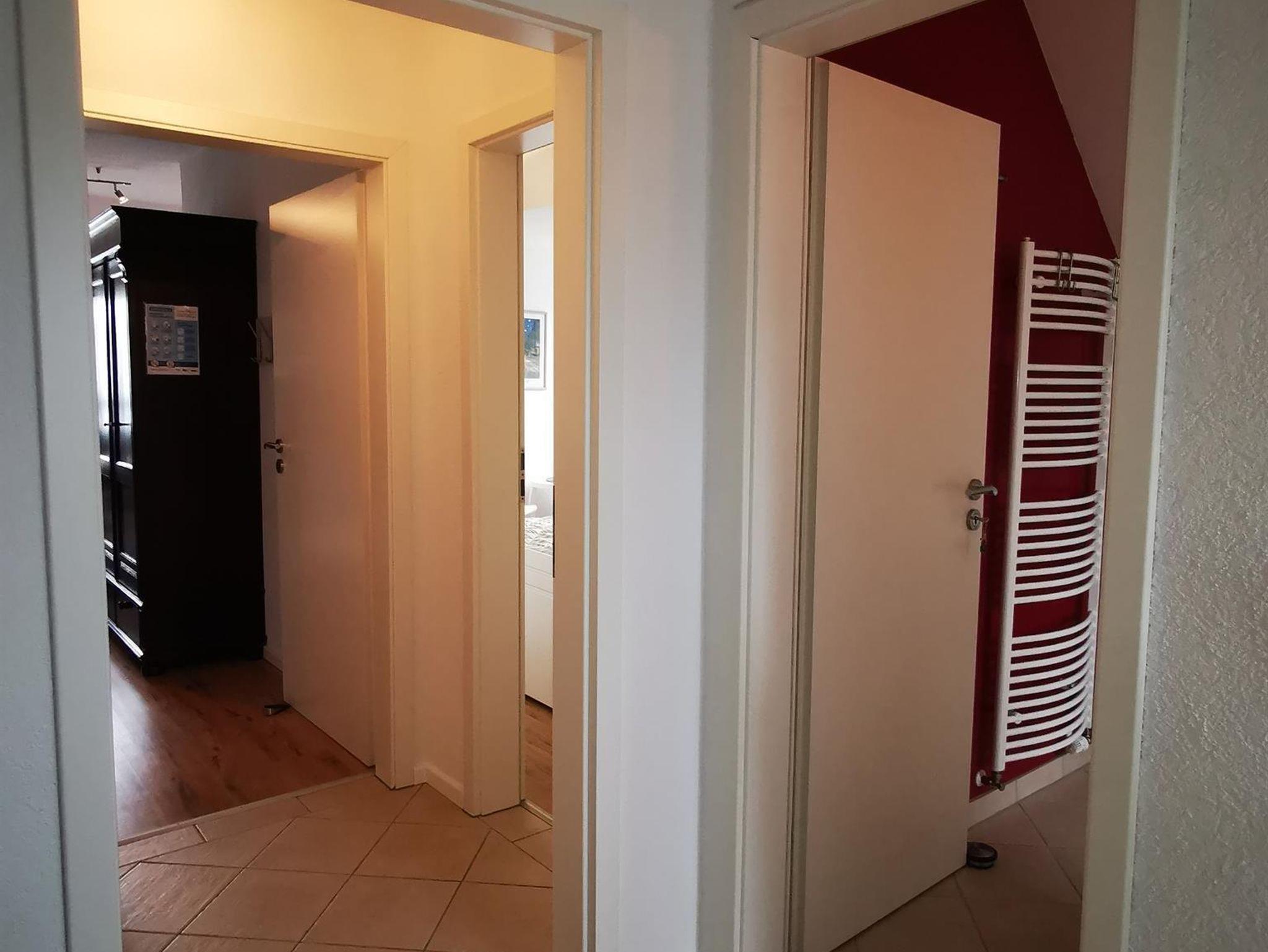 Durch einen gemeinsamen Hauseingang gelangen Sie in den Flur. Der Wohnbereich wird durch eine zusätzliche Zwischentür abgetrennt.