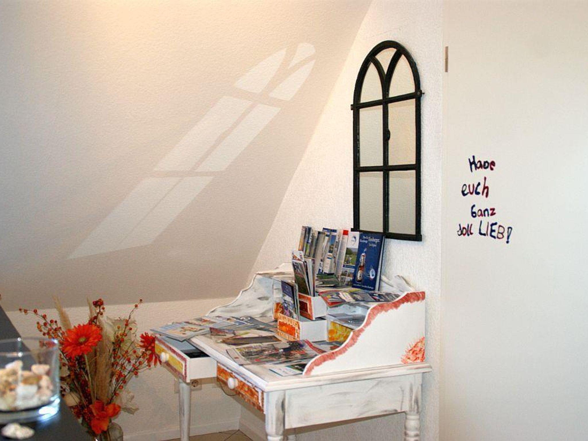 Über eine Treppe gelangen Sie ins Obergeschoss des Einfamilienhauses, der mit einen Vorflur und einer kleinen Infoecke versehen ist.