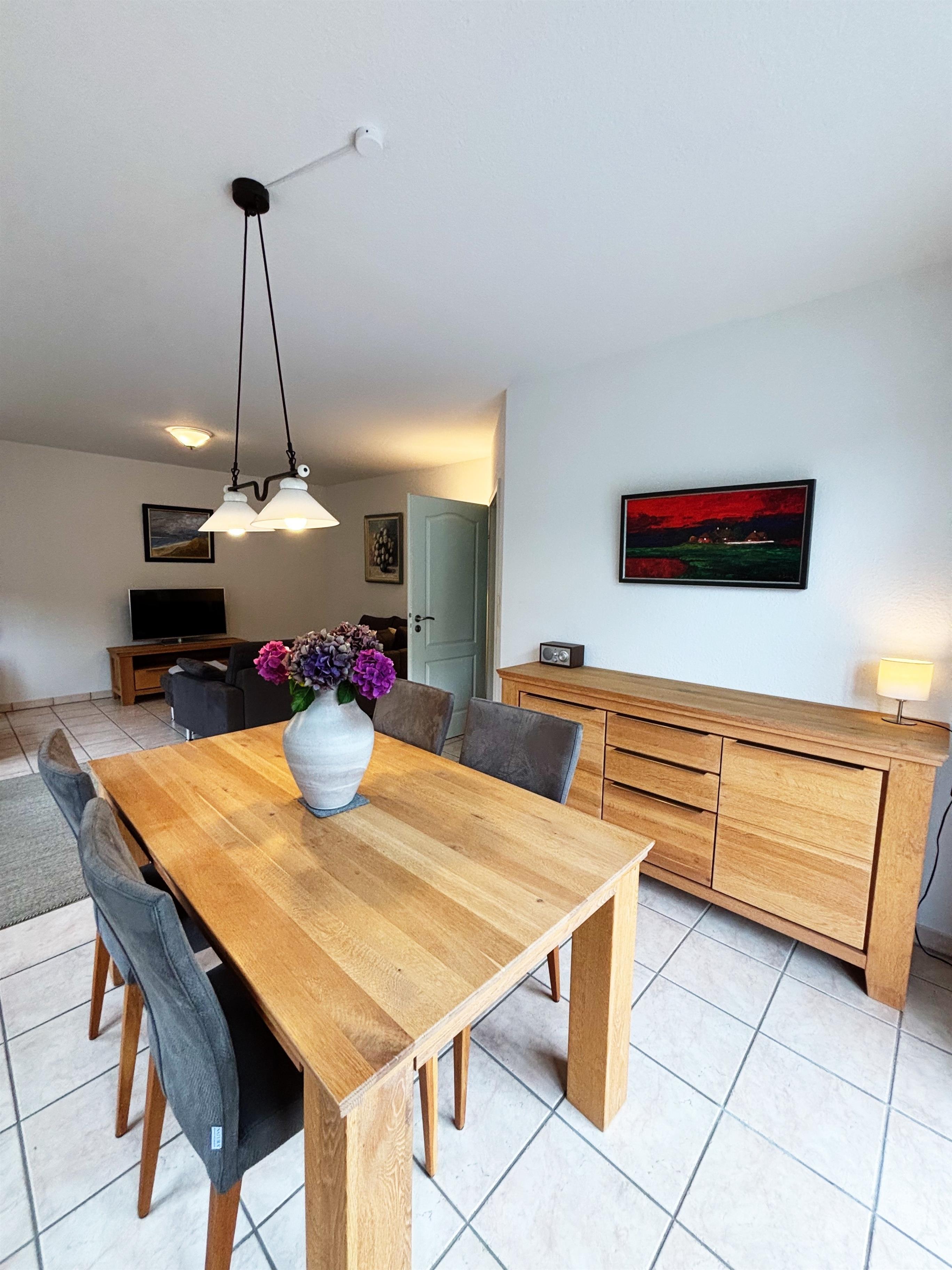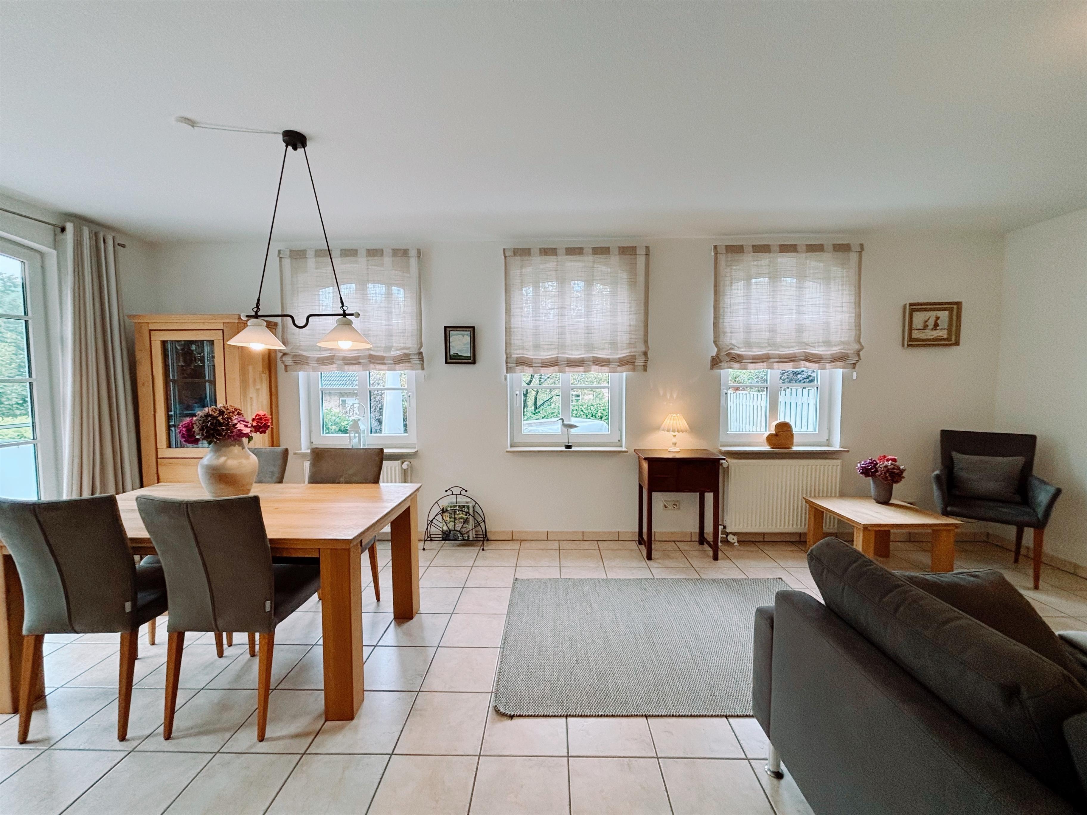 Das Ferienhaus "Pauline" wurde mit viel Liebe zum Detail eingerichtet und bietet auf zwei Stockwerken eine gemütliche und komfortable Atmosphäre. Im Erdgeschoss befindet sich eine großzügige, hell gestaltete Küche, die keine Wünsche offenlässt. Hier können Sie Ihre Lieblingsgerichte in vollen Zügen genießen, während Sie gleichzeitig den Blick auf den Glücksburger Wald schweifen lassen. Die Küche ist mit allen modernen Geräten ausgestattet, darunter ein Herd, ein Backofen, ein Geschirrspüler sowie eine Mikrowelle und ein Kühlschrank, sodass Sie für jeden Anlass bestens gerüstet sind. Direkt neben der Küche befindet sich der Essbereich, der genügend Platz für gemeinsame Mahlzeiten bietet und für eine gesellige Atmosphäre sorgt.